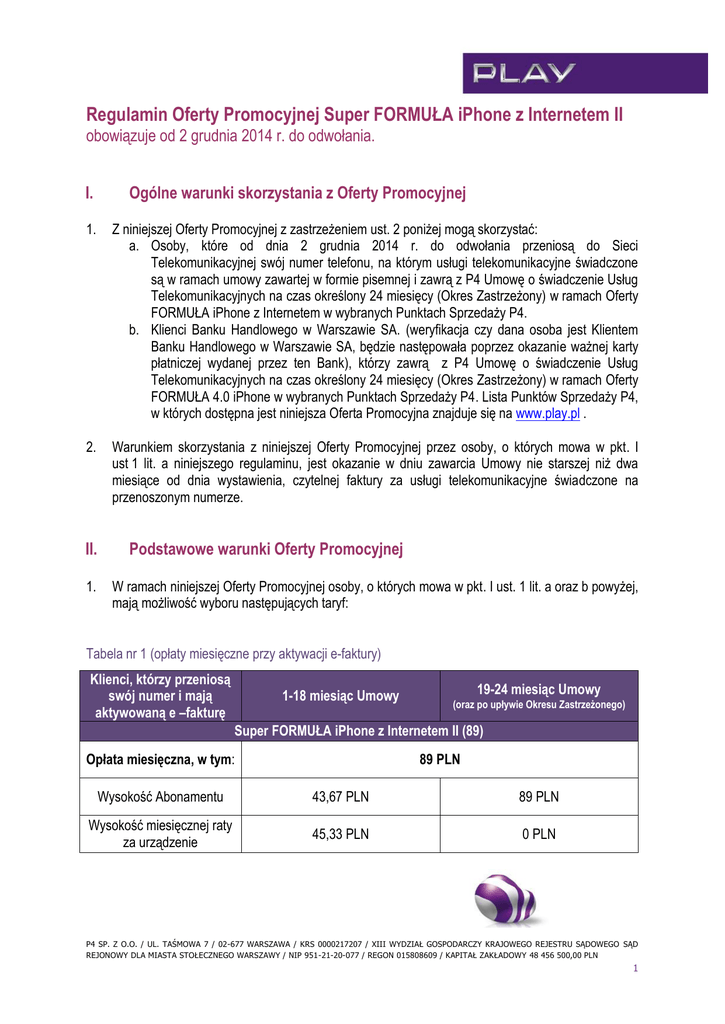 Regulamin Oferty Promocyjnej Super FORMUŁA iPhone z Internetem II obowiązuje od 2 grudnia 2014 r. do odwołania. I. Ogólne warunki skorzystania z Oferty Promocyjnej 1. Z niniejszej Oferty Promocyjnej z zastrzeżeniem ust. 2 poniżej mogą skorzystać: a. Osoby, które od dnia 2 grudnia 2014 r. do odwołania przeniosą do Sieci Telekomunikacyjnej swój numer telefonu, na którym usługi telekomunikacyjne świadczone są w ramach umowy zawartej w formie pisemnej i zawrą z P4 Umowę o świadczenie Usług Telekomunikacyjnych na czas określony 24 miesięcy (Okres Zastrzeżony) w ramach Oferty FORMUŁA iPhone z Internetem w wybranych Punktach Sprzedaży P4. b. Klienci Banku Handlowego w Warszawie SA. (weryfikacja czy dana osoba jest Klientem Banku Handlowego w Warszawie SA, będzie następowała poprzez okazanie ważnej karty płatniczej wydanej przez ten Bank), którzy zawrą z P4 Umowę o świadczenie Usług Telekomunikacyjnych na czas określony 24 miesięcy (Okres Zastrzeżony) w ramach Oferty FORMUŁA 4.0 iPhone w wybranych Punktach Sprzedaży P4. Lista Punktów Sprzedaży P4, w których dostępna jest niniejsza Oferta Promocyjna znajduje się na www.play.pl . 2. Warunkiem skorzystania z niniejszej Oferty Promocyjnej przez osoby, o których mowa w pkt. I ust 1 lit. a niniejszego regulaminu, jest okazanie w dniu zawarcia Umowy nie starszej niż dwa miesiące od dnia wystawienia, czytelnej faktury za usługi telekomunikacyjne świadczone na przenoszonym numerze. II. 1. Podstawowe warunki Oferty Promocyjnej W ramach niniejszej Oferty Promocyjnej osoby, o których mowa w pkt. I ust. 1 lit. a oraz b powyżej, mają możliwość wyboru następujących taryf: Tabela nr 1 (opłaty miesięczne przy aktywacji e-faktury) Klienci, którzy przeniosą swój numer i mają aktywowaną e –fakturę 1-18 miesiąc Umowy 19-24 miesiąc Umowy (oraz po upływie Okresu Zastrzeżonego) Super FORMUŁA iPhone z Internetem II (89) Opłata miesięczna, w tym: 89 PLN Wysokość Abonamentu 43,67 PLN 89 PLN Wysokość miesięcznej raty za urządzenie 45,33 PLN 0 PLN P4 SP. Z O.O. / UL. TAŚMOWA 7 / 02-677 WARSZAWA / KRS 0000217207 / XIII WYDZIAŁ GOSPODARCZY KRAJOWEGO REJESTRU SĄDOWEGO SĄD REJONOWY DLA MIASTA STOŁECZNEGO WARSZAWY / NIP 951-21-20-077 / REGON 015808609 / KAPITAŁ ZAKŁADOWY 48 456 500,00 PLN 1 Super FORMUŁA iPhone z Internetem II (109) Opłata miesięczna, w tym: 109 PLN Wysokość Abonamentu 37 PLN 109 PLN Wysokość miesięcznej raty za urządzenie 72 PLN 0 PLN Tabela nr 2 (opłaty miesięczne bez aktywacji e-faktury) Klienci, którzy przeniosą swój numer i nie mają aktywowanej e –faktury 1-18 miesiąc Umowy 19-24 miesiąc Umowy (oraz po upływie Okresu Zastrzeżonego) Super FORMUŁA iPhone z Internetem II (89) Opłata miesięczna, w tym: 94 PLN Wysokość Abonamentu 48,67 PLN 94 PLN Wysokość miesięcznej raty za urządzenie 45,33 PLN 0 PLN Super FORMUŁA iPhone z Internetem II (109) Opłata miesięczna, w tym: 114 PLN Wysokość Abonamentu 42 PLN 114 PLN Wysokość miesięcznej raty za urządzenie 72 PLN 0 PLN 2. 3. Kwoty wskazane w Tabelach nr 1 i nr 2 powyżej uwzględniają rabaty na abonament naliczane na zasadach określonych w pkt. III poniżej. Dodatkowo, w ramach niniejszej Oferty Promocyjnej: a) Abonent otrzymuje Bezpłatną usługę „Pakiet Internet 1 GB” na zasadach określonych w pkt. IV niniejszej Oferty Promocyjnej oraz usługę „Darmowy Internet LTE”, zgodnie z zasadami opisanymi w pkt V niniejszej Oferty Promocyjnej; b) Abonent otrzymuje możliwość korzystania z usługi „Muzyka na czekanie” na zasadach opisanych w pkt. III ust 6 niniejszego regulaminu; c) Opłata aktywacyjna wynosi 49 PLN. 4. Osobom zawierającym Umowę w ramach niniejszej Oferty Promocyjnej, przysługuje prawo do zakupu Telefonu w cenie określonej, w aktualnym na dzień zawierania Umowy Cenniku Telefonów P4 SP. Z O.O. / UL. TAŚMOWA 7 / 02-677 WARSZAWA / KRS 0000217207 / XIII WYDZIAŁ GOSPODARCZY KRAJOWEGO REJESTRU SĄDOWEGO SĄD REJONOWY DLA MIASTA STOŁECZNEGO WARSZAWY / NIP 951-21-20-077 / REGON 015808609 / KAPITAŁ ZAKŁADOWY 48 456 500,00 PLN 2 w Ofercie FORMUŁA 4.0 iPhone III oraz Ofercie FORMUŁA iPhone z Internetem II płatnej w ratach na zasadach określonych w pkt. VI niniejszego regulaminu. III. 1. Zasady naliczania rabatów na Abonament Wysokość Abonamentu przedstawiona w Tabeli nr 1 (dotyczy Klientów, o których mowa w pkt. I ust. 1 lit. a oraz b i mają aktywowaną e-fakturę) uwzględnia następujące rabaty: Tabela nr 3 Promocja Wysokość rabatu przyznanego na Okres Zastrzeżony oraz po jego upływie (Rabat Podstawowy) Wysokość rabatu przyznanego przez pierwszych 18 miesięcy trwania umowy (Rabat Dodatkowy) Wysokość rabatu z tytuły e-faktury przyznanego na Okres Zastrzeżony oraz po jego upływie (Rabat z tytułu e-faktury) 2. Super FORMUŁA Super FORMUŁA iPhone z Internetem II iPhone z Internetem II (89) (109) 40,8805 % 28,3009 % 48,2234 % 63,1579 % 5 PLN Wysokość Abonamentu przedstawiona w Tabeli nr 2 (dotyczy Klientów, o których mowa w pkt. I ust. 1 lit. a oraz b bez e-faktury) uwzględnia następujące rabaty: Tabela nr 4 Promocja Wysokość rabatu przyznanego na Okres Zastrzeżony oraz po jego upływie (Rabat Podstawowy) Wysokość rabatu przyznanego przez Super FORMUŁA iPhone z Internetem II (89) Super FORMUŁA iPhone z Internetem II (109) 40,8805 % 28,3009 % 48,2234 % 63,1579 % P4 SP. Z O.O. / UL. TAŚMOWA 7 / 02-677 WARSZAWA / KRS 0000217207 / XIII WYDZIAŁ GOSPODARCZY KRAJOWEGO REJESTRU SĄDOWEGO SĄD REJONOWY DLA MIASTA STOŁECZNEGO WARSZAWY / NIP 951-21-20-077 / REGON 015808609 / KAPITAŁ ZAKŁADOWY 48 456 500,00 PLN 3 pierwszych 18 miesięcy trwania umowy (Rabat Dodatkowy) 3. Szczegóły przyznawania Rabatu Podstawowego na Abonament: a. b. c. d. e. 4. Szczegóły przyznawania Rabatu Dodatkowego na Abonament: a. b. c. d. 5. naliczany jest od kwoty Abonamentu określonego w Cenniku Oferty FORMUŁA iPhone z Internetem, zawsze naliczany jest w pi
