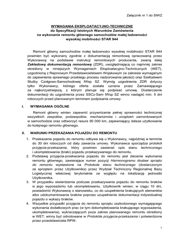 Załącznik nr 1 do SIWZ WYMAGANIA EKSPLOATACYJNO-TECHNICZNE do Specyfikacji Istotnych Warunków Zamówienia na wykonanie remontu głównego samochodów małej ładowności wysokiej mobilności STAR 944 Remont główny samochodów małej ładowności wysokiej mobilności STAR 944 powinien być wykonany zgodnie z dokumentacją remontową opracowaną przez Wykonawcę na podstawie instrukcji remontowych producenta, zwaną dalej Zakładową dokumentacją remontową (ZDR), uwzględniającą co najmniej zakres określony w niniejszych Wymaganiach Eksploatacyjno-Technicznych (WET), uzgodnioną z Rejonowym Przedstawicielstwem Wojskowym (w zakresie wymaganym do zapewnienia sprawnego przebiegu procesu nadzorowania jakości) oraz Szefostwem Służby Czołgowo-Samochodowej IWsp SZ. Wymóg uzgodnienia ZDR dotyczy tylko Wykonawcy, którego oferta została uznana przez Zamawiającego za najkorzystniejszą, z którym planuje się podpisać umowę. Dostarczenie dokumentacji do uzgodnienia przez SSCz-Sam IWsp SZ winno nastąpić min. 5 dni roboczych przed planowanym terminem podpisania umowy. I. WYMAGANIA OGÓLNE Remont główny winien zapewnić przywrócenie pełnej sprawności technicznej wszystkich zespołów, podzespołów, mechanizmów i urządzeń zamontowanych w samochodzie oraz odtworzyć resurs 90 000 km, zapewniający dalsze użytkowanie do kolejnego remontu głównego. II. WARUNKI PRZEKAZANIA POJAZDU DO REMONTU 1. Przekazanie pojazdu do remontu odbywa się u Wykonawcy, najpóźniej w terminie do 30 dni roboczych od daty zawarcia umowy. Wykonawca sporządza protokół przyjęcia-przekazania, który powinien zawierać opis stanu technicznego i ukompletowania (braki) pojazdu przekazywanego do remontu. 2. Podstawą przyjęcia-przekazania pojazdu do remontu jest zlecenie wykonania remontu głównego, zawierające numer pozycji Harmonogramu dostaw sprzętu do remontu wystawione na Protokole stanu technicznego (dostarczonym ze sprzętem przez Użytkownika) przez Wydział Techniczny Regionalnej Bazy Logistycznej właściwej terytorialnie ze względu na lokalizację jednostki Użytkownika. 3. W przypadku stwierdzenia podczas przekazywania pojazdu do remontu braków w jego wyposażeniu lub ukompletowaniu, Użytkownik winien, w ciągu 10 dni, powiadomić Wykonawcę o stanowisku, co do uzupełnienia brakujących elementów albo udokumentowania braków poprzez uzupełnienie dokumentacji indywidualnej pojazdu o wykazy braków. 4. Wszystkie przypadki przyjęcia do remontu sprzętu uszkodzonego wymagającego wykonania dodatkowych prac (w tym dokompletowania brakującego wyposażenia, ukompletowania), wykraczających poza zakres planowanego remontu określony w WET, winny być odnotowane w Protokóle przyjęcia-przekazania i potwierdzone przez przedstawiciela RPW. 1 5. W wyjątkowych sytuacjach, w których wystąpi konieczność wykonania prac dodatkowych (o których mowa w pkt. 4), obejmujących zasadnicze zespoły pojazdu Wykonawcy przysługiwać będzie dodatkowa zapłata. Do zasadniczych zespołów zalicza się silnik wraz ze sprzęgłem głównym i skrzynia biegów. 6. Protokół przyjęcia-przekazania wymieniony w pkt. 4 wraz z kalkulacją kosztów dodatkowych czynności remontowych, Wykonawca przesyła do Zamawiającego oraz kopię - do Użytkownika. Zamawiający w terminie 14 dni jest zobowiązany określić stanowisko, co do realizacji dodatkowych prac, zastrzegając sobie prawo do zażądania od Wykonawcy udokumentowania kosztów wykazanych w kalkulacji. III. SZCZEGÓŁOWE WYMAGANIA W ZAKRESIE WARUNKÓW TECHNICZNYCH REMONTU 1. Po wykonaniu pełnego demontażu pojazdu - jego układów, zespołów i podzespołów, proces technologiczny remontu powinien obejmować wykonanie (przeprowadzenie), co najmniej następujących operacji, zabiegów lub czynności w zakresie odtworzenia pełnej sprawności, poprzez wykonanie (dokonanie, przeprowadzenie): 1.1. W NADWOZIU: 1.1.1. wymiany na nowe: a) uszczelek szyb; b) wyłożeń, obić tapicerskich kabiny; c) obić tapicerskich foteli i siedzeń; d) dywaników i wyłożenia podłogi kabiny; e) nakładek ażurowych; f) uszczelek drzwi, luków; g) lusterek zewnętrznych; h) zamków drzwi i pokryw; i) wykładzin termiczno-akustycznych (osłon pokrywy i komory) silnika; j) mechanizmów podnoszenia szyb; k) fartuchów przeciwbłotnych kół („chlapaczy”); l) elementów gumowych zawieszenia kabiny. 1.1.2. weryfikacji - m.in. wymienionych poniżej elementów, a w przypadku stwierdzenia uszkodzeń lub niesprawności, w postaci: a) wgnieceń - w zależności od stopnia uszkodzenia - wykonanie napraw blacharskich przez prostowanie, wymianę uszkodzonych fragmentów lub wymianę całych elementów poszycia nadwozia (np.: błotnika, atrapy); b) pęknięć - wykonanie naprawy przez spawanie, w przypadkach koniecznych (po stwierdzeniu osłabienia materiału lub konstrukcji) - zastosowanie dodatkowego wzmocnienia - nakładki; c) ognisk korozji - oczyszczenie, a przy dużych ubytkach materiału wymianę fragmentu lub całego elementu oblachowania na nowy; d) zmatowienia, zarysowania lub pęknięcia szyb - wymianę na nowe; e) pęknięć zderzaków - wymianę na nowe; f) pęknięć pokrywy silnika - naprawę; g) deformacji foteli lub siedzeń - naprawę stelaża poprzez prostowanie, wymianę zniekształconych sprężyn, wymianę materiałów wypełniających poduszek. 1.2. 2 W ZESPOLE NAPĘDOWYM (silnik wraz z osprzętem, sprzęgłem głównym i skrzynią biegów): Wykonanie sprawdzenia parametrów pracy zespołu napędowego i w przypadku stwierdzenia nieprawidłowości, wykonanie naprawy metodą wynikową. Ponadto, wykonanie obsługiwania technicznego najwyższego rzędu (połączonego z wymianą płynów i materiałów eksploatacyjnych). 1.3. W UKŁADZIE ZASILANIA: 1.3.1. wymiany na nowe: a) wkładów filtrów; b) uszczelek i uszczelnień filtrów; 1.3.2. weryfikacji pozostałych - m.in. wymienionych poniżej części układu, a w przypadku stwierdzenia nadmiernego zużycia, n