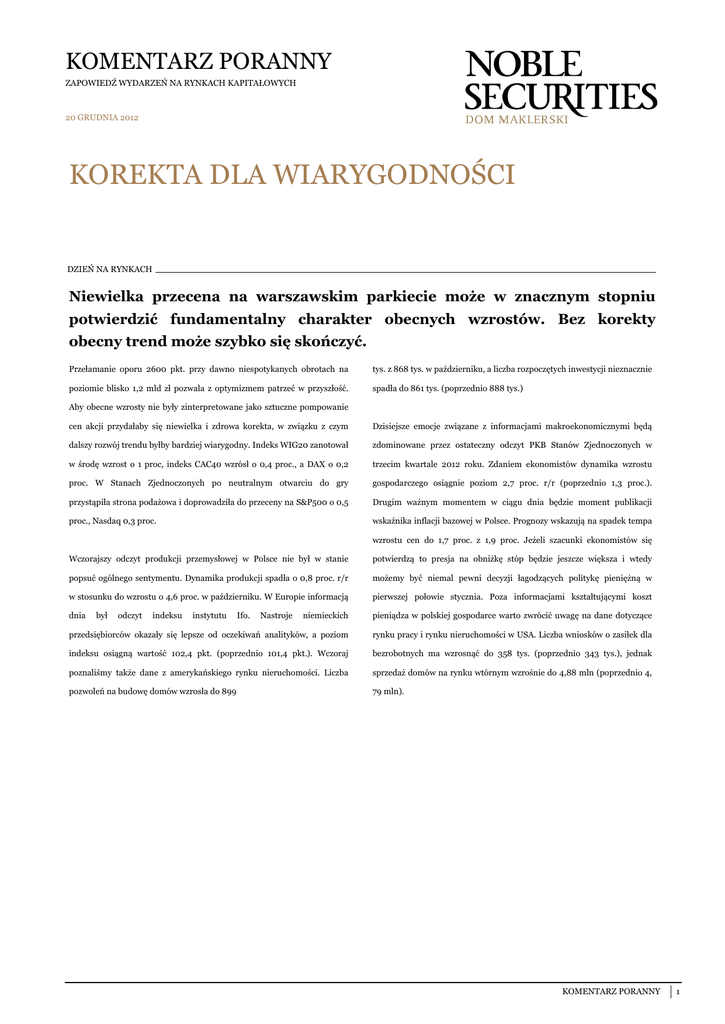 KOMENTARZ PORANNY ZAPOWIEDŹ WYDARZEŃ NA RYNKACH KAPITAŁOWYCH 20 GRUDNIA 2012 KOREKTA DLA WIARYGODNOŚCI DZIEŃ NA RYNKACH Niewielka przecena na warszawskim parkiecie może w znacznym stopniu potwierdzić fundamentalny charakter obecnych wzrostów. Bez korekty obecny trend może szybko się skończyć. Przełamanie oporu 2600 pkt. przy dawno niespotykanych obrotach na tys. z 868 tys. w październiku, a liczba rozpoczętych inwestycji nieznacznie poziomie blisko 1,2 mld zł pozwala z optymizmem patrzeć w przyszłość. spadła do 861 tys. (poprzednio 888 tys.) Aby obecne wzrosty nie były zinterpretowane jako sztuczne pompowanie cen akcji przydałaby się niewielka i zdrowa korekta, w związku z czym Dzisiejsze emocje związane z informacjami makroekonomicznymi będą dalszy rozwój trendu byłby bardziej wiarygodny. Indeks WIG20 zanotował zdominowane przez ostateczny odczyt PKB Stanów Zjednoczonych w w środę wzrost o 1 proc, indeks CAC40 wzrósł o 0,4 proc., a DAX o 0,2 trzecim kwartale 2012 roku. Zdaniem ekonomistów dynamika wzrostu proc. W Stanach Zjednoczonych po neutralnym otwarciu do gry gospodarczego osiągnie poziom 2,7 proc. r/r (poprzednio 1,3 proc.). przystąpiła strona podażowa i doprowadziła do przeceny na S&P500 o 0,5 Drugim ważnym momentem w ciągu dnia będzie moment publikacji proc., Nasdaq 0,3 proc. wskaźnika inflacji bazowej w Polsce. Prognozy wskazują na spadek tempa wzrostu cen do 1,7 proc. z 1,9 proc. Jeżeli szacunki ekonomistów się Wczorajszy odczyt produkcji przemysłowej w Polsce nie był w stanie potwierdzą to presja na obniżkę stóp będzie jeszcze większa i wtedy popsuć ogólnego sentymentu. Dynamika produkcji spadła o 0,8 proc. r/r możemy być niemal pewni decyzji łagodzących politykę pieniężną w w stosunku do wzrostu o 4,6 proc. w październiku. W Europie informacją pierwszej połowie stycznia. Poza informacjami kształtującymi koszt dnia niemieckich pieniądza w polskiej gospodarce warto zwrócić uwagę na dane dotyczące przedsiębiorców okazały się lepsze od oczekiwań analityków, a poziom rynku pracy i rynku nieruchomości w USA. Liczba wniosków o zasiłek dla indeksu osiągną wartość 102,4 pkt. (poprzednio 101,4 pkt.). Wczoraj bezrobotnych ma wzrosnąć do 358 tys. (poprzednio 343 tys.), jednak poznaliśmy także dane z amerykańskiego rynku nieruchomości. Liczba sprzedaż domów na rynku wtórnym wzrośnie do 4,88 mln (poprzednio 4, pozwoleń na budowę domów wzrosła do 899 79 mln). był odczyt indeksu instytutu Ifo. Nastroje KOMENTARZ PORANNY 1 INDEKSY GIEŁDOWE FIXING NBP WIG 47920,75 pkt +0,98 % EUR 4,0730 -0,42 % WIG 20 2602,51 pkt +1,04 % CHF 3,3703 -0,46 % BUX 17807,41 pkt +0,04 % USD 3,0690 -1,14 % CAC40 3664,59 pkt +0,44 % JPY 0,0364 -1,62 % FTSE100 5710,46 pkt +0,97 % GBP 5,0006 -0,70 % WIG 20 NOTOWANIA SUROWCÓW 2603 pkt 2700 2500 10.2012 11.2012 Ropa 109,91 USD -0,34 % Złoto 1669,31 USD +0,07 % Platyna 1589,99 USD +0,19 % Miedź 8005,50 USD 0,00 % 12.2012 Komentarz przygotował: Piotr Mazierski, Noble Securities DANE DOSTARCZA NOTORIA SERWIS SP. Z O. O. KOMENTARZ PORANNY 2