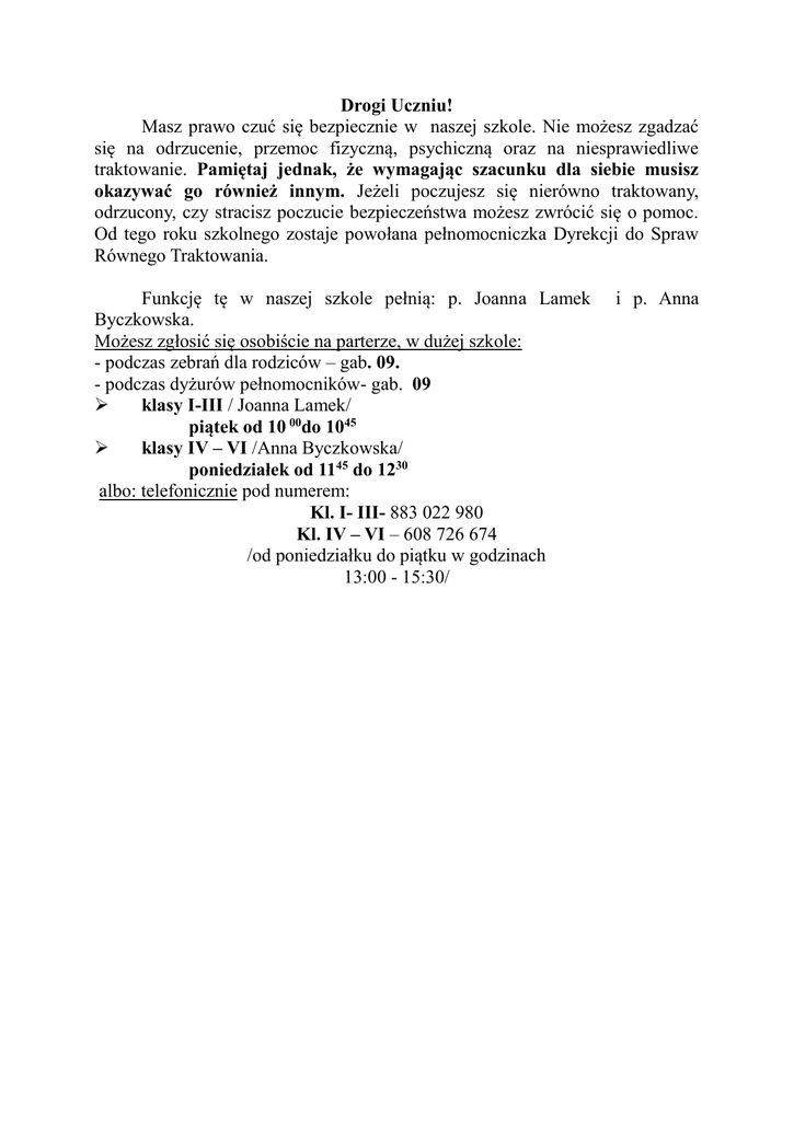Drogi Uczniu! Masz prawo czuć się bezpiecznie w naszej szkole. Nie możesz zgadzać się na odrzucenie, przemoc fizyczną, psychiczną oraz na niesprawiedliwe traktowanie. Pamiętaj jednak, że wymagając szacunku dla siebie musisz okazywać go również innym. Jeżeli poczujesz się nierówno traktowany, odrzucony, czy stracisz poczucie bezpieczeństwa możesz zwrócić się o pomoc. Od tego roku szkolnego zostaje powołana pełnomocniczka Dyrekcji do Spraw Równego Traktowania. Funkcję tę w naszej szkole pełnią: p. Joanna Lamek Byczkowska. Możesz zgłosić się osobiście na parterze, w dużej szkole: - podczas zebrań dla rodziców – gab. 09. - podczas dyżurów pełnomocników- gab. 09 klasy I-III / Joanna Lamek/ piątek od 10 00do 1045 klasy IV – VI /Anna Byczkowska/ poniedziałek od 1145 do 1230 albo: telefonicznie pod numerem: Kl. I- III- 883 022 980 Kl. IV – VI – 608 726 674 /od poniedziałku do piątku w godzinach 13:00 - 15:30/ i p. Anna
