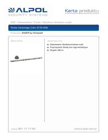 SAP / Adresowalne / Czujki / Obudowy kanałowe czujek Rurka Venturiego 2,8m (E781458) Producent: ESSER by Honeywell Zdjęcie produktu Najważniejsze cechy Zastosowanie: Obudowa kanałowa czujki Przeznaczenie: Kanały oraz ciągi wentylacyjne Długość: 280 cm