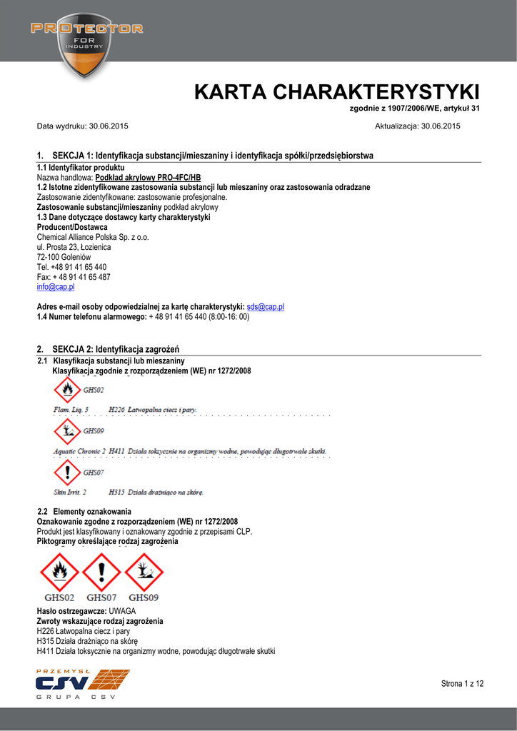 KARTA CHARAKTERYSTYKI zgodnie z 1907/2006/WE, artykuł 31 Data wydruku: 30.06.2015 Aktualizacja: 30.06.2015 1. SEKCJA 1: Identyfikacja substancji/mieszaniny i identyfikacja spółki/przedsiębiorstwa 1.1 Identyfikator produktu Nazwa handlowa: Podkład akrylowy PRO-4FC/HB 1.2 Istotne zidentyfikowane zastosowania substancji lub mieszaniny oraz zastosowania odradzane Zastosowanie zidentyfikowane: zastosowanie profesjonalne. Zastosowanie substancji/mieszaniny podkład akrylowy 1.3 Dane dotyczące dostawcy karty charakterystyki Producent/Dostawca Chemical Alliance Polska Sp. z o.o. ul. Prosta 23, Łozienica 72-100 Goleniów Tel. +48 91 41 65 440 Fax: + 48 91 41 65 487 [email protected] Adres e-mail osoby odpowiedzialnej za kartę charakterystyki: [email protected] 1.4 Numer telefonu alarmowego: + 48 91 41 65 440 (8:00-16: 00) 2. SEKCJA 2: Identyfikacja zagrożeń 2.1 Klasyfikacja substancji lub mieszaniny Klasyfikacja zgodnie z rozporządzeniem (WE) nr 1272/2008 2.2 Elementy oznakowania Oznakowanie zgodne z rozporządzeniem (WE) nr 1272/2008 Produkt jest klasyfikowany i oznakowany zgodnie z przepisami CLP. Piktogramy określające rodzaj zagrożenia Hasło ostrzegawcze: UWAGA Zwroty wskazujące rodzaj zagrożenia H226 Łatwopalna ciecz i pary H315 Działa drażniąco na skórę H411 Działa toksycznie na organizmy wodne, powodując długotrwałe skutki Strona 1 z 12 Zwroty wskazujące środki ostrożności P210 Przechowywać z dala od źródeł ciepła, gorących powierzchni, źródeł iskrzenia, otwartego ognia i innych źródeł zapłonu. Nie palić. P280 Stosować rękawice ochronne P332+P313 W przypadku wystąpienia podrażnienia skóry: Zasięgnąć porady/zgłosić się pod opiekę lekarza. P501 Zawartość/pojemnik usuwać zgodnie z przepisami miejscowymi/regionalnymi/narodowymi/międzynarodowymi 2.3 Inne zagrożenia Wyniki oceny właściwości PBT i vPvB PBT: Nie spełnia kryteriów PBT vPvB: Nie spełnia kryteriów vPvB 3. SEKCJA 3: Skład/informacja o składnikach 3.2 Charakterystyka chemiczna: Mieszaniny Opis: Mieszanina składająca się z niżej wymienionych składników. Składniki niebezpieczne: CAS: 1330-20-7 ksylen EINECS: 215-535-7 Flam. Liq. 3, H226; ~ ~ Acute Tox. 4, H312; Acute Tox. 4, H332; Skin Irrit. 2, H315 CAS: 1330-20-7 ksylen EINECS: 215-535-7 Flam. Liq. 3, H226; ~ ~ STOT RE 2, H373; Asp. Tox. 1, H304; ~ Acute To Reg.nr.: 01-2119488216-32 4, H312; Acute Tox. 4, H332; Skin Irrit. 2, H315; Eye Irrit. 2, H319; STOT SE 3, H335 CAS: 108-65-6 octan 1-metoksy-2-propylu EINECS: 203-603-9 Flam. Liq. 3, H226 ~ Reg.nr.: 01-2119475791-29 CAS: 123-86-4 octan butylu EINECS: 204-658-1 Flam. Liq. 3, H226; ~ ~ STOT SE 3, H336 Reg.nr.: 01-2119485493-29 CAS: 7779-90-0 bis[ortofosforan(V)] tricynku EINECS: 231-944-3 Aquatic Acute 1, H400; Aquatic Chronic 1, H410 ~ Reg.nr.: 01-2119485044-40 CAS: 1314-13-2 tlenek cynku EINECS: 215-222-5 Aquatic Acute 1, H400; Aquatic Chronic 1, H410 ~ Reg.nr.: 01-2119463881-32 CAS: 100-41-4 etylobenzen EINECS: 202-849-4 Flam. Liq. 2, H225; ~ ~ STOT RE 2, H373; Asp. Tox. 1, H304; ~ Acute To 4, H332 5-15% 1-7,5% x. 1-7,5% 1-5% 1-2,5% 0,1-1% 0,1-1% x. Wskazówki dodatkowe: Pełne brzmienie zwrotów P i H podano w sekcji 16. 4. SEKCJA 4: Środki pierwszej pomocy 4.1 Instrukcje postępowania w zależności od drogi narażenia Wskazówki ogólne: Symptomy zatrucia mogą wystąpić po kilku godzinach, kontrola lekarska niezbędna co najmniej przez 48 godzin po wypadku. W przypadku nieregularnego oddechu lub jego braku zastosować sztuczne oddychanie. Wdychanie: Wynieść poszkodowanego z miejsca narażenia, ułożyć w wygodnej pozycji półleżącej lub siedzącej, zapewnić dostęp do świeżego powietrza, chronić przed utratą ciepła. Jeżeli wystąpią zaburzenia oddychania, wezwać lekarza. W przypadku utraty przytomności ułożyć w stabilnej pozycji bocznej. Kontakt ze skórą: Natychmiast zdjąć zanieczyszczoną odzież; skażoną skórę dokładnie zmywać wodą z mydłem. Kontakt z oczami: Płukać oczy z otwartą powieką przez kilka minut pod bieżącą wodą. Połknięcie: Jeżeli nastąpi połknięcie, nie powodować wymiotów. Zapewnić natychmiastową pomoc lekarską. 4.2 Najważniejsze ostre i opóźnione objawy oraz skutki narażenia Brak dostępnych dalszych istotnych danych. Strona 2 z 12 4.3 Wskazania dotyczące wszelkiej natychmiastowej pomocy lekarskiej i szczególnego postępowania z poszkodowanym Brak dostępnych dalszych istotnych danych 5. SEKCJA 5: Postępowanie w przypadku pożaru 5.1 Środki gaśnicze Przydatne środki gaśnicze: CO2, piasek, proszek gaśniczy, woda - prądy rozproszone. Środki gaśnicze nieprzydatne ze względów bezpieczeństwa: Nie stosować zwartego strumienia wody. 5.2 Szczególne zagrożenia związane z substancją lub mieszaniną Mogą tworzyć się wybuchwe mieszaniny gaz-powietrze. Przy ogrzewaniu lub w wypadku pożaru możliwe jest tworzenie się trujących gazów. Tlenek węgla i dwutlenek węgla 5.3 Informacje dla straży pożarnej Specjalne wyposażenie ochronne: Stosować sprzęt ochronny układu oddechowego. Nie wdychać toksycznych gazów, które mogą powstać podczas pożaru lub wysokiej temperatury. Inne dane Pojemniki narażone na działanie ognia chłodzić z bezpiecznej odległości rozproszonym strumieniem wody (niebezpieczeństwo wybuchu); o ile to możliwe, usunąć je z terenu zagrożonego. Pozostałości po pożarze i skażoną wodę należy usunąć zgodnie z przepisami. Wodę skażoną należy zbierać oddzielnie, nie dopuścić do przedostania się do kanalizacji. SEKCJA 6: Postępowanie w przypadku niezamierzonego uwolnienia do środowiska 6.1 Indywidualne środki ostrożności, sprzęt ochronny i procedury w sytuacjach awaryjnych Stosować odzież ochronną. Ewakuować osoby niezabezpieczone z zagrożonego obszaru. Zapewnić odpowiednią wentylację pomieszczenia. W sytuacji pożaru, jeżeli to możliwe usunąć źródło zapłonu (ugasić otwarty ogień, ogłosić zakaz paleni