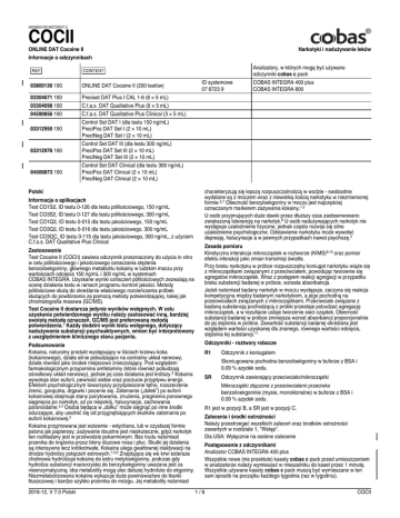 0003800130190COINV7.0 COCII ONLINE DAT Cocaine II Narkotyki i nadużywanie leków Informacje o odczynnikach 03800130 190 ONLINE DAT Cocaine II (200 testów) 03304671 190 03304698 190 04590856 190 Preciset DAT Plus I CAL 1-6 (6 × 5 mL) C.f.a.s. DAT Qualitative Plus (6 × 5 mL) C.f.a.s. DAT Qualitative Plus Clinical (3 × 5 mL) Control Set DAT I (dla testu 150 ng/mL) PreciPos DAT Set I (2 × 10 mL) PreciNeg DAT Set I (2 × 10 mL) Control Set DAT III (dla testu 300 ng/mL) PreciPos DAT Set III (2 × 10 mL) PreciNeg DAT Set III (2 × 10 mL) Control Set DAT Clinical (dla testu 300 ng/mL) PreciPos DAT Clinical (2 × 10 mL) PreciNeg DAT Clinical (2 × 10 mL) 03312950 190 03312976 190 04500873 190 Polski Informacja o aplikacjach Test CO1S2, ID testu 0‑126 dla testu półilościowego, 150 ng/mL Test CO3S2, ID testu 0‑127 dla testu półilościowego, 300 ng/mL Test CO1Q2, ID testu 0‑015 dla testu jakościowego, 150 ng/mL Test CO3Q2, ID testu 0‑016 dla testu jakościowego, 300 ng/mL Test CO3QC, ID testu 0‑115 dla testu jakościowego, 300 ng/mL, z użyciem C.f.a.s. DAT Qualitative Plus Clinical Zastosowanie Test Cocaine II (COCII) zawiera odczynnik przeznaczony do użycia in vitro w celu półilościowego i jakościowego oznaczania stężenia benzoiloekgoniny, głównego metabolitu kokainy w ludzkim moczu przy wartościach odcięcia 150 ng/mL i 300 ng/mL w systemach COBAS INTEGRA. Uzyskane wyniki oznaczeń półilościowych zezwalają na ocenę działania testu w ramach programu kontroli jakości. Metody półilościowe służą do określania właściwego rozcieńczenia próbek służących do powtórzenia za pomocą metody potwierdzającej, takiej jak chromatografia masowa (GC/MS). Test Cocaine II dostarcza jedynie wyników wstępnych. W celu uzyskania potwierdzonego wyniku należy zastosować inną, bardziej swoistą metodę oznaczeń. GC/MS jest preferowaną metodą potwierdzenia.1 Każdy dodatni wynik testu wstępnego, dotyczący nadużywania substancji psychoaktywnych, winien być interpretowany z uwzględnieniem klinicznego stanu pacjenta. Podsumowanie Kokaina, naturalny produkt występujący w liściach krzewu koka (kokainowego), działa silnie pobudzająco na centralny układ nerwowy; działa również jako środek miejscowo znieczulający. Pod względem farmakologicznym przypomina amfetaminy (które również pobudzają ośrodkowy układ nerwowy), jednak jej czas działania jest krótszy.2 Kokaina wywołuje stan euforii, pewność siebie oraz poczucie przypływu energii. Efektom psychologicznym towarzyszy przyśpieszone tętno, rozszerzenie źrenic, gorączka, drgawki i pocenie się. Załamanie („dołek”) po euforii kokainowej obejmuje stany poirytowania, znużenia, pragnienia ponownego sięgnięcia po narkotyk, aż po niepokój, halucynacje, zachowania paranoidalne.3,4 Osoba będąca w „dołku” może sięgnąć po inne środki odurzające, aby uwolnić się od przygnębiających skutków załamania po euforii kokainowej.2 Kokaina przyjmowana jest wziewnie - wdychana, lub w czystszej formie palona jak papierosy; zażywanie doustne jest nieskuteczne, gdyż narkotyk ten rozkładany jest w przewodzie pokarmowym. Bez trudu natomiast przenika do krążenia przez błony śluzowe nosa i płuc. Skutki jej działania są intensywne lecz krótkotrwałe. Kokaina ulega gwałtownej inaktywacji na drodze hydrolizy połączeń estrowych.1,5,6 Znajdująca się we krwi esteraza cholinowa hydrolizuje kokainę do estru metyloekgoniny, podczas gdy hydroliza substancji macierzystej do benzyloekgoniny uważana jest za nieenzymatyczną; oba metabolity mogą ulec dalszej hydrolizie do ekgoniny. Niezmetabolizowana kokaina wykazuje duże powinowactwo do tkanki tłuszczowej i bardzo szybko przenika do mózgu. Jej metabolity natomiast 2016-12, V 7.0 Polski ID systemowe 07 6723 9 Analizatory, w których mogą być używane odczynniki cobas c pack COBAS INTEGRA 400 plus COBAS INTEGRA 800 charakteryzują się lepszą rozpuszczalnością w wodzie - swobodnie wydalane są z moczem wraz z niewielką ilością narkotyku w niezmienionej formie.5,7 Obecność benzyloekgoniny w moczu jest najczęściej oznaczanym markerem zażywania kokainy.1,5 U osób przyjmujących duże dawki przez dłuższy czas zaobserwowano zwiększoną tolerancję na narkotyk.8 U osób nadużywających narkotyk nie występuje uzależnienie fizyczne, jednak często rozwija się silne uzależnienie psychologiczne. Odstawienie narkotyku może wywołać depresję, halucynacje a w pewnych przypadkach nawet psychozę.2 Zasada pomiaru Kinetyczna interakcja mikrocząstek w roztworze (KIMS)9,10 oraz pomiar efektu interakcji jako zmian transmisji światła. Przy braku narkotyku w próbce rozpuszczalny koniugat narkotyku wiąże się z mikrocząstkami związanymi z przeciwciałem, powodując tworzenie się agregatów mikrocząstek. Wraz z postępem reakcji agregacji w przypadku braku substancji badanej w próbce, wzrasta absorbancja. Jeżeli natomiast badany narkotyk w moczu występuje, zaczyna się reakcja kompetycyjna między badanym narkotykiem, a jego pochodną na przeciwciałach związanych z mikrocząstkami. Przeciwciało związane z badaną substancją pochodzącą z próbki przestaje pobudzać agregację mikrocząstek, a w rezultacie ustaje tworzenie sieci cząstek. Obecność substancji badanej w próbce zmniejsza wzrost absorbancji proporcjonalnie do jej stężenia w próbce. Zawartość substancji badanej określana jest względem wartości uzyskanej dla znanego, równego wartości odcięcia, stężenia tej substancji.11 Odczynniki - roztwory robocze R1 Odczynnik z koniugatem Skoniugowana pochodna benzoiloekgoniny w buforze z BSA i 0.09 % azydek sodu. SR Odczynnik zawierający przeciwciało/mikrocząstki Mikrocząstki złączone z przeciwciałami przeciwko benzoiloekgoninie (mysie, monoklonalne) w buforze z BSA i 0.09 % azydek sodu. R1 jest w pozycji B, a SR jest w pozycji C. Zalecenia i środki ostrożności Należy przestrzegać wsze