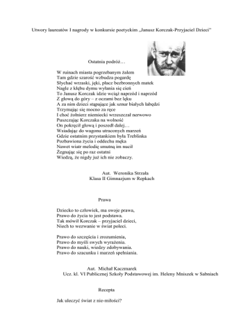Utwory laureatów I nagrody w konkursie poetyckim „Janusz Korczak-Przyjaciel Dzieci” Ostatnia podróż… W ruinach miasta pogrzebanym żalem Tam gdzie szarość wzbudza pogardę Słychać wrzaski, jęki, płacz bezbronnych matek Nagle z kłębu dymu wyłania się cień To Janusz Korczak idzie wciąż naprzód i naprzód Z głową do góry – z oczami bez lęku A za nim dzieci stąpające jak sznur białych łabędzi Trzymając się mocno za ręce I choć żołnierz niemiecki wrzeszczał nerwowo Puszczając Korczaka na wolność On pokręcił głową i poszedł dalej… Wsiadając do wagonu utraconych marzeń Gdzie ostatnim przystankiem była Treblinka Pozbawiona życia i oddechu męka Nawet wiatr melodię smutną im nucił Żegnając się po raz ostatni Wiedzą, że nigdy już ich nie zobaczy. Aut. Weronika Strzała Klasa II Gimnazjum w Repkach Prawa Dziecko to człowiek, ma swoje prawa, Prawo do życia to jest podstawa. Tak mówił Korczak – przyjaciel dzieci, Niech to wezwanie w świat poleci. Prawo do szczęścia i zrozumienia, Prawo do myśli swych wyrażenia. Prawo do nauki, wiedzy zdobywania. Prawo do szacunku i marzeń spełniania. Aut. Michał Kaczmarek Ucz. kl. VI Publicznej Szkoły Podstawowej im. Heleny Mniszek w Sabniach Recepta Jak uleczyć świat z nie-miłości? Korczak jako lekarz przepis prosty dał: „Wystarczy siebie oddać, to lek najwyższej jakości” Kto kurację przeszedł serce wielkie miał. Łyżka przyjaźni, trzy krople miłości, Popij koniecznie szklanką czułości. Uśmiechaj się często do ludzi przygnębionych Odwiedzaj zasmuconych, pocieszaj strapionych. Aut. Michał Kaczmarek Ucz. kl. VI Publicznej Szkoły Podstawowej im. Heleny Mniszek w Sabniach Pamięć o Korczaku Wszyscy piszą o Korczaku Wiersze przejmujące. Był odważny, dzielny, mądry bardzo kochający. On poświęcił się dla dzieci, na śmierć poszedł z nimi. Tulił je jak matka swoje, by w ostatniej chwili o nic się już nie martwiły. Pamiętajmy o Korczaku drodzy przyjaciele, bo wniósł w nędzne, nasze życie wartości wiele. Proszę piszcie wiersze drodzy, bo wart jest tych wspomnień. Czas przemija, czas ucieka, nie zapomnij o nim. Aut. Katarzyna Miściorak Ucz. kl. III Publicznej Szkoły Podstawowej im. Heleny Mniszek w Sabniach Przyjaciel Ile miłości trzeba mieć Aby pocieszyć, wziąć na ręce Ile odwagi by idąc na śmierć Osłaniać ich dziecinne serce. Aut. Julia Kur Ucz. kl. III Publicznej Szkoły Podstawowej w Sterdyni Wakacyjne wycieczki Jak na wycieczkę wtedy szli sierpniowe słońce grzało. Jeżeli Doktor z nimi jest Nic złego się nie stało. Aut. Julia Kur Ucz. kl. III Publicznej Szkoły Podstawowej w Sterdyni