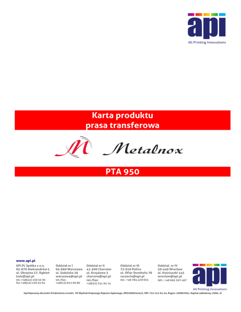 Karta produktu prasa transferowa PTA 950 www.api.pl API.PL Spółka z o.o. 95-070 Aleksandrów Ł. ul. Okrężna 37, Rąbień [email protected] Oddział nr I 04-660 Warszawa ul. Sadulska 20 [email protected] tel.:+48(42) 250 55 95 fax +48(42) 250 55 94 tel./fax: +48(22) 812 06 80 Oddział nr II 41-500 Chorzów ul. Krzyżowa 3 [email protected] tel./fax: Oddział nr III 72-010 Police ul. Ofiar Stutthofu 78 [email protected] tel.: +48 784 439 035 Oddział nr IV 50-440 Wrocław ul. Kościuszki 145 [email protected] tel.: +48 665 307 407 +48(32) 241 65 14 Sąd Rejonowy dla Łodzi-Śródmieścia w Łodzi, XX Wydział Krajowego Rejestru Sądowego, KRS:0000345423, NIP: 732-213-61-34, Regon: 100807691, Kapitał zakładowy: 5000,-zł Karta produktu urządzenia Metalnox PTA 950 Metalnox PTA 950 jest w pełni automatyczną jednostanowiskową, dwustołową pneumatyczną prasą termotransferową charakteryzującą się wysoką siłą docisku oraz równomiernym rozkładem ciepła. Urządzenie zaprojektowano z myślą o transferze farb plastizolowych, folii transferowych i wydruków sublimacyjnych na tekstylia oraz sztywne materiały płaskie (np. blachy, kafelki, itp.). Solidna konstrukcja i staranne wykonanie są gwarantem bezproblemowej pracy. Prasa płaska Metalnox PTA 950 Dane techniczne: - wymiar pola roboczego: 100 x 70 cm - dwa stoły robocze poruszające się poziomo na prowadnicach - zakres temperatur: 0 ÷ 220 st. C - czas wygrzewania: 1 sek ÷ 99 min 59 sek. - maksymalne ciśnienie: ok. 7 bar - zużycie sprężonego powietrza: ok. 60 l / cykl pracy - pobór prądu w czasie rozgrzewania: 12,5 kW - pobór prądu w czasie pracy ciągłej: 4,2 kW/h Główne zalety prasy Metalnox PTA 950: - duże pole wygrzewania - dwa stoły podawcze o automatycznym przesuwie pozwalające zmaksymalizować wydajność pracy - jednoosobowa obsługa - równomierny rozkład temperatury na całej powierzchni płyty grzewczej - niska konsumpcja prądu po rozgrzaniu płyty grzewczej - wysoka maksymalna temperatura wygrzewania - pneumatyczny docisk o dużej sile - wyciąg oparów Dodatkowe informacje: Urządzenie objęte jest 12 miesięczna gwarancją producenta. Gwarancją producenta nie są objęte elementy eksploatacyjne, do których zaliczymy m. in. podkłady filcowe, ceratki teflonowe. www.api.pl API.PL Spółka z o.o. 95-070 Aleksandrów Ł. ul. Okrężna 37, Rąbień [email protected] Oddział nr I 04-660 Warszawa ul. Sadulska 20 [email protected] tel.:+48(42) 250 55 95 fax +48(42) 250 55 94 tel./fax: +48(22) 812 06 80 Oddział nr II 41-500 Chorzów ul. Krzyżowa 3 [email protected] tel./fax: Oddział nr III 72-010 Police ul. Ofiar Stutthofu 78 [email protected] tel.: +48 784 439 035 Oddział nr IV 50-440 Wrocław ul. Kościuszki 145 [email protected] tel.: +48 665 307 407 +48(32) 241 65 14 Sąd Rejonowy dla Łodzi-Śródmieścia w Łodzi, XX Wydział Krajowego Rejestru Sądowego, KRS:0000345423, NIP: 732-213-61-34, Regon: 100807691, Kapitał zakładowy: 5000,-zł