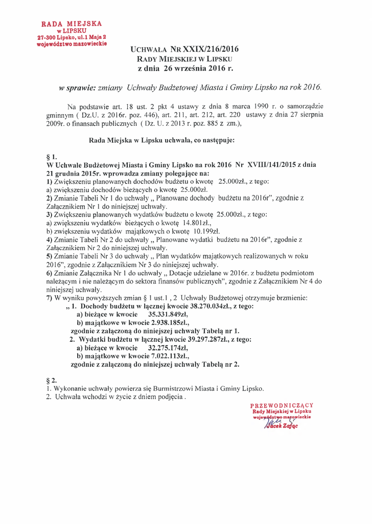 RADA M IE J S K A w LIPSKU 27*300 Lipsko, u l.l Maja 2 województwo mazowieckie . .. . U c h w a ł a N r X X IX /216/2016 R a d y M ie j s k ie j w L ip s k u z dnia 26 września 2016 r. w sprawie: zmiany Uchwały Budżetowej Miasta i Gminy Lipsko na rok 2016. Na podstawie art. 18 ust. 2 pkt 4 ustawy z dnia 8 marca 1990 r. o samorządzie gminnym ( Dz.U. z 2016r. poz. 446), art. 211, art. 212, art. 220 ustawy z dnia 27 sierpnia 2009r. o finansach publicznych ( Dz. U. z 2013 r. poz. 885 z zm.), Rada Miejska w Lipsku uchwala, co następuje: §1W Uchwale Budżetowej Miasta i Gminy Lipsko na rok 2016 Nr XVIII/141/2015 z dnia 21 grudnia 2015r. wprowadza zmiany polegające na: 1) Zwiększeniu planowanych dochodów budżetu o kwotę 25.000zł., z tego: a) zwiększeniu dochodów bieżących o kwotę 25.000zł. 2) Zmianie Tabeli N r 1 do uchwały „ Planowane dochody budżetu na 2016r”, zgodnie z Załącznikiem N r 1 do niniejszej uchwały. 3) Zwiększeniu planowanych wydatków budżetu o kwotę 25.000zŁ, z tego: a) zwiększeniu wydatków bieżących o kwotę 14.801 zł., b) zwiększeniu wydatków majątkowych o kwotę 10.199zł. 4) Zmianie Tabeli N r 2 do uchwały „ Planowane wydatki budżetu na 2016r”, zgodnie z Załącznikiem N r 2 do niniejszej uchwały. 5) Zmianie Tabeli Nr 3 do uchwały „ Plan wydatków majątkowych realizowanych w roku 2016”, zgodnie z Załącznikiem Nr 3 do niniejszej uchwały. 6) Zmianie Załącznika Nr 1 do uchwały „ Dotacje udzielane w 2016r. z budżetu podmiotom należącym i nie należącym do sektora finansów publicznych”, zgodnie z Załącznikiem Nr 4 do niniejszej uchwały. 7) W wyniku powyższych zmian § 1 ust.l , 2 Uchwały Budżetowej otrzymuje brzmienie: „ 1. Dochody budżetu w łącznej kwocie 38.270.034zł., z tego: a) bieżące w kwocie 35.331.849zl, b) majątkowe w kwocie 2.938.185zł., zgodnie z załączoną do niniejszej uchwały Tabelą nr 1. 2. Wydatki budżetu w łącznej kwocie 39.297.287zł., z tego: a) bieżące w kwocie 32.275.174zł, b) majątkowe w kwocie 7.022.113zł., zgodnie z załączoną do niniejszej uchwały Tabelą nr 2. §2. 1. Wykonanie uchwały powierza się Burmistrzowi Miasta i Gminy Lipsko. 2. Uchwała wchodzi w życie z dniem podjęcia . PRZEWODNICZĄCY Rady M iejskiej w Lipsku województwo mazowieckie J fa c e k Z tr fą c rada miejska W LIPSK U 27-300 Lipsko, u l.l Maja 2 województwo mazowieckie U z a sa d n ie n ie do U chw ały N r X XIX /216/2016 z dnia 26 w rześnia 2016r. Zwiększono plan dochodów ogółem o kw otę 25.000zł. W ramach dochodów bieżących wprowadzono: - dochody z najm u pom ieszczeń biurow ych w kwocie 1.550zł., - odsetki od środków grom adzonych na rachunku bankow ym w kwocie lO.OOOzł., - dotację celową z budżetu państw a na dofinansow anie zadań realizow anych w ram ach wieloletniego program u w spierania gmin w zakresie dożyw iania „ Pom oc państw a w zakresie dożywiania” w kwocie 15.OOOzł. Zm niejszono plan dochodów w łasnych z tytułu świadczonych przez U rząd M iasta i Gminy usług transportowych, o kwotę 1.550zł. Zm iany dokonano na podstaw ie przeprow adzonej analizy dotychczas otrzym anych dochodów z w /w tytułu oraz przew idyw anym niższym ich w ykonaniem w roku 2016. Zwiększono plan w ydatków ogółem o kwotę 25.000zł. W ramach w ydatków bieżących dokonano miedzy innymi: - w prowadzenia środków w w ysokości 1.OOOzł. na wydatki z tytułu rozliczeń podatku VAT, - zw iększenia planu w ydatków związanych z funkcjonowaniem U rzędu ( zakup usług pozostałych) o kwotę 10.301zł.. W ramach w ydatków m ajątkow ych dokonano : - zabezpieczenia środków w planie finansowym Zespołu Placów ek O św iatow ych w Krępie Kościelnej w kwocie lO.OOOzł. na w ykonanie ogrodzenia od strony drogi wojewódzkiej nr 747 przebiegającej obok budynku szkoły, - zabezpieczenia środków w kwocie 3.OOOzł.na nabycie praw a w łasności nieruchom ości położonej w obrębie geodezyjnym W alentynów oznaczonej nr ewidencyjnym 583/2 o pow. 0,0280ha, z przeznaczeniem na utw orzenie parkingu obok Zespołu Placówek O św iatow ych w Długowoli. Środki pokryją koszty zakupu nieruchomości oraz koszty opłat notarialnych związanych z przejęciem nieruchomości, - zwiększenia kw oty środków na doposażenie w sprzęt sportow y sali służącej profilaktyce uzależnień o 7.500zł. W celu zakupu urządzeń do w yposażenia sali fitness, przeprowadzono dwukrotnie postępow anie konkurencyjne. Oba postępow ania nie przyniosły rozstrzygnięcia. W celu zrealizowania zadania inw estycyjnego istnieje konieczność zw iększenia kw oty środków do kwoty najtańszej oferty, - wprowadzenia środków w kwocie 18.500zł. na zakup traktora koszącego trawę na stadionie miejskim w Lipsku. O becnie w ykorzystyw any od ponad siedm iu lat traktor ulega ciągłym awariom, co pochłania znaczne środki na jego rem ont oraz uniem ożliw ia system atyczne koszenie trawy, - w prowadzenia środków w kw ocie 18.OOOzł. na dofinansowanie zakupu sam ochodu dla Komendy Powiatowej Policji w Lipsku. - zm niejszenia planu w ydatków zadań inwestycyjnych: • „ Budowa kanalizacji sanitarnej w ram ach aglom eracji Lipsko” o kwotę 2.001zł., •„ Przebudowa ulicy Rynek oraz ulicy Pieszej w Lipsku” o kwotę 2.OOOzł., •„ Przebudowa ulicy K ościuszki w Lipsku „ o kwotę 18.OOOzł., • „Zakup i m ontaż sprzętu rekreacyjnego do ćwiczeń na świeżym pow ietrzu w ram ach zagospodarowania terenu turystyczno- rekreacyjnego przy zalewie w lipsku” o kw otę lO.OOOzł., • „ W ymiana pieca c.o w budynku szkoły w D ługow oli” o kwotę 13.200zł., - zmiany zakresu realizacji zadania dotyczącego zakupu w iat przystankow ych. W w yniku przeprowadzonego zapytania ofertowego uzyskano oszczędności pozw alające na zakup dodatkowej W ia t^ ' p r z e w o d n i c z ą c y Rady M iejskiej w Lipsku województwp mazowieckie Załącznik nr 1 do Uchwały Nr XXIX/216/201
