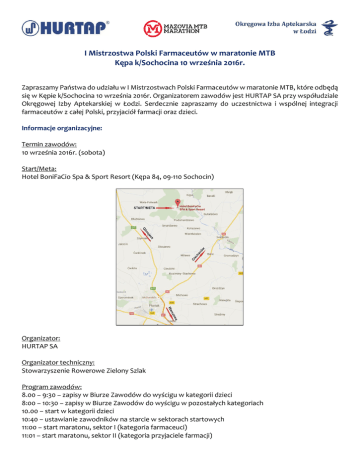 I Mistrzostwa Polski Farmaceutów w maratonie MTB Kępa k/Sochocina 10 września 2016r. Zapraszamy Państwa do udziału w I Mistrzostwach Polski Farmaceutów w maratonie MTB, które odbędą się w Kępie k/Sochocina 10 września 2016r. Organizatorem zawodów jest HURTAP SA przy współudziale Okręgowej Izby Aptekarskiej w Łodzi. Serdecznie zapraszamy do uczestnictwa i wspólnej integracji farmaceutów z całej Polski, przyjaciół farmacji oraz dzieci. Informacje organizacyjne: Termin zawodów: 10 września 2016r. (sobota) Start/Meta: Hotel BoniFaCio Spa & Sport Resort (Kępa 84, 09-110 Sochocin) Organizator: HURTAP SA Organizator techniczny: Stowarzyszenie Rowerowe Zielony Szlak Program zawodów: 8.00 – 9:30 – zapisy w Biurze Zawodów do wyścigu w kategorii dzieci 8:00 – 10:30 – zapisy w Biurze Zawodów do wyścigu w pozostałych kategoriach 10.00 – start w kategorii dzieci 10:40 – ustawianie zawodników na starcie w sektorach startowych 11:00 – start maratonu, sektor I (kategoria farmaceuci) 11:01 – start maratonu, sektor II (kategoria przyjaciele farmacji) 13:00 – dekoracja zwycięzców 14:00 – planowane zakończenie imprezy Opłata: Udział w zawodach jest bezpłatny dla każdej kategorii Zgłoszenia: Wypełniony formularz zgłoszeniowy (dostępny do pobrania pod adresem www.hurtap.com.pl lub www.zamanagroup.pl) prosimy wysyłać na adres: [email protected]. Formularze zgłoszeniowe można wysyłać do dnia 5 września, po tym terminie zgłoszenia dokonujemy w dniu zawodów w godzinach od 8 do 10:30. Przebieg zawodów: Dzieci startują z jednego sektora i pokonują dystans 5 km na specjalnie wytyczonej i oznakowanej trasie. W trakcie wyścigu dzieci rodzic/opiekun może jechać wraz dzieckiem. Dorośli startują z dwóch sektorów: I sektor – farmaceuci, II sektor – przyjaciele farmacji. Dystans 15 km według wytyczonej trasy. O zwycięstwie decyduje najlepszy czas w danej kategorii wiekowej. W każdej kategorii wiekowej za zajęcie miejsca I, II, III przewidziane są puchary, dyplomy i medale. Każdy z uczestników, który weźmie udział w maratonie otrzyma pamiątkowy medal Mistrzostw Polski. Dojazd i zakwaterowanie: Dojazd do Kępy i zakwaterowanie pozostaje w gestii uczestników. Proponujemy Państwu następujące możliwości noclegu: Hotel BoniFaCio Spa & Sport Resort**** (Kępa 84, 09-110 Sochocin) Recepcja: tel.: 23 651 24 00 lub tel. kom. 505 900 222 http://www.hotelbonifacio.pl/ Cena pokoju 2-os. ze śniadaniem: 380 zł /doba Podczas rezerwacji należy powołać się na hasło "MARATON FARMACEUTÓW" Hotel Martex*** (Płońsk, ul. Grunwaldzka 53) Recepcja: tel. 23 672 29 13, 23 683 44 02 lub tel. kom. 660 496 220 Cena pokoju 1-osobowego: 108 zł /doba Cena pokoju 2-osobowego wynosi 132 zł /doba. Cena pokoju 3-osobowego wynosi 225 zł /doba. Cena pokoju 4-osobowego wynosi 300 zł/doba. Koszt śniadania wynosi 19,50zł /osoba. Goście powołujący się na hasło "MARATON FARMACEUTÓW", od powyższych cen, otrzymają dodatkowo 5% rabatu. http://www.hotelmartex.pl/ Informacje dodatkowe: Biuro Mazovia MTB, tel. 533 005 212, e-mail: [email protected] Dział Marketingu HURTAP SA, tel. 24 721 25 13, e-mail: [email protected] Informacje na temat trasy zawodów, formularz zgłoszeniowy a także regulamin zawodów można znaleźć na stronie internetowej www.zamanagroup.pl lub www.hurtap.com.pl