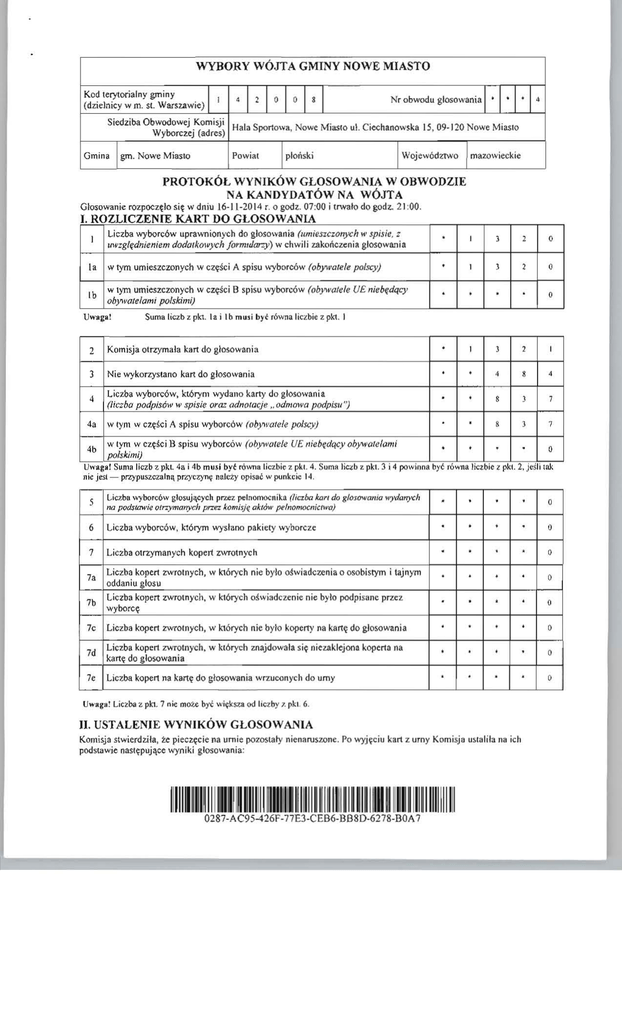 WYBORY WÓJTA GMINY NOWE MIASTO Kod lerytorialny gminy I (dzielnicy w m. SI. Warszawie) Siedziba Obwodowej Komisji Wyborczej (adres) Gmina Igm. Nowe Miasto , • O • O Nr obwodu glosowania . • • , Ha la Sportowa, Nowe Mias(o ul. Ciechanowska 15, 09- 120 Nowe Miasto Powiat Iplonski IWojewództWo mazowieckie PROTOKÓL WYNIKÓW GLOSOWANIA W OBWODZIE NA KANDYDATÓW NA WÓJTA Głosowanie rozpoczęło się w dniu 16-11-2014 r. o godz. 07:00 i trwato do godz. 2 1:00. I ROZLICZENIE KART DO GLOSOWANIA I Liczba wyborc6w uprav.TIionych do glosowania (umieszczonych li' spisie, t IMzg/ędnieniem dodolkowych form/darzy) w chwili zakończenia glosowania I, w tym umieszczonych w Ib części A spisu v.'Yborc6w (obywatele polscy) w 1)111 umieszczonych w części B spisu wyborców Uwaga! otrzyma ła J Nie wykorzystano kart do g losowania 4b kart do · · · g łosowania Komisja 4, Liczba wyborców, którym wydano karty do glosowania (liczba podpisów w spisie oraz adnotacje" odmowa podpisu'~ w tym w części · A spisu wyborców (obywa/ele polscy) w tym w części B spisu wyborców (obywatele UE niebędqcy obywatelami polskimi) opisać Liczba wyborców glosujących przez pelnomocnika (liczba karl do glosO'....(lllio wydallych lIa pods/aWie otrzymanych przez komisję ak/ó", pelnomocnic/lvO') 6 Liczba v.yborców, Ictórym wysiano pakiety wybo rcze 7 Liczba otrzymanych kopert zwrotnych 7e 7d 7, l O I l , O • · · I l , I • , , , • 8 l 1 l 1 · O O Liczba kop ert zwrotnych, w których nie bylo ośw iad cze ni a o osobistym i tajnym oddaniu głosu Liczba kopert zwrotnych, w których oświadczenie nie było podpisane przez wyborcę Liczba kop ert zwrotnych, w J...1órych nie Licwa kopert zwrotnych, w których do glosowania było kop erty na kartę kartę do glosowania wrzuconych do urny Uwaga! Liczba zpb. 7 nie mo7.,e byc więk:v.:a do znajd owała się ni ez.a kłejooa kartę Licwa kopert na • · • • · w punkcic 14. 5 7b l .. 4b musI byt równa liczbie z pkt. 4. Suma hQ:b z pkt. 3 I 4 powInna być równa liczbIe z pkt. 2, Jesll tak Uwaga! Suma liczb z pkt 4a I nie jest - przypuszcza ln ą pnyczynę nalcZy " I Suma liczb z pkL la l l b mU '1 byc równa Ilczble z pkt. J 2 4 (obJ'll'o!ele UE niebędący obywatelorni polskimi) · · · głosowania koperta na · · · · · • • · · · · · · · • · · · • • · · • • • · • · · · · · od liCZby 1. pkt. 6. II. USTALENIE WYNIKÓW GLOSOWANIA Komisja stwierdzi ła , te piec~cie na umie pozostały nienaruszone. Po wyjęciu kart z urny Komisja u Slali ł a na ich podstawje nast ępujące wyniki glosowania: O O O O O O o O 8 Liczba kart •• wyjętych W l)'Tn liczba kan · , · · · · • z urny wyj~tyc h z kopen na karty do glosowania J 7 O .. Liczba z pkt. 8 pomniejszona o lic zbę z pkt. 8a powinna być równa hczble z pkt. 4, Dodatkowo liczba z pk!. Sa me lTK'Jte b ć wi ksza od liczby z Dkt. 7e: ieś li tak nie 'esl - on\'ouszczalna orzvczyne nfllety ooisać w unl;cit 15, Liczba kart niewai.nych (innych niż urzę dowo ustalone lub nieopatrzonych o • • • • 9 pieczęcią obwodowej komisji wyborczej) UWlea! ,o Liczba kan Suma liczb z pkt. 9 I 10 mu" Uwaga! Jeśli być nieważl"lych I lIb w tym liczba głosów nieważoych z powodu niepostawienia znak'\! "X" obok nazwiska zadnego k.andydata li c w tym liczba głosów niewatnych z powodu postawienia maku " X" obok skreślon ego nazwiska kand ydata 13. l ącmie 6 8 wylącZJ1i e Suma liczb z pk. 11a. - li c. musi być równa lub mnie'SUI od liczby z pkt II , Liczba głosów ważnych oddanych 12 (1 kart ważnych) Vwaga~ · • · · · · • , • · · · · · • · o (z karl waj,nych) w l)'Tn liczba glosów niewa1nych z powodu poslawienia maku " X" obok nazwiska dwóch lub większej liczby kandydatów 1I ~ 7 16. li. UWI ) rÓ\>ffla liczbie z pkt. 8. w DkL 9 lic zba 'tst wiebza niż 0, otzVczvne należy ooisać w okt, 11 Liczba głosów · , • ważnych na wszystkich kandydatów · , • 2 I Suma liczb z pkt. II I 12 musi byc równa hc:z:ble z pkt. 10. Na poszczególnych kandydatów na wójta, burmistrza, prezydenta miasta °l oddano rłczby b srlosow wainvch: następUJące L D. I. Nazwisko i imię Zgłoszo ny przez Komitet Wyborczy - imiona • zgłoszony przez KWW Dariusza Starczewskiego • • , , zgłoszony przez KWW Slawomir Zalewski dla Rozwo'u Gminy • • • • przez Komitet Wyborczy PSL ,. STARCZEWSK I Dariusz J. ZALEWSKI Sławomir Dariusz głosów ważnych • zg łoszony MILEWSKI Leonard Liczba Razem 3 2 7 9 5 , O 8 2 , Uwaga! Su ma g,losów oddal1 )'l;h l1a wszys tkich kandydatów (rubryka " Razem"") i głosów nieWail1ych (pkt II ) mU f i być rów08 linbie z pkt 10, czy li liC1: bie kart ważnych . III. UWAGI I ADNOTACJE 14."IUwagi o przypuszczalnej przyczynie ewentualnej różnicy pomi~dzy sumą liczb z pkt. 3 i 4 a Jiczbąz pkt. 2; jcźeli różnica nie wys l ~puje , wpisać "brak uwag": brak uwag 15. ") Uwagi o prZYPus7.cuJnej przyczynie ewentualnej a a Iiczh1\ z pkt. 4: jeżeli różnica nie różnicy pomiędzy liczbą występuje, wpisać z pkt. 8 pomniejszoną o liczb" z pkt 8 "brak uwag": brak uwag 16. "J Uwagi o przypuszczalnej przyczynie wpisać wystąpienia kart niewaŻJlych (pkt. 9); jeżeli liczba w pk!. 9 wynosi 0, "brak uwag": brak uwag 17. "J W trakcie glosowania wydano następujące zarządzenia; jeżeli nie wydano. wpi sać "brak zarządzeń": brak zarządzeń 18."1 Adnotacja Owniesieniu puez męŻÓw zaufania uwag z wymienieniem konkrelnych zarzutów"'~ j eżeli nie ma, wpisać "brak zarzu tów" lub ,.brak męźÓw zaufania w obwodzie": br:lk zarzut6w 19."') Adnotacja o wniesieniu przez członków Komisji uwag z wymienieniem konkretnych zarzut6w"'~ jeżeli nic ma, wpisać " brak zarzutów": brak zarzutów 20. " j Inne uwagi; jeteli nie ma, wpisać "brak uwag": brak uwag Przy sporządzeniu protokołu obecni byli członkowie Komisji: I. Czamecka Marianna - PRZEWODNICZĄCY 2. Sadz.yriska Justyna - ZASTĘPCA 3. Bugaiski Adam· 4. 