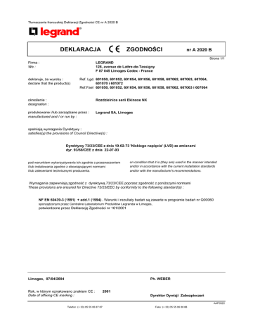 Tłumaczenie francuskiej Deklaracji Zgodności CE nr A 2020 B DEKLARACJA ZGODNOŚCI nr A 2020 B Strona 1/1 Firma : We : LEGRAND 128, avenue de Lattre-de-Tassigny F 87 045 Limoges Cedex - France deklaruje, że wyroby : declare that the product(s) Ref. Lgd. 601050, 601052, 601054, 601056, 601058, 607062, 607063, 607064, 601070 i 601072 Ref.Fael 601050, 601052, 601054, 601056, 601058, 607062, 607063 i 607064 określenie : designation : Rozdzielnice serii Ekinoxe NX produkowane i/lub zarządzane przez : manufactured and / or run by : Legrand SA, Limoges spełniają wymagania Dyrektywy : satisfies(y) the provisions of Council Directive(s) : Dyrektywy 73/23/CEE z dnia 19-02-73 'Niskiego napięcia' (LVD) ze zmianami dyr. 93/68/CEE z dnia 22-07-93 pod warunkiem wykorzystywania ich zgodnie z przeznaczeniem i/lub instalowania zgodnie z obowiązującymi normami i/lub zaleceniami technicznymi producenta. on condition that it is (they are) used in the manner intended and/or in accordance with the current installation standards and/or with the manufacturer's recommendations. Wymagania zapewniają zgodność z dyrektywą 73/23/CEE poprzez zgodność z poniższymi normami These provisions are ensured for Directive 73/23/EEC by conformity to the following standard(s) : NF EN 60439-3 (1991) + add.1 (1994) . Warunki i rezultaty badań są zawarte w programie badań nr Q00060 sporządzonym przez Centralne Laboratorium Produktów Legranda w Limoges, potwierdzone przez Deklarację Zgodności nr 161/2001 Limoges, 07/04/2004 Ph. WEBER Rok, w którym oznakowano znakiem CE : Date of affixing CE marking : 2001 Dyrektor Dywizji Zabezpieczeń AAF052C Telefon :(+ 33) 05 55 06 87 87 Faks :(+ 33) 05 55 06 88 88