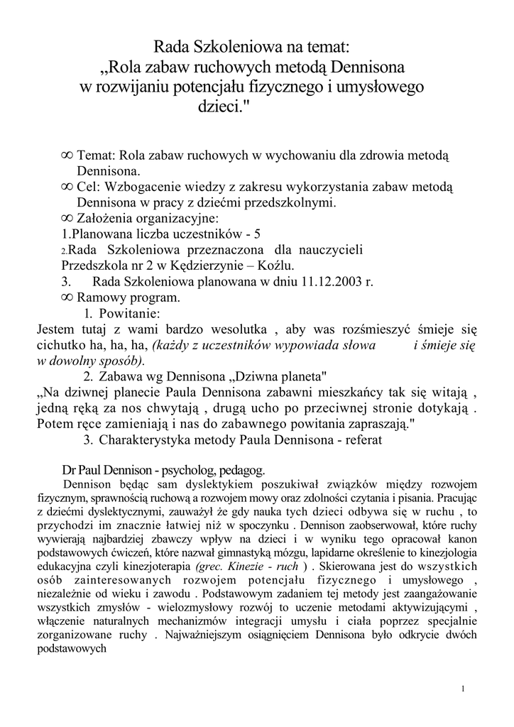 Rada Szkoleniowa na temat: „Rola zabaw ruchowych metodą Dennisona w rozwijaniu potencjału fizycznego i umysłowego dzieci." • Temat: Rola zabaw ruchowych w wychowaniu dla zdrowia metodą Dennisona. • Cel: Wzbogacenie wiedzy z zakresu wykorzystania zabaw metodą Dennisona w pracy z dziećmi przedszkolnymi. • Założenia organizacyjne: 1.Planowana liczba uczestników - 5 2.Rada Szkoleniowa przeznaczona dla nauczycieli Przedszkola nr 2 w Kędzierzynie – Koźlu. 3. Rada Szkoleniowa planowana w dniu 11.12.2003 r. • Ramowy program. 1. Powitanie: Jestem tutaj z wami bardzo wesolutka , aby was rozśmieszyć śmieje się cichutko ha, ha, ha, (każdy z uczestników wypowiada słowa i śmieje się w dowolny sposób). 2. Zabawa wg Dennisona „Dziwna planeta" „Na dziwnej planecie Paula Dennisona zabawni mieszkańcy tak się witają , jedną ręką za nos chwytają , drugą ucho po przeciwnej stronie dotykają . Potem ręce zamieniają i nas do zabawnego powitania zapraszają." 3. Charakterystyka metody Paula Dennisona - referat Dr Paul Dennison - psycholog, pedagog. Dennison będąc sam dyslektykiem poszukiwał związków między rozwojem fizycznym, sprawnością ruchową a rozwojem mowy oraz zdolności czytania i pisania. Pracując z dziećmi dyslektycznymi, zauważył że gdy nauka tych dzieci odbywa się w ruchu , to przychodzi im znacznie łatwiej niż w spoczynku . Dennison zaobserwował, które ruchy wywierają najbardziej zbawczy wpływ na dzieci i w wyniku tego opracował kanon podstawowych ćwiczeń, które nazwał gimnastyką mózgu, lapidarne określenie to kinezjologia edukacyjna czyli kinezjoterapia (grec. Kinezie - ruch ) . Skierowana jest do wszystkich osób zainteresowanych rozwojem potencjału fizycznego i umysłowego , niezależnie od wieku i zawodu . Podstawowym zadaniem tej metody jest zaangażowanie wszystkich zmysłów - wielozmysłowy rozwój to uczenie metodami aktywizującymi , włączenie naturalnych mechanizmów integracji umysłu i ciała poprzez specjalnie zorganizowane ruchy . Najważniejszym osiągnięciem Dennisona było odkrycie dwóch podstawowych 1 ruchów, za co otrzymał bardzo prestiżową nagrodę , tj. ruchu naprzemiennego i mchu jednostronnego, Na co pomaga metoda Dennisona: • Poprawia funkcjonowanie w orientacji przestrzennej w wymiarach prawo lewo, góra - dół, przód - tył (w obrębie własnego ciała), • Pokonuje lub zmniejsza stres i napięcia wynikające z trudności życia codziennego, • Pozwala lepiej komunikować się z innymi ludźmi, • Poprawia koncentrację dowolną, • Usprawnia myślenie globalne , asocjacyjne (wiedzę nowo nabytą włączamy w już posiadaną), • Przezwycięża trudności związane z dysleksją, dysgrafią i dysortografią, • Zwiększa się spostrzegawczość, • Pomaga w zapamiętywaniu materiału, zwiększa się efektywność, tempo uczenia a co najważniejsze - bezstresowość, • Usprawnia zmysły np, : wzrok, słuch. Dlaczego tak się dzieje : • Praca prawej i lewej półkuli, • Ilość połączeń między półkulami jest różne u kobiet i u mężczyzn . Ilość połączeń tworzy się w okresie noworodkowym, w którym ważne jest jak największa ilość ćwiczeń, • Chłopcy mają mniej połączeń dlatego więcej jest wśród nich dyslektyków z trudnościami w nauce czytania i pisania, • Funkcjonowanie w obrębie prawej i lewej półkuli - w stresie - ogniwo połączeń przestaje prawidłowo funkcjonować np. sytuacja egzaminacyjna lub reakcje obronne na stres w szoku, Metoda ta ma na celu zintegrowanie pracy mózgu, gdyż zdaniem Dennisona wiele problemów intelektualnych i emocjonalnych w życiu człowieka wynika ze złego współdziałania obu półkul mózgowych i z braku integracji między nimi bo mózg jest narzędziem symetrycznym, a każda półkula ma inne zadania, Prawa półkula mózgu zwana - artystyczną jest odpowiedzialna za uczucia, wyobraźnię, ogólny obraz, emocje, znaczenie, długą pamięć, prawdziwe wielowymiarowe uczenie się, syntezę, zrozumienie języka, rytm, płynność, wymowa, intuicja, intuicja oszacowana (ocena), podobieństwa, spontaniczność, płynność myślenia o wielu rzeczach w tym samym czasie, doświadczenia, ukierunkowanie na chwilę obecną, percepcję wzrokową, reakcje automotoryczne (odruch), odbiór informacji, rozproszenie. Lewa półkula mózgu zwana - logiczną (naukową) (u osób praworęcznych) odpowiada zaś za : myśli, analizę sytuacji życiowych, części składowe języka, składnię, semantykę, litery, zdania, zasób słów, liczby, analizę liniowa, różnice, planowanie, organizację, myślenie sekwencyjne, język, ukierunkowanie na przyszłość, przetwarzanie danych, spostrzeganie, wnioskowanie, poczucie czasu, percepcję słuchową, reakcje świadome(kontrola), czynności wyuczone, przekaz informacji, skupienie, widzenie szczegółów, przypisywanie faktów, kontrolę nad słowem, porozumiewanie się werbalne, pamięć krótka - czyli jest ona logiczna i postrzega poszczególne elementy. 2 Dzięki harmonijnej współpracy obu półkul mózgowych dzieci jak i dorośli z łatwością , przyswajają sobie nową wiedzę, umiejętności, Brak równowagi między pracą obu półkul mózgowych zdaniem Dennisona, prowadzi do powstania różnego rodzaju zakłóceń, dziecko może mieć problemy np. w nauce czytania, pisania, z koncentracją uwagi, wyrażaniem własnych emocji . Paul Dennison twierdzi , że powstałe zaburzenia „blokady" można zlikwidować poprzez ruch . Proponuje on ćwiczenia bardzo łatwe i bezpieczne, które wykonywane pod kierunkiem terapeuty prowadzą do integracji obu półkul, czego efektem może być np. płynne czytanie lub poprawa koncentracji uwagi dziecka na własnych ruchach i działaniu . Dennison odkrył, że funkcje mózgu ludzkiego są trójwymiarowe tak, że stanowią całość. Proces kształcenia może być miły i przystępny, pod warunkiem, że zostanie prowadzony wielowymiarow