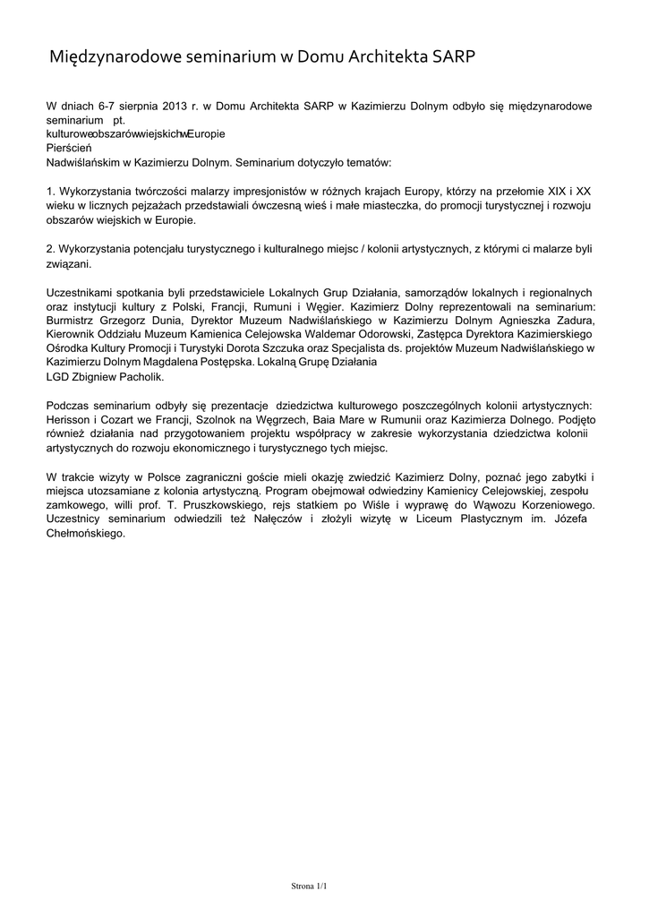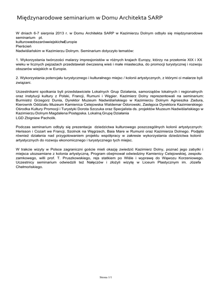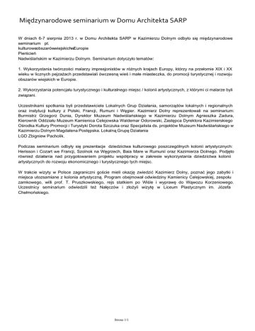 Międzynarodowe seminarium w Domu Architekta SARP W dniach 6-7 sierpnia 2013 r. w Domu Architekta SARP w Kazimierzu Dolnym odbyło się międzynarodowe seminarium pt. kulturoweobszarówwiejskichwEuropie Pierścień Nadwiślańskim w Kazimierzu Dolnym. Seminarium dotyczyło tematów: 1. Wykorzystania twórczości malarzy impresjonistów w różnych krajach Europy, którzy na przełomie XIX i XX wieku w licznych pejzażach przedstawiali ówczesną wieś i małe miasteczka, do promocji turystycznej i rozwoju obszarów wiejskich w Europie. 2. Wykorzystania potencjału turystycznego i kulturalnego miejsc / kolonii artystycznych, z którymi ci malarze byli związani. Uczestnikami spotkania byli przedstawiciele Lokalnych Grup Działania, samorządów lokalnych i regionalnych oraz instytucji kultury z Polski, Francji, Rumuni i Węgier. Kazimierz Dolny reprezentowali na seminarium: Burmistrz Grzegorz Dunia, Dyrektor Muzeum Nadwiślańskiego w Kazimierzu Dolnym Agnieszka Zadura, Kierownik Oddziału Muzeum Kamienica Celejowska Waldemar Odorowski, Zastępca Dyrektora Kazimierskiego Ośrodka Kultury Promocji i Turystyki Dorota Szczuka oraz Specjalista ds. projektów Muzeum Nadwiślańskiego w Kazimierzu Dolnym Magdalena Postępska. Lokalną Grupę Działania LGD Zbigniew Pacholik. Podczas seminarium odbyły się prezentacje dziedzictwa kulturowego poszczególnych kolonii artystycznych: Herisson i Cozart we Francji, Szolnok na Węgrzech, Baia Mare w Rumunii oraz Kazimierza Dolnego. Podjęto również działania nad przygotowaniem projektu współpracy w zakresie wykorzystania dziedzictwa kolonii artystycznych do rozwoju ekonomicznego i turystycznego tych miejsc. W trakcie wizyty w Polsce zagraniczni goście mieli okazję zwiedzić Kazimierz Dolny, poznać jego zabytki i miejsca utozsamiane z kolonia artystyczną. Program obejmował odwiedziny Kamienicy Celejowskiej, zespołu zamkowego, willi prof. T. Pruszkowskiego, rejs statkiem po Wiśle i wyprawę do Wąwozu Korzeniowego. Uczestnicy seminarium odwiedzili też Nałęczów i złożyli wizytę w Liceum Plastycznym im. Józefa Chełmońskiego. Strona 1/1 Powered by TCPDF (www.tcpdf.org)