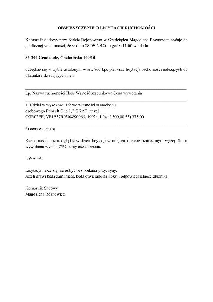 OBWIESZCZENIE O LICYTACJI RUCHOMOŚCI Komornik Sądowy przy Sądzie Rejonowym w Grudziądzu Magdalena Różnowicz podaje do publicznej wiadomości, że w dniu 28-09-2012r. o godz. 11:00 w lokalu: 86-300 Grudziądz, Chełmińska 109/10 odbędzie się w trybie ustalonym w art. 867 kpc pierwsza licytacja ruchomości należących do dłużnika i składających się z: ___________________________________________________________________________ Lp. Nazwa ruchomości Ilość Wartość szacunkowa Cena wywołania ___________________________________________________________________________ 1. Udział w wysokości 1/2 we własności samochodu osobowego Renault Clio 1,2 GKAT, nr rej. CGR02EE, VF1B57R0508890965, 1992r. 1 [szt.] 500,00 **) 375,00 ___________________________________________________________________________ *) cena za sztukę Ruchomości można oglądać w dzień licytacji w miejscu i czasie oznaczonym wyżej. Suma wywołania wynosi 75% sumy oszacowania. UWAGA: Licytacja może się nie odbyć bez podania przyczyny. Jeżeli drzwi będą zamknięte, będą otwierane na koszt i odpowiedzialność dłużnika. Komornik Sądowy Magdalena Różnowicz