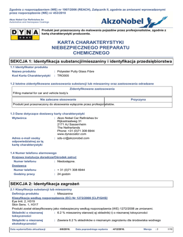 Zgodnie z rozporządzeniem (WE) nr 1907/2006 (REACH), Załącznik II, zgodnie ze zmianami wprowadzonymi przez rozporządzenie (WE) nr 453/2010 Akzo Nobel Car Refinishes bv Automotive and Aerospace Coatings Produkt jest przeznaczony do malowania pojazdów przez profesjonalistów, zgodnie z kartą charakterystyki producenta. KARTA CHARAKTERYSTYKI NIEBEZPIECZNEGO PREPARATU CHEMICZNEGO SEKCJA 1: Identyfikacja substancji/mieszaniny i identyfikacja przedsiębiorstwa 1.1 Identyfikator produktu Nazwa produktu : Polyester Putty Glass Fibre Kod Karta Charakterystyki : TRO005 1.2 Istotne zidentyfikowane zastosowania substancji lub mieszaniny oraz zastosowania odradzane Zidentyfikowane zastosowania Filling material for car and vehicle body’s Nie zalecane stosowanie Przyczyna Produkt jest przeznaczony do stosowania wyłącznie przez profesjonalistów. 1.3 Dane dotyczące dostawcy karty charakterystyki Wytwórca Adres e-mail osoby odpowiedzialnej za tą kartę charakterystyki : Akzo Nobel Car Refinishes bv Rijksstraatweg 31 2171 AJ Sassenheim The Netherlands Phone: +31 (0)71 308 6944 www.dynacoatcr.com : [email protected] 1.4 Numer telefonu alarmowego Krajowa instytucja doradcza/Ośrodek zatruć Numer telefonu : Niedostępne. Dostawca Numer telefonu : + 31 (0)71 308 6944 Godziny pracy : 24 godzin SEKCJA 2: Identyfikacja zagrożeń 2.1 Klasyfikacja substancji lub mieszaniny Definicja produktu : Mieszanina Klasyfikacja według rozporządzenia (EC) Nr 1272/2008 [CLP/GHS] Eye Irrit. 2, H319 Skin Sens. 1, H317 Produkt został sklasyfikowany jako niebezpieczny według rozporządzenia (WE) 1272/2008 ze zmianami. Składniki o nieznanej : 6.2 % mieszaniny stanowi(-ą) składnik(-i) o nieznanej toksyczności toksyczności Skłądniki o nieznanej ekotoksyczności Data wydania/Data aktualizacji : Zawiera 6.2 % składników o nieznanym zagrożeniu dla środowiska wodnego : 6/6/2016. Data poprzedniego wydania : 4/12/2016. Wersja :3 1/16 Zgodnie z rozporządzeniem (WE) nr 1907/2006 (REACH), Załącznik II, zgodnie ze zmianami wprowadzonymi przez rozporządzenie (WE) nr 453/2010 Polyester Putty Glass Fibre SEKCJA 2: Identyfikacja zagrożeń Klasyfikacja według Dyrektywy 1999/45/WE [DPD] Produkt ten jest sklasyfikowany jako niebezpieczny w rozumieniu Dyrektywy 1999/45/EC wraz z jej późniejszymi zmianami. Klasyfikacja : O; R7 Xi; R36 R43 Zagrożenia fizyczne/ : Może spowodować pożar. chemiczne Zagrożenia ludzkiego zdrowia : Działa drażniąco na oczy. Może powodować uczulenie w kontakcie ze skórą. Pełny tekst powyższych zwrotów R lub uwag H podano w punkcie 16. Bardziej szczegółowe informacje dotyczące wpływu na stan zdrowia oraz ewentualnych objawów można znaleźć w rozdziale 11. 2.2 Elementy oznakowania Piktogramy zagrożeń : Hasło ostrzegawcze : Uwaga Zwroty wskazujące rodzaj zagrożenia : Działa drażniąco na oczy. Może powodować reakcję alergiczną skóry. Zwroty wskazujące środki ostrożności Zapobieganie : Stosować rękawice ochronne. Reagowanie : Nie dotyczy. Przechowywanie : Nie dotyczy. Usuwanie : Nie dotyczy. Niebezpieczne składniki : nadtlenek dibenzoilowy Uzupełniające elementy etykiety : Nie dotyczy. Ograniczenia dotyczące : Nie dotyczy. produkcji, wprowadzania do obrotu i stosowania niektórych niebezpiecznych substancji, preparatów i wyrobów Specjalne wymagania dotyczące pakowania Pojemniki powinny być wyposażone w zamknięcia uniemożliwiające otworzenie ich przez dzieci : Nie dotyczy. Dotykowe ostrzeżenia przed niebezpieczeństwem : Nie dotyczy. 2.3 Inne zagrożenia Data wydania/Data aktualizacji : 6/6/2016. Data poprzedniego wydania : 4/12/2016. Wersja :3 2/16 Zgodnie z rozporządzeniem (WE) nr 1907/2006 (REACH), Załącznik II, zgodnie ze zmianami wprowadzonymi przez rozporządzenie (WE) nr 453/2010 Polyester Putty Glass Fibre SEKCJA 2: Identyfikacja zagrożeń Inne zagrożenia nie odzwierciedlone w klasyfikacji : Nie znane. SEKCJA 3: Skład/informacja o składnikach 3.2 Mieszaniny : Mieszanina Klasyfikacja Nazwa produktu/ składnika Talc , not containing asbestiform fibres Identyfikatory WE: 238-877-9 CAS: 14807-96-6 nadtlenek dibenzoilowy WE: 202-327-6 % 67/548/EWG ≥50 - <75 Nie sklasyfikowany. Nie sklasyfikowany. [2] ≥25 - <50 E; R3 Org. Perox. B, H241 Eye Irrit. 2, H319 Skin Sens. 1, H317 [1] [2] Nie sklasyfikowany. [2] Nie sklasyfikowany. [2] CAS: 94-36-0 Indeks: 617-008-00-0 Pyły ditlenku tytanu WE: 236-675-5 CAS: 13463-67-7 zawartość krzemionki WE: 238-878-4 krystalicznej jako kwarc CAS: 14808-60-7 styren WE: 202-851-5 CAS: 100-42-5 Indeks: 601-026-00-0 ≥1 - <3 O; R7 Xi; R36 R43 Nie sklasyfikowany. ≥1 - <3 Nie sklasyfikowany. ≥0.3 - <1 R10 Repr. Cat. 3; R63 Xn; R20, R48/20 Xi; R36/38 Rozporządzenie (WE) Nr 1272/2008 [CLP] Flam. Liq. 3, H226 Acute Tox. 4, H332 Skin Irrit. 2, H315 Eye Irrit. 2, H319 Repr. 2, H361d (Płód) STOT RE 1, H372 (narząd słuchu) Patrz Sekcja 16 - Pełny tekst pełny tekst powyzszych zadeklarowanych uwag H podano wyżej Fraz-R. w Sekcji 16. Typ [1] [2] Nie zawiera dodatkowych składników, które w świetle obecnej wiedzy dostawcy oraz w danym stężeniu są klasyfikowane jako niebezpieczne dla zdrowia lub otoczenia, lub klasyfikowane są jako PBT lub vPvB bądź jako substancje wywołujące równorzędne obawy, lub które mogą występować w środowisku pracy jedynie w ograniczonym zakresie, w związku z czym muszą zostać wymienione w niniejszym ustępie. Typ [1] Substancja sklasyfikowana jako szkodliwa dla zdrowia lub środowiska [2] Substancja, dla której wyznaczono dopuszczalne stężenie w środowisku pracy [3] Substancja spełnia kryteria dla jej zaklasyfikowania jako PBT zgodnie z Rozporządzeniem (WE) Nr 1907/2006, Aneks XIII [4] Substancja spełnia kryteria dla jej zaklasyfikowania jako vPvB zgodnie z Rozporządzeniem (WE) Nr 1907/2006, Aneks XIII [5] Substancja wywołująca równorzędne obawy Najwyższe dopuszczalne stężenia, jeśli są dostępne, są wymienione w Sekcji 8. Data wydania/Data