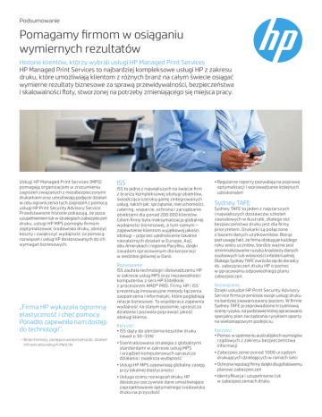 Podsumowanie Pomagamy firmom w osiąganiu wymiernych rezultatów Historie klientów, którzy wybrali usługi HP Managed Print Services HP Managed Print Services to najbardziej kompleksowe usługi HP z zakresu druku, które umożliwiają klientom z różnych branż na całym świecie osiągać wymierne rezultaty biznesowe za sprawą przewidywalności, bezpieczeństwa i skalowalności floty, stworzonej na potrzeby zmieniającego się miejsca pracy. Usługi HP Managed Print Services (MPS) pomagają organizacjom w zrozumieniu zagrożeń związanych z niezabezpieczonymi drukarkami oraz umożliwiają podjęcie działań w celu ograniczenia tych zagrożeń z pomocą usługi HP Print Security Advisory Service. Przedstawione historie pokazują, że poza uzupełnieniem luk w strategiach zabezpieczeń druku, usługi HP MPS pomogły firmom zoptymalizować środowisko druku, obniżyć koszty i zwiększyć wydajność za pomocą rozwiązań i usług HP dostosowanych do ich wymagań biznesowych. „Firma HP wykazała ogromną elastyczność i chęć pomocy. Ponadto zapewniła nam dostęp do technologii”. – Brian Fortney, zastępca wiceprezesa ds. działań infrastrukturalnych MetLife ISS ISS to jedna z największych na świecie firm z branży kompleksowej obsługi obiektów, świadcząca szeroką gamę zintegrowanych usług, takich jak: sprzątanie, nieruchomości, catering, wsparcie, ochrona i zarządzanie obiektami dla ponad 200 000 klientów. Celem firmy była maksymalizacja globalnej wydajności biznesowej, a tym samym – zapewnienie klientom wyjątkowej jakości obsługi – poprzez ujednolicenie lokalnie niezależnych działań w Europie, Azji, obu Amerykach i regionie Pacyfiku, dzięki zasadom opracowanym dla korporacji w siedzibie głównej w Danii. Rozwiązanie ISS zaufała technologii i doświadczeniu HP w zakresie usług MPS oraz niezawodności komputerów z serii HP EliteBook z procesorem AMD® PRO. Firmy HP i ISS prezentują innowacyjne metody łączenia zaopatrzenia i informatyki, które pogłębiają relacje biznesowe. Ta współpraca zapewnia wydajność na stałym poziomie, upraszcza działania i pozwala poprawiać jakość obsługi klienta. Korzyści •ISS dąży do obniżenia kosztów druku nawet o 30–35%1 •Scentralizowana strategia z globalnymi standardami w zakresie usług MPS i urządzeń komputerowych upraszcza działania i zwiększa wydajność •Usługi HP MPS zapewniają globalny zasięg przy lokalnej elastyczności •Usługa oceny rozwiązań druku HP dostarcza rzeczywiste dane umożliwiające zaprojektowanie optymalnego środowiska druku na przyszłość •Regularne raporty pozwalają na poprawę optymalizacji i wprowadzanie kolejnych udoskonaleń Sydney TAFE Sydney TAFE to jeden z najstarszych i największych dostawców szkoleń zawodowych w Australii, dlatego też bezpieczeństwo druku jest dla firmy priorytetem. Drukarki są połączone z bazami danych użytkowników. Biorąc pod uwagę fakt, że firma obsługuje każdego roku wielu uczniów, bardzo ważne jest zminimalizowanie ryzyka kradzieży danych osobowych lub własności intelektualnej. Dlatego Sydney TAFE zwróciła się do doradcy ds. zabezpieczeń druku HP o pomoc w opracowaniu odpowiedniego planu zabezpieczeń. Rozwiązanie Dzięki usłudze HP Print Security Advisory Service firma przeniosła swoje usługi druku na bardziej zaawansowany poziom. W firmie Sydney TAFE przeprowadzono trzydniową ocenę ryzyka, na podstawie której opracowano specjalny plan zarządzania ryzykiem oparty na wieloetapowym podejściu. Korzyści •Pomoc w spełnieniu australijskich wymogów rządowych z zakresu bezpieczeństwa informacji •Zabezpieczenie ponad 1000 urządzeń drukujących działających w ramach sieci •Ochrona reputacji firmy dzięki długofalowemu planowi zabezpieczeń •Identyfikacja i uzupełnianie luk w zabezpieczeniach druku Podsumowanie | Historie klientów, którzy wybrali usługi HP Managed Print Services „Usługa HP Print Security Advisory Service pomogła nam w płynnym rozszerzeniu kontroli bezpieczeństwa infrastruktury i usług druku. Dzięki firmie HP lepiej rozumiemy zagrożenia dla floty drukarek, a plan zabezpieczeń pomógł w określeniu działań mających na celu wyeliminowanie tych zagrożeń”. – J ohn Myles, starszy technik ds. aplikacji biznesowych, usługi technologiczne, Sydney TAFE W ubiegłym roku dzięki drukowi dwustronnemu firma Principal zaoszczędziła milion arkuszy papieru miesięcznie, co pozwoliło zmniejszyć całkowity koszt samego papieru o ponad 30 000 USD. Organizacje wybrały usługi HP MPS w celu: •Zwiększenia wydajności w skali globalnej oraz standaryzacji urządzeń •Wzmocnienia zabezpieczeń i zwiększenia mobilności dzięki takim usługom, jak HP Access Control i HP Capture and Route •Realizacji celów biznesowych i celów z zakresu ochrony środowiska przy jednoczesnym obniżeniu kosztów •Identyfikacji ryzyka i opracowania planu wprowadzenia zabezpieczeń Principal Principal z siedzibą w Des Moines w stanie Iowa jest czołową firmą świadczącą globalne usługi finansowe, które obejmują programy emerytalne, ubezpieczenia oraz produkty inwestycyjne. Po pięciu latach od pomyślnego wdrożenia usług HP MPS firma Principal chce wykorzystać je jako podstawę do dalszego wzmacniania bezpieczeństwa dokumentów, obniżania zużycia papieru, upraszczania procesu skanowania oraz ułatwiania wprowadzenia nowej strategii w przyszłości. Rozwiązanie Firma Principal wdrożyła rozwiązania HP Access Control (HP AC) oraz HP Capture and Route w ramach sprawdzonych usług HP Managed Print Services. Korzyści •Zadania druku można pobierać z kolejki HP AC po uwierzytelnieniu za pomocą karty z dowolnego urządzenia wielofunkcyjnego w ramach sieci firmowej •Zadania druku, które nie zostaną pobrane przez użytkowników, są usuwane z kolejki po upływie 24 godzin •Poprzez łatwe uwierzytelnianie za pomocą karty zeskanowane dokumenty s