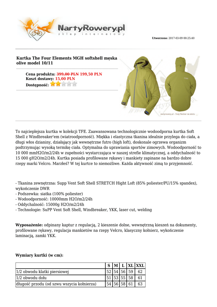 Utworzono: 2017-03-09 00:25:40 Kurtka The Four Elements MGH softshell męska olive model 10/11 Cena produktu: 399,00 PLN 199,50 PLN Koszt dostawy: 15,00 PLN Dostępność: To najcieplejsza kurtka w kolekcji TFE. Zaawansowana technologicznie wodoodporna kurtka Soft Shell z Windbreaker'em (wiatroodporność). Miękka i elastyczna tkanina idealnie przylega do ciała, a długi włos dzianiny, działający jak wewnętrzne futro (high loft), doskonale ogrzewa organizm podtrzymując wysoką termikę ciała. Optymalna do uprawiania sportów zimowych. Wodoodporność to 10 000 mmH2O/m2/24h w zupełności wystarczająca w naszej strefie klimatycznej, a oddychalność to 15 000 gH2O/m2/24h. Kurtka posiada profilowane rękawy i mankiety zapinane na bardzo dobre rzepy marki Velcro. Marzłeś? W tej kurtce to niemożliwe. Każda aktywność zimą to przyjemność. - Tkanina zewnętrzna: Supp Vent Soft Shell STRETCH Hight Loft (85% poliester/PU/15% spandex), wykończenie DWR - Podszewka: siatka (100% poliester) - Wodoodporność: 10000mm H2O/m2/24h - Oddychalność: 15000g H2O/m2/24h - Technologie: SuPP Vent Soft Shell, Windbreaker, YKK, laser cut, welding Wyposażenie: odpinany kaptur z regulacją, 2 kieszenie dolne, wewnętrzną kieszeń na dokumenty, profilowane rękawy, regulacja mankietów na rzepy Velcro, klasyczny kołnierz, wykończenie laminacją, zamki YKK. Wymiary kurtki (w cm): S M L XL XXL 1/2 obwodu klatki piersiowej 52 54 56 59 62 1/2 obwodu dołu 51 53 55 58 61 długość przodu (od szwu wszycia kołnierza) 54 56 58 61 63 długość tyłu (od szwu wszycia kołnierza) 69 71 73 76 78 długość rękawa (od szwu wszycia do końca rękawa) 86 88 90 92 94 Kilka słów o marce TFE 1. Co oznacza nazwa marki The Four Elements® (TFE)? Nazwa marki oznacza cztery żywioły występujące w przyrodzie: wodę, ogień, powietrze i ziemię. Od samego początku istnienia marka jest zarejestrowanym znakiem towarowym - ®, który świadczy o tym, że jest to solidna marka. 2. Jak długo marka istnieje? Wszystko zaczęło się od marzenia o własnej firmie outdoorowej już w latach 80. Ale z punktu widzenia klienta jest to zupełnie nowa, świeża marka na rynku. Pierwsza kolekcja to kurtki jesień/zima 2010. 3. Jakie jest pochodzenie marki? Są to europejskie produkty z polskim rodowodem. Siedziba główna firmy jest w Polsce, ale produkty tej marki będą promowane jako europejskie; po pierwsze ze względu na przynależność Polski do Unii Europejskiej, po drugie, dlatego, że sprzedaż marki będzie rozwijać się również na rynku azjatyckim. 4. Kto jest właścicielem marki? Właścicielem marki The Four Elements jest polski projektant i konstruktor odzieży technicznej, który związany jest z branżą outdoorową od ok. 20 lat i współpracował z najlepszymi firmami w branży. 5. Kto projektuje odzież? Założyciel marki TFE zebrał i zachęcił do współpracy młodych i zdolnych projektantów, którzy pod jego kierownictwem projektują odzież. 6. Gdzie szyje się odzież TFE? Na Dalekim Wschodzie. W fabryce, która ma najnowocześniejszy park maszynowy i długie doświadczenie w produkcji odzieży technicznej – sportowej. 7. Dlaczego membrana SuPP Vent ma być lepsza od innych? I czy jest wystarczająca? Membrana SuPP Vent jest tak samo skuteczna i trwała jak inne membrany poliuretanowe. Producent marki zdecydował się nadać jej inną nazwę handlową dla odróżnienia jej na rynku. A było to możliwe z powodu doświadczenia i gwarancji popartych długoletnią współpracą z dostawcą, a co za tym idzie możliwością kreowania samodzielnie pewnych rozwiązań w procesie tworzenia tkanin i dzianin, tylko i wyłącznie na potrzeby marki TFE. Najniższy poziom wodoodporności i oddychalności membrany zastosowany w produktach TFE to 10 000, a w naszej strefie klimatycznej do aktywności wystarczający jest poziom 6 000-8 000. 8. Czym różnią się te produkty od innych i dlaczego miałyby być lepsze? Produkty TFE tworzy zespół ludzi, którzy związani są z branżą outdoorową od kilku do kilkunastu lat, więc znają specyfikę produktów oraz potrzeby klientów. Tworząc odzież kierują się 4 zasadami takimi jak: jakość, design (dizajn), funkcjonalność oraz trwałość produktów. 9. Jakie są powiązania tej marki z innymi markami na rynku outdoorowym? Nie ma żadnych powiązań z istniejącymi firmami czy markami. Jest to oddzielna i niezależna spółka z o.o. ze wsparciem inwestora zagranicznego. 10. Jak będzie wyglądał serwis gwarancyjny i pogwarancyjny? Standardowa gwarancja jest 2-letnia. Tak jak inni producenci TFE oferuje serwis. W okresie gwarancyjnym jest to zamiana produktu na nowy (jeśli dostępny) lub zwrot pieniędzy. Po gwarancji będzie to odpłatna wymiana zużytych komponentów bądź naprawa innego typu uszkodzeń. 11. Z jakich tkanin, dzianin i dodatków produkuje się kolekcję TFE? Doświadczenie członków firmy pozwala korzystać ze sprawdzonych materiałów niezależnie czy są to tkaniny i dzianiny czy detale wykończeniowe. W odzieży TFE wszystko jest wypróbowanej jakości bądź markowe choć czasami ma nazwę własną, nadaną specjalnie dla marki The Four Elements. Należy pamiętać, że w oparciu o najnowsze technologie odzież TFE jest laserowo cięta, zgrzewana i spawana na gorąco, co gwarantuje najlepszą dostępną dziś jakość wytwarzania produktów w postaci lżejszego, bardziej bezpiecznego, funkcjonalnego i komfortowego produktu. 12. W jakich krajach sprzedawane są produkty marki TFE? Obecnie produkty TFE sprzedawane są w Polsce i Korei Południowej. Pracujemy nad poszerzeniem sprzedaży kolejnych kolekcji na innych rynkach europejskich i azjatyckich. Płeć Męska Producent The Four Elements Rozmiary S, M, L, XL, XXL Wodoodporność 6000-10000 mm Kolory Kolekcja Adres: http://nartyrowery.pl/ Oliwkowy zima 2010/11 Telefon: 34 365 66 09 Email: [email protected] Gadu-Gadu: Skype: