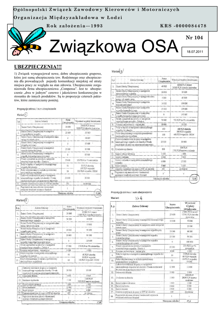 Ogólnopolski Związek Zawodowy Kierowców i Motorniczych Organizacja Międzyzakładowa w Łodzi Rok załoŜenia—1993 KRS -0000084478 Związkowa OSA UBEZPIECZENIA!!! 1) Związek wynegocjował nowe, dobre ubezpieczenie grupowe, które jest sumą ubezpieczenia tzw. Rodzinnego oraz ubezpieczenia dla prowadzących pojazdy komunikacji miejskiej od utraty miejsca pracy ze względu na stan zdrowia. Ubezpieczenie zorganizowała firma ubezpieczeniowa „Compensa”. Jest to ubezpieczenie „dwa w jednym” cenowo i jakościowo konkurencyjne w stosunku do innych produktów. Są to propozycje czterech pakietów, które zamieszczamy poniŜej. Nr 104 18.07.2011 STR. 2 ZW I Ą ZK OW A O S A 2) Firma Generali, w której ubezpieczeni są członkowie naszego Związku, pracownicy naszej firmy oraz ich rodziny zaproponowała dwa pakiety dotyczące niezdolności zarobkowej kierowcy lub motorniczego wykonywanej na podstawie stosunku pracy lub umowy cywilno-prawnej. A więc dotyczy nie tylko pracowników naszych firm lecz równieŜ współpracujących z naszym Związkiem kierowców i motorniczych i jest konkurencyjny w stosunku do juŜ istniejącego podobnego pakietu, który Związek nasz podpisał kilka lat wcześniej z inną firmą ubezpieczeniową. Pakiety podajemy poniŜej. Wszystkich zainteresowanych tym ubezpieczeniem prosimy o kontakt z naszym Związkiem. Usługa bankowa Związek nasz podjął współpracę z bankiem Pocztowym. Wynikiem tej współpracy jest fakt, iŜ wszyscy nasi pracownicy, którzy zgłoszą się po kredyt do wyŜej wymienionego banku (dowodem na to, Ŝe się jest pracownikiem naszej firmy jest zaświadczenie o zarobkach) otrzymują ten kredyt na preferencyjnych warunkach. Kredyt jest na pewno konkurencyjny w stosunku do innych banków. Wszystkich zainteresowanych prosimy o kontakt z doradcą w banku pod numerem telefonu 782-384-084. Imprezy plenerowe Związek nasz dla swoich członków i ich rodzin organizuje wyjazd na grzyby do miejscowości Sielpia. W dniach 16-18.09.2011. Cena..biletu..od..osoby..100..zł (dla osób co będą jechać autobusem dodatkowo 20 zł). Zapisy oraz bliŜsze informacje moŜna uzyskać pod numerem telefonu 667-960-005 lub 643-40-22. Serdecznie zapraszamy -------------------------------------------------------------------------------Związek nasz dla swoich członków i ich najbliŜszej rodziny organizuje imprezę plenerową w dniu 24.09.2011 (piknik). Wszystkie osoby zainteresowane prosimy o zapisy na w/w imprezę pod numerem telefonu 667-960-005 lub 643-40-22. Osoby, które nie zapiszą się do dnia 10.09.2011 nie zostaną na tą imprezę wpuszczone. Związek zapewnia dobrą zabawę, smaczny posiłek, konkursy. KaŜdy zainteresowany za dobrą cenę moŜe nabyć jedzenie z grilla czy teŜ picie. Serdecznie zapraszamy Śmiechu warte!!!!! Mama pyta syna: - Co przerabialiście na chemii?? - Materiały wybuchowe. - Zadała Pani coś do domu? - Nie zdąŜyła... ••• Hotel, recepcjonistka pyta nowo przybyłej pary: - Urlop? - Tak.. - A dzieci Państwo posiadają? - Posiadają… - A to tym razem Państwo nie zabrali? 3) Firma ubezpieczeniowa PZU, z którą związek nasz ma podpisana umo- - Nie zabrali… wę na prowadzenie ubezpieczenia dla prowadzących pojazdy komunika- - A kto został z dziećmi? cji miejskiej tzw. „od utraty miejsca pracy ze względu na stan zdrowia” - śona proponuje swoim klientom, czyli poprzez nasz Związek uczestnictwo w KLUBIE PZU POMOC W śYCIU. Uczestnictwo w klubie jest bezpłatne. Uczestnik klubu ma zagwarantowanych bezpłatnie wiele atrakcyjKolegium redakcyjne: Zarząd Związku nych pomocy w codziennych problemach Ŝyciowych. Warunkiem uczestnictwa w wyŜej wymienionym Klubie jest wypełnienie formularza i Redaktor Naczelny: Henryk Naglewicz oświadczenie o przystąpieniu do Klubu PZU POMOC W śYCIU. Nr. Rejestru Sądowego 743 Wszystkich zainteresowanych klientów PZU, którzy zainteresowani tego typu usługą prosimy o kontakt z naszym Związkiem.