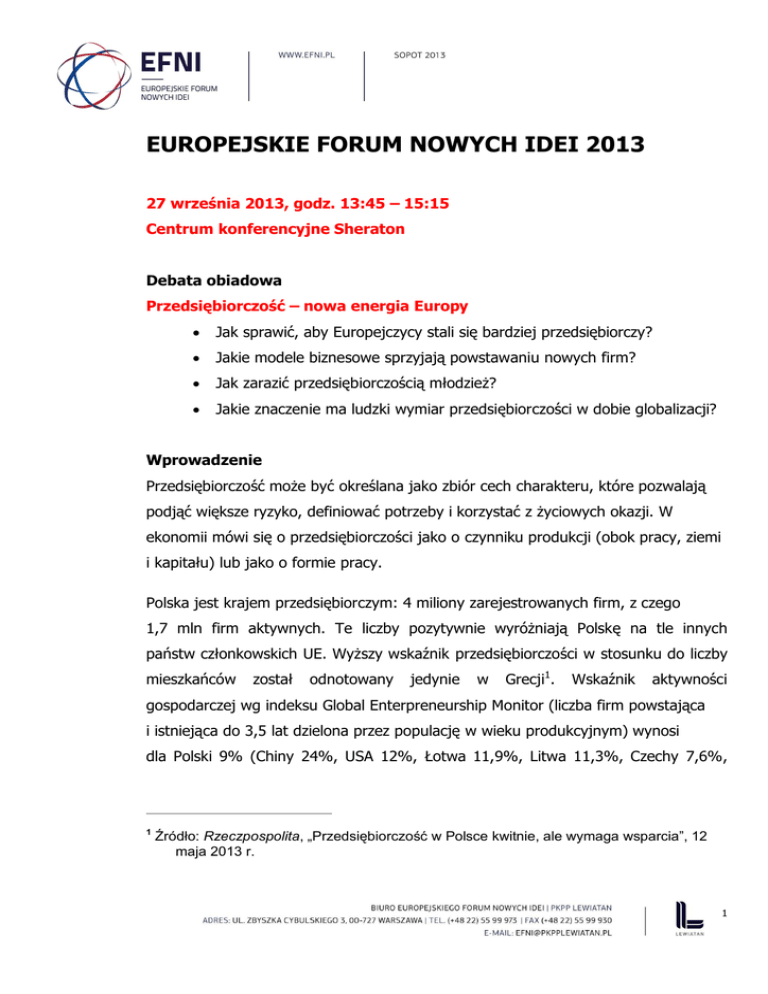 EUROPEJSKIE FORUM NOWYCH IDEI 2013 27 września 2013, godz. 13:45 – 15:15 Centrum konferencyjne Sheraton Debata obiadowa Przedsiębiorczość – nowa energia Europy Jak sprawić, aby Europejczycy stali się bardziej przedsiębiorczy? Jakie modele biznesowe sprzyjają powstawaniu nowych firm? Jak zarazić przedsiębiorczością młodzież? Jakie znaczenie ma ludzki wymiar przedsiębiorczości w dobie globalizacji? Wprowadzenie Przedsiębiorczość może być określana jako zbiór cech charakteru, które pozwalają podjąć większe ryzyko, definiować potrzeby i korzystać z życiowych okazji. W ekonomii mówi się o przedsiębiorczości jako o czynniku produkcji (obok pracy, ziemi i kapitału) lub jako o formie pracy. Polska jest krajem przedsiębiorczym: 4 miliony zarejestrowanych firm, z czego 1,7 mln firm aktywnych. Te liczby pozytywnie wyróżniają Polskę na tle innych państw członkowskich UE. Wyższy wskaźnik przedsiębiorczości w stosunku do liczby mieszkańców został odnotowany jedynie w Grecji1. Wskaźnik aktywności gospodarczej wg indeksu Global Enterpreneurship Monitor (liczba firm powstająca i istniejąca do 3,5 lat dzielona przez populację w wieku produkcyjnym) wynosi dla Polski 9% (Chiny 24%, USA 12%, Łotwa 11,9%, Litwa 11,3%, Czechy 7,6%, 1 Źródło: Rzeczpospolita, „Przedsiębiorczość w Polsce kwitnie, ale wymaga wsparcia”, 12 maja 2013 r. 1 Wielka Brytania 7,3%, Irlandia, 7,2%, Węgry 6,3%, Francja 5,7%, Niemcy 5,6%, Rosja 4,6%). W Polsce (wg GUS) dominują mikrofirmy zatrudniające do 9 pracowników, które stanowią 95,45% firm, następnie 3,68% to małe firmy (10-49 pracowników), 0,75% średnie firmy (50-249 pracowników), wreszcie 0,11% duże firmy (powyżej 250 pracowników). Polacy uważają się za ludzi przedsiębiorczych w związku z tym mogą odegrać szczególną rolę w promowaniu przedsiębiorczości w Unii Europejskiej. Jak sprawić, aby Europejczycy stali się bardziej przedsiębiorczy? W Europie kariera przedsiębiorcy cieszy się pozytywną opinią (68% Polaków, 65% Francuzów, 50% Niemców i Brytyjczyków uważa, że to dobry wybór drogi zawodowej2). Jednakże, według ostatniego badania Eurobarometru (czerwiec 2012) jedynie 37% respondentów wolało samozatrudnienie a aż 58% widzi się w roli pracownika. Z jednej strony przedsiębiorca jest statusem pożądanym, uznawanym za ideał życia zawodowego, a z drugiej uwidacznia się niechęć do ryzyka i preferencja dokonywania ostrożnych wyborów, dających gwarancje zatrudnienia. Europejczycy, w przeciwieństwie do Amerykanów nie potrafią pogodzić się z porażką swojej firmy. Jednocześnie 82% ankietowanych Europejczyków uważa, że przedsiębiorcy powinno się dawać drugą szansę. Ryzyko niepowodzenia jest ważnym czynnikiem zniechęcającym Europejczyków do założenia działalności 2 A global perspective on Entrepreneurship 2012, str. 21. 2 gospodarczej. W Polsce obawę przed porażką wyraziło w 2012 roku 22% ankietowanych3. Większość badanych Europejczyków (54%) woli rozpocząć swoją własną działalność, niż przejąć istniejącą firmę.4 Problemem mogą być procedury przejmowania firmy, a także bariery psychologiczne sukcesji – często pierwotny właściciel ma problem z „rozstaniem” się ze swoją firmą. Według danych Eurobarometru (2012) 67% samozatrudnionych europejskich przedsiębiorców rozpoczęło działalność od zera, 9% przejęło firmę od kogoś innego, a dla 17% ich biznes jest firmą rodzinną. Niemieccy ekonomiści Bloch i Wagner podkreślają rolę, jaką w przedsiębiorczości odgrywają indywidualne motywacje. Na podstawie badania, jakie przeprowadzili wśród niemieckich przedsiębiorców (wyniki opublikowano w 2010 r.) rozróżnili dwa typy przedsiębiorców: zakładających firmę w wyniku nadarzającej się okazji lub z konieczności. Te elementy determinują według nich powodzenie przedsięwzięcia, a poziom zysków zależy właśnie od wstępnej motywacji. Badacze podkreślili również, że w przypadku przedsiębiorców „z okazji” istotną rolę odgrywa posiadane wykształcenie (dyplom), a w przypadku przedsiębiorców „z konieczności” taką rolę pełni doświadczenie i wykształcenie praktyczne i zawodowe. Inni badacze dzielą również motywacje przedsiębiorców na dwa typy: pull (wszystko to, co zachęca osobę do założenia firmy, np. wykorzystanie nadarzającej się okazji, nowej idei) oraz push (negatywna konotacja, czynniki, które założenie firmy wymuszają, np. bezrobocie). W kategorii pull można wyróżnić dwa podtypy: 3 A global perspective.., op. cit., str. 21. 4 Eurobarometr, op. cit. 3 Tych, którzy tworzą firmę w wyniku nadarzającej się okazji (często byli pracownicy, otwierają firmę, aby polepszyć swoją sytuację); Tych, którzy tworzą firmę z powołania (bardzo dobrze wykształceni, często przedstawiciele wolnych zawodów). W kategorii push funkcjonują również dwa podtypy: Ci, którzy tworzą firmę z konieczności (bezrobotni, którzy postanawiają stworzyć swoje własne miejsce pracy); Ci, którzy tworzą firmę z potrzeby dostosowania się do warunków (np. nie są dostatecznie wykształceni i otwarcie firmy stwarza możliwość zwiększenia swoich przychodów). Przedsiębiorcy typu pull lepiej odnajdują się na rynku. Jakie zatem warunki powinny być stworzone w Unii Europejskiej i poszczególnych krajach członkowskich, aby w pełni wykorzystać potencjał przedsiębiorczych jednostek? Jakie modele biznesowe sprzyjają powstawaniu nowych firm? Przedsiębiorczość jest obarczona ryzykiem. Wymaga spełnienia szeregu warunków zarówno na poziomie przedsiębiorcy jak i polityki państwowej. Ryzyka są różne w zależności od pierwotnej motywacji do założenia firmy. Ich znajomość i oswojenie stanowi klucz do sukcesu. Przedsiębiorcy z modelu pull (z okazji i z powołania) spotykają się głównie z ryzykiem finansowym (wysokie koszty inwestycji), ale znaj