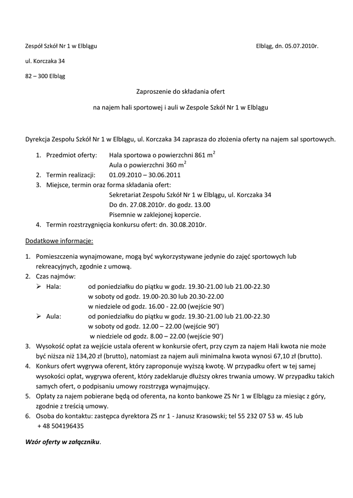 Zespół Szkół Nr 1 w Elblągu Elbląg, dn. 05.07.2010r. ul. Korczaka 34 82 – 300 Elbląg Zaproszenie do składania ofert na najem hali sportowej i auli w Zespole Szkół Nr 1 w Elblągu Dyrekcja Zespołu Szkół Nr 1 w Elblągu, ul. Korczaka 34 zaprasza do złożenia oferty na najem sal sportowych. Hala sportowa o powierzchni 861 m2 Aula o powierzchni 360 m2 2. Termin realizacji: 01.09.2010 – 30.06.2011 3. Miejsce, termin oraz forma składania ofert: Sekretariat Zespołu Szkół Nr 1 w Elblągu, ul. Korczaka 34 Do dn. 27.08.2010r. do godz. 13.00 Pisemnie w zaklejonej kopercie. 4. Termin rozstrzygnięcia konkursu ofert: dn. 30.08.2010r. 1. Przedmiot oferty: Dodatkowe informacje: 1. Pomieszczenia wynajmowane, mogą byd wykorzystywane jedynie do zajęd sportowych lub rekreacyjnych, zgodnie z umową. 2. Czas najmów: Hala: od poniedziałku do piątku w godz. 19.30-21.00 lub 21.00-22.30 w soboty od godz. 19.00-20.30 lub 20.30-22.00 w niedziele od godz. 16.00 - 22.00 (wejście 90’) Aula: od poniedziałku do piątku w godz. 19.30-21.00 lub 21.00-22.30 w soboty od godz. 12.00 – 22.00 (wejście 90’) w niedziele od godz. 8.00 – 22.00 (wejście 90’) 3. Wysokośd opłat za wejście ustala oferent w konkursie ofert, przy czym za najem Hali kwota nie może byd niższa niż 134,20 zł (brutto), natomiast za najem auli minimalna kwota wynosi 67,10 zł (brutto). 4. Konkurs ofert wygrywa oferent, który zaproponuje wyższą kwotę. W przypadku ofert w tej samej wysokości opłat, wygrywa oferent, który zadeklaruje dłuższy okres trwania umowy. W przypadku takich samych ofert, o podpisaniu umowy rozstrzyga wynajmujący. 5. Opłaty za najem pobierane będą od oferenta, na konto bankowe ZS Nr 1 w Elblągu za miesiąc z góry, zgodnie z treścią umowy. 6. Osoba do kontaktu: zastępca dyrektora ZS nr 1 - Janusz Krasowski; tel 55 232 07 53 w. 45 lub + 48 504196435 Wzór oferty w załączniku. ........................................................ Elbląg, dn. ............................................. ........................................................ Pani Hanna Trybioska Dyrektor Zespołu Szkół Nr 1 w Elblągu Składam ofertę na najem pomieszczenia – hali sportowej / auli * znajdującej się w Zespole Szkół Nr 1 w Elblągu, ul. Korczaka 34. Okres najmu: od ................................................ do ........................................................... Dni tygodnia/ godziny najmu: .................................................../ godz. ..................................... Oferowana kwota brutto: ................zł/ słownie ........................................................................ Dane do umowy: NIP: .......................................................... Imię i nazwisko oferenta / nazwa firmy: ............................................................................................................................................................................. Dane adresowe: ............................................................................................................................................................................. Dane kontaktowe (adres, telefon, e-mail): ............................................................................................................................................................................. ............................................................................................................................................................................. .............................................................. * Niepotrzebne skreślid