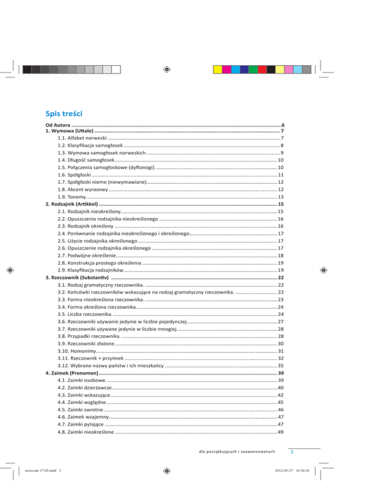 Spis treƑci Od Autora ..........................................................................................................................................6 1. Wymowa (UƩale) .......................................................................................................................... 7 1.1. Alfabet norweski ........................................................................................................................ 7 1.2. KlasyÞkacja samogųosek ............................................................................................................. 8 1.3. Wymowa samogųosek norweskich. ............................................................................................ 9 1.4. DųugoƑđ samogųosek ................................................................................................................. 10 1.5. PoųČczenia samogųoskowe (dyŌonogi). .................................................................................... 10 1.6. Spóųgųoski ................................................................................................................................. 11 1.7. Spóųgųoski nieme (niewymawiane)........................................................................................... 12 1.8. Akcent wyrazowy ..................................................................................................................... 12 1.9. Tonemy ..................................................................................................................................... 13 2. Rodzajnik (ArƟkkel) ..................................................................................................................... 15 2.1. Rodzajnik nieokreƑlony............................................................................................................. 15 2.2. Opuszczenie rodzajnika nieokreƑlonego .................................................................................. 16 2.3. Rodzajnik okreƑlony ................................................................................................................. 16 2.4. Porównanie rodzajnika nieokreƑlonego i okreƑlonego ............................................................. 17 2.5. UǏycie rodzajnika okreƑlonego ................................................................................................. 17 2.6. Opuszczenie rodzajnika okreƑlonego ....................................................................................... 17 2.7. Podwójne okreƑlenie. ............................................................................................................... 18 2.8. Konstrukcja prostego okreƑlenia .............................................................................................. 19 2.9. KlasyÞkacja rodzajników........................................................................................................... 19 3. Rzeczownik (SubstanƟv) ............................................................................................................. 22 3.1. Rodzaj gramatyczny rzeczownika. ............................................................................................ 22 3.2. Koŷcówki rzeczowników wskazujČce na rodzaj gramatyczny rzeczownika. ............................. 22 3.3. Forma nieokreƑlona rzeczownika. ............................................................................................ 23 3.4. Forma okreƑlona rzeczownika. ................................................................................................. 24 3.5. Liczba rzeczownika. .................................................................................................................. 24 3.6. Rzeczowniki uǏywanie jedynie w liczbie pojedynczej............................................................... 27 3.7. Rzeczowniki uǏywane jedynie w liczbie mnogiej...................................................................... 28 3.8. Przypadki rzeczownika. ............................................................................................................ 28 3.9. Rzeczowniki zųoǏone. ................................................................................................................ 30 3.10. Homonimy.............................................................................................................................. 31 3.11. Rzeczownik + przyimek .......................................................................................................... 32 3.12. Wybrane nazwy paŷstw i ich mieszkaŷcy .............................................................................. 35 4. Zaimek (Pronomen) ..................................................................................................................... 39 4.1. Zaimki osobowe. ...................................................................................................................... 39 4.2. Zaimki dzierǏawcze ................................................................................................................... 40 4.3. Zaimki wskazujČce .................................................................................................................... 42 4.4. Zaimki wzglħdne....................................................................................................................... 45 4.5. Zaimki zwrotne ......................................................................................................................... 46 4.6. Zaimek wzajemny ..................................................................................................................... 47 4.7. Zaimki pytajČce ........................................................................................................................ 47 4.8. Zaimki nieokreƑlone ................................................................................................................. 49 dla poczČtkujČ