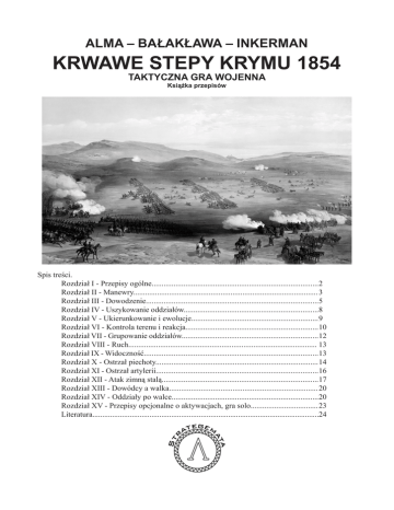 ALMA – BAŁAKŁAWA – INKERMAN KRWAWE STEPY KRYMU 1854 TAKTYCZNA GRA WOJENNA Książka przepisów Spis treści. Rozdział I - Przepisy ogólne.................................................................................... 2 Rozdział II - Manewry............................................................................................. 3 Rozdział III - Dowodzenie....................................................................................... 5 Rozdział IV - Uszykowanie oddziałów.................................................................... 8 Rozdział V - Ukierunkowanie i ewolucje................................................................ 9 Rozdział VI - Kontrola terenu i reakcja................................................................... 10 Rozdział VII - Grupowanie oddziałów..................................................................... 12 Rozdział VIII - Ruch............................................................................................... 13 Rozdział IX - Widoczność........................................................................................ 13 Rozdział X - Ostrzał piechoty.................................................................................. 14 Rozdział XI - Ostrzał artylerii.................................................................................. 16 Rozdział XII - Atak zimną stalą............................................................................... 17 Rozdział XIII - Dowódcy a walka........................................................................... 20 Rozdział XIV - Oddziały po walce.......................................................................... 20 Rozdział XV - Przepisy opcjonalne o aktywacjach, gra solo.................................. 23 Literatura...................................................................................................................24 STRATEGEMATA Krwawe Stepy Krymu 1854 Rozdział I PRZEPISY OGÓLNE 1. Mapy i skala czasowa. I.1 Gra zawiera mapy pozwalające na rozegranie trzech oddzielnych bitew, a mianowicie bitwy nad Almą (20 września 1854 roku), bitwy pod Bałakławą (25 października 1854 roku) oraz bitwy pod Inkermanem (5 listopada 1854 r.). I.2 Skala map: w przypadku Bałakławy i Inkermanu heks reprezentuje ok. 200 metrów terenu, w przypadku Almy ok. 250 metrów terenu. I.3 Celem uporządkowania ruchu, na mapy do gry naniesiono siatkę heksagonalną. W dalszej części instrukcji jedno pole tej siatki nazywane będzie heksem. I.4 Jeden etap gry odpowiada 30 minutom czasu rzeczywistego. 2. Żetony. I.5 Gra korzysta z żetonów bojowych (jednostek piechoty, kawalerii i artylerii), żetonów dowódców, żetonów gońców oraz żetonów pomocniczych. Jeden punkt liczebności żetonu piechoty i kawalerii reprezentuje 75 żołnierzy, liczebność artylerii zależna jest od oddziału, reprezentowanego przez żeton, najczęściej są to 4 albo 2 działa, w zależności od rodzaju i wagomiaru. I.6 Żetony pomocnicze zostaną opisane w tych rozdziałach instrukcji, których dotyczą. I.7 Jednostki rosyjskie oznaczono kolorem zielonym, brytyjskie czerwonym, francuskie ciemnoniebieskim, zaś tureckie jasnoniebieskim. I.8 Co do zasady (wyjątki określają scenariusze) żetony jednostek piechoty przedstawiają bataliony piechoty (w przypadku wojsk brytyjskich regimenty) oraz kompanie piechoty lekkiej bądź w przypadku Brytyjczyków i Francuzów “dywizjony” (dwie kompanie takiej piechoty). I.9 Żetony jednostek kawalerii reprezentują pułki jazdy, czasem dla uwidocznienia siły i bardziej elastycznego wykorzystania pułki podzielono na dwa “dywizjony”. I.10 Żetony jednostek artylerii reprezentują: a) w wojskach brytyjskich, francuskich i tureckich – baterie, b) w wojskach rosyjskich najczęściej pogrupowane wg wagomiaru “półbaterie”, c) wyjątek stanowi brytyjska artyleria morska w grze Bałakława, która została sztucznie pogrupowana w “baterie” broniące poszczególnych redut oraz w czterodziałowe baterie broniące Wzgórza Hiblak oraz część artylerii rosyjskiej w scenariuszu o bitwie pod Inkermanem, w którym baterie zostały przedstawione jako jeden żeton. I.11 Żetony dowódców reprezentują głównodowodzących, dowódców skrzydeł/korpusów, dowódców dywizji i samodzielnych brygad oraz dowódców brygad dywizyjnych. I.12 Jednostki piechoty i kawalerii posiadają liczebność, która została określona w specjalnych diagramach. Utrata liczebności zaznaczana jest na wyżej wymienionych diagramach. Utrata wszystkich punktów liczebności oznacza zniszczenie oddziału, który jest na stałe usuwany z gry. I.13 Jednostki artylerii nie posiadają liczebności określonej punktami. I.14 Wzory żetonów bojowych i dowódców określają poniższe szkice: 2 STRATEGEMATA Krwawe Stepy Krymu 1854 3. Kość. I.15 W grze używa się kości dziesięciościennej, przy czym wynik “0” oznacza zero, a nie dziesięć. I.16 Jeśli instrukcja mówi o wykonaniu 1K10, oznacza to jeden rzut kością dziesięciościenną. 4. Test morale. I.17 Test morale polega na: 1) wykonaniu 1K10, 2) ewentualnym zmodyfikowaniu wyniku (jeśli instrukcja tak stanowi), 3) porównaniu zmodyfikowanego wyniku ze współczynnikiem morale jednostki; wynik mniejszy bądź równy oznacza, iż oddział przeszedł pozytywnie test morale; wynik większy niż współczynnik morale oznacza, iż oddział testu nie przeszedł. I.18 Morale jednostek stojących na heksie z dowódca zwiększa się o modyfikator morale dowódcy. Jeśli przepisy stanowią, że dowódca ginie w trakcie starcia, gracz najpierw sprawdza możliwość utraty dowódcy i ewentualnie usuwa go z gry, a następnie testuje morale oddziału. W razie utraty dowódcy, oddział w danym momencie testuje morale z dodatnim modyfikatorem równym wartości współczynnika dowódcy (negatywny wpływ eliminacji dowódcy). 5. Zaokrąglenia. I.19 Ilekroć w grze mowa 
