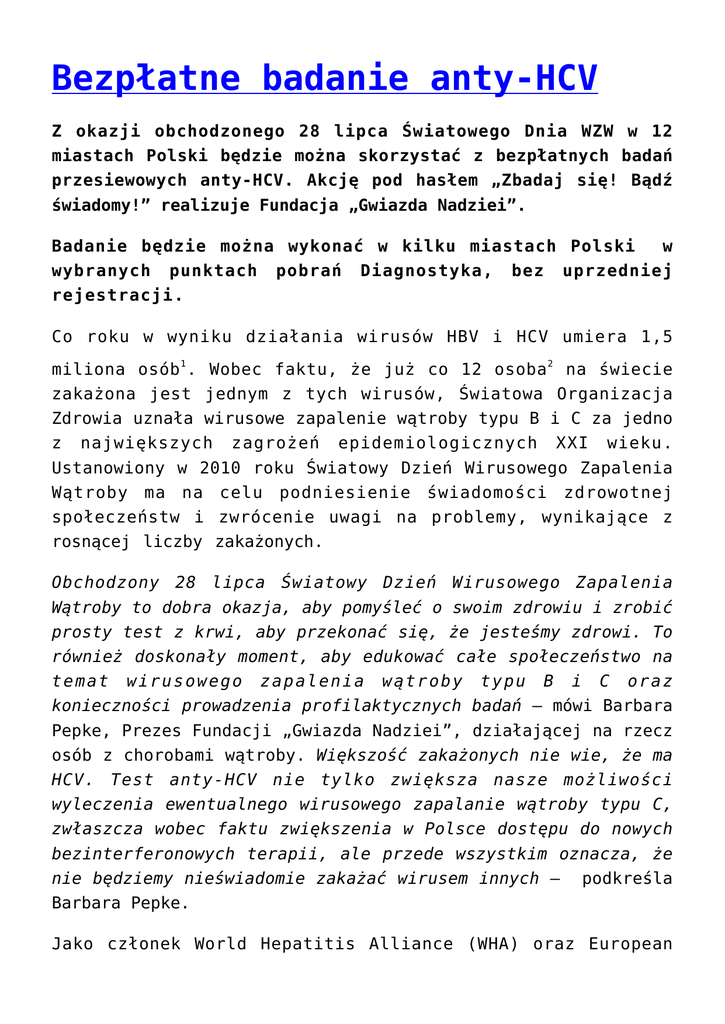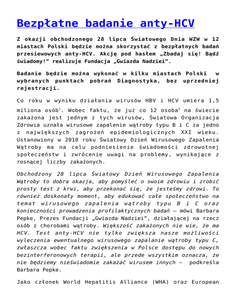 Bezpłatne badanie anty-HCV Z okazji obchodzonego 28 lipca Światowego Dnia WZW w 12 miastach Polski będzie można skorzystać z bezpłatnych badań przesiewowych anty-HCV. Akcję pod hasłem „Zbadaj się! Bądź świadomy!” realizuje Fundacja „Gwiazda Nadziei”. Badanie będzie można wykonać w kilku miastach Polski w wybranych punktach pobrań Diagnostyka, bez uprzedniej rejestracji. Co roku w wyniku działania wirusów HBV i HCV umiera 1,5 miliona osób 1 . Wobec faktu, że już co 12 osoba 2 na świecie zakażona jest jednym z tych wirusów, Światowa Organizacja Zdrowia uznała wirusowe zapalenie wątroby typu B i C za jedno z największych zagrożeń epidemiologicznych XXI wieku. Ustanowiony w 2010 roku Światowy Dzień Wirusowego Zapalenia Wątroby ma na celu podniesienie świadomości zdrowotnej społeczeństw i zwrócenie uwagi na problemy, wynikające z rosnącej liczby zakażonych. Obchodzony 28 lipca Światowy Dzień Wirusowego Zapalenia Wątroby to dobra okazja, aby pomyśleć o swoim zdrowiu i zrobić prosty test z krwi, aby przekonać się, że jesteśmy zdrowi. To również doskonały moment, aby edukować całe społeczeństwo na temat wirusowego zapalenia wątroby typu B i C oraz konieczności prowadzenia profilaktycznych badań – mówi Barbara Pepke, Prezes Fundacji „Gwiazda Nadziei”, działającej na rzecz osób z chorobami wątroby. Większość zakażonych nie wie, że ma HCV. Test anty-HCV nie tylko zwiększa nasze możliwości wyleczenia ewentualnego wirusowego zapalanie wątroby typu C, zwłaszcza wobec faktu zwiększenia w Polsce dostępu do nowych bezinterferonowych terapii, ale przede wszystkim oznacza, że nie będziemy nieświadomie zakażać wirusem innych – Barbara Pepke. podkreśla Jako członek World Hepatitis Alliance (WHA) oraz European Liver Patients Associations – międzynarodowych organizacji pozarządowych, zrzeszających pacjentów z zapaleniami wątroby typu B i C na całym świecie, Fundacja „Gwiazda Nadziei” jest od kilku lat organizatorem Światowego Dnia WZW w Polsce. Wraz z partnerami Koalicji Hepatologicznej zajmuje się poszerzaniem wiedzy na temat HBV i HCV, które mogą prowadzić do marskości i raka wątroby. Szacuje się, że Polsce ponad 230 000 osób3 jest zakażonych HCV. Jednak dotychczas jedynie 30 0004 spośród nich zostało zdiagnozowanych. Szczególną uwagę w ramach działań przywiązuje się do edukacji na temat dróg zakażenia wirusem i wyjaśniania, jakie codzienne sytuacje mogą stanowić potencjalne źródło przeniesienia wirusa na inną osobę. Do zakażenia może dojść bardzo łatwo, ponieważ wystarczy kontakt z niewielką ilością krwi, jaki może mieć miejsce w codziennych sytuacjach, jak używanie nieodpowiednio wysterylizowanych przyrządów higienicznych typu cążki, maszynka do golenia czy szczoteczka do zębów. Inne potencjalnie niebezpieczne sytuacje możemy spotkać chociażby w gabinetach kosmetycznych podczas poddawania się drobnym zabiegom kosmetycznym, jak tatuaż, manicure czy przekłuwanie uszu. Fundacja „Gwiazda Nadziei” przypomina o tym, jak ważna jest profilaktyka, umożliwiając co roku przeprowadzenie bezpłatnych badań pod kątem występowania w krwi wirusa, powodującego zapalenie wątroby. W tym roku, w ramach akcji testów anty-HCV, badania można wykonać w 12 miastach Polski. Badania realizowane są w punktach pobrań Diagnostyka. Liczba badań jest ograniczona. 28 lipca każdy będzie mógł skorzystać z bezpłatnych badań przesiewowych anty-HCV. W Warszawie: al. Prymasa Tysiąclecia 79A , al. Jana Pawła II 45a w godz. 7:00-14:00