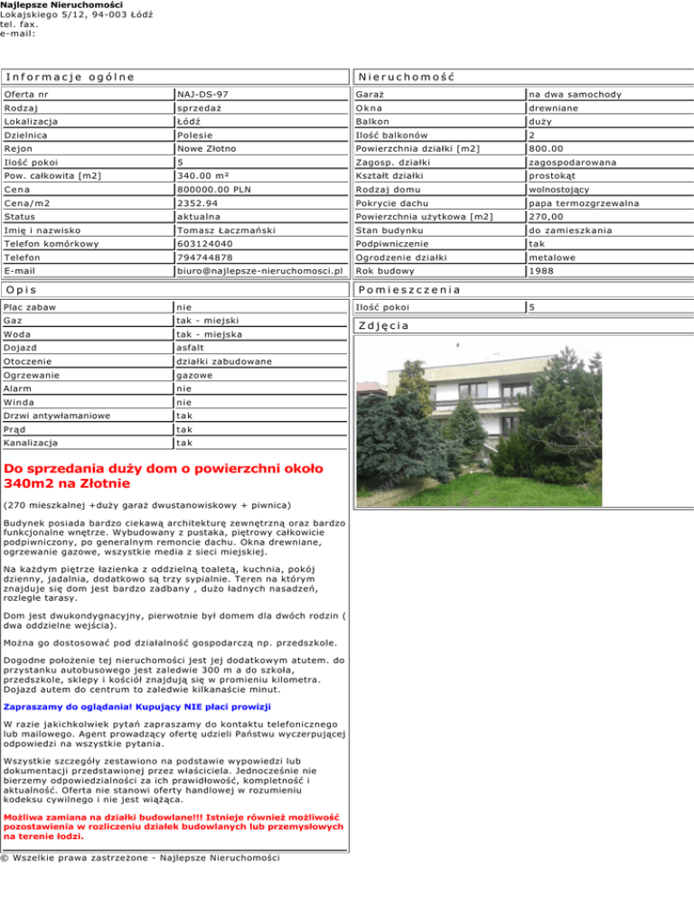 Najlepsze Nieruchomości Lokajskiego 5/12, 94-003 Łódź tel. fax. e-mail: Informacje ogólne Nieruchomość Oferta nr NAJ-DS-97 Garaż na dwa samochody Rodzaj sprzedaż Okna drewniane Lokalizacja Łódź Balkon duży Dzielnica Polesie Ilość balkonów 2 Rejon Nowe Złotno Powierzchnia działki [m2] 800.00 Ilość pokoi 5 Zagosp. działki zagospodarowana Pow. całkowita [m2] 340.00 m² Kształt działki prostokąt Cena 800000.00 PLN Rodzaj domu wolnostojący Cena/m2 2352.94 Pokrycie dachu papa termozgrzewalna Status aktualna Powierzchnia użytkowa [m2] 270,00 Imię i nazwisko Tomasz Łaczmański Stan budynku do zamieszkania Telefon komórkowy 603124040 Podpiwniczenie tak Telefon 794744878 Ogrodzenie działki metalowe E-mail [email protected] Rok budowy 1988 Opis Pomieszczenia Plac zabaw nie Gaz tak - miejski Woda tak - miejska Dojazd asfalt Otoczenie działki zabudowane Ogrzewanie gazowe Alarm nie Winda nie Drzwi antywłamaniowe tak Prąd tak Kanalizacja tak Do sprzedania duży dom o powierzchni około 340m2 na Złotnie (270 mieszkalnej +duży garaż dwustanowiskowy + piwnica) Budynek posiada bardzo ciekawą architekturę zewnętrzną oraz bardzo funkcjonalne wnętrze. Wybudowany z pustaka, piętrowy całkowicie podpiwniczony, po generalnym remoncie dachu. Okna drewniane, ogrzewanie gazowe, wszystkie media z sieci miejskiej. Na każdym piętrze łazienka z oddzielną toaletą, kuchnia, pokój dzienny, jadalnia, dodatkowo są trzy sypialnie. Teren na którym znajduje się dom jest bardzo zadbany , dużo ładnych nasadzeń, rozległe tarasy. Dom jest dwukondygnacyjny, pierwotnie był domem dla dwóch rodzin ( dwa oddzielne wejścia). Można go dostosować pod działalność gospodarczą np. przedszkole. Dogodne położenie tej nieruchomości jest jej dodatkowym atutem. do przystanku autobusowego jest zaledwie 300 m a do szkoła, przedszkole, sklepy i kościół znajdują się w promieniu kilometra. Dojazd autem do centrum to zaledwie kilkanaście minut. Zapraszamy do oglądania! Kupujący NIE płaci prowizji W razie jakichkolwiek pytań zapraszamy do kontaktu telefonicznego lub mailowego. Agent prowadzący ofertę udzieli Państwu wyczerpującej odpowiedzi na wszystkie pytania. Wszystkie szczegóły zestawiono na podstawie wypowiedzi lub dokumentacji przedstawionej przez właściciela. Jednocześnie nie bierzemy odpowiedzialności za ich prawidłowość, kompletność i aktualność. Oferta nie stanowi oferty handlowej w rozumieniu kodeksu cywilnego i nie jest wiążąca. Możliwa zamiana na działki budowlane!!! Istnieje również możliwość pozostawienia w rozliczeniu działek budowlanych lub przemysłowych na terenie łodzi. © Wszelkie prawa zastrzeżone - Najlepsze Nieruchomości Ilość pokoi Zdjęcia 5