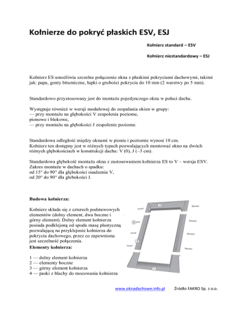 Kołnierze do pokryć płaskich ESV, ESJ Kołnierz standard – ESV Kołnierz niestandardowy – ESJ Kołnierz ES umożliwia szczelne połączenie okna z płaskimi pokryciami dachowymi, takimi jak: papa, gonty bitumiczne, łupki o grubości pokrycia do 10 mm (2 warstwy po 5 mm). Standardowo przystosowany jest do montażu pojedynczego okna w połaci dachu. Występuje również w wersji modułowej do zespalania okien w grupy: — przy montażu na głębokości V zespolenia poziome, pionowe i blokowe, — przy montażu na głębokości J zespolenie poziome. Standardowa odległość między oknami w pionie i poziomie wynosi 10 cm. Kołnierz ten dostępny jest w różnych typach pozwalających montować okno na dwóch różnych głębokościach w konstrukcji dachu: V (0), J (–3 cm). Standardowa głębokość montażu okna z zastosowaniem kołnierza ES to V – wersja ESV. Zakres montażu w dachach o spadku: od 15° do 90° dla głębokości osadzenia V, od 20° do 90° dla głebokości J. Budowa kołnierza: Kołnierz składa się z czterech podstawowych elementów (dolny element, dwa boczne i górny element). Dolny element kołnierza posiada podklejoną od spodu masę plastyczną pozwalającą na przyklejenie kołnierza do pokrycia dachowego, przez co zapewniona jest szczelność połączenia. Elementy kołnierza: 1 — dolny element kołnierza 2 — elementy boczne 3 — górny element kołnierza 4 — paski z blachy do mocowania kołnierza www.oknadachowe.info.pl Źródło FAKRO Sp. z o.o.