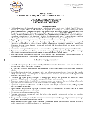 \Załącznik nr 1 do uchwały nr 18/2015 Zarządu Fundacji TALENT Cieszyn z dnia 26.08.2015 r. REGULAMIN UCZESTNICTWA W ZAJĘCIACH ORGANIZOWANYCH PRZEZ FUNDACJĘ TALENT CIESZYN Z SIEDZIBĄ W CIESZYNIE I. Postanowienie ogólne 1. Niniejszy Regulamin określa zasady uczestnictwa w zajęciach organizowanych przez Fundację TALENT Cieszyn z siedzibą w Cieszynie, adres: 43-400 Cieszyn, ul. Błogocka 49, wpisaną do rejestru stowarzyszeń, innych organizacji społecznych i zawodowych, fundacji oraz samodzielnych publicznych zakładów opieki zdrowotnej oraz do rejestru przedsiębiorców Krajowego Rejestru Sądowego pod numerem KRS 0000487712 (akta rejestrowe Fundacji prowadzi Sąd Rejonowy w Bielsku-Białej Wydział VIII Gospodarczy Krajowego Rejestru Sądowego),, zwaną dalej „Organizatorem” lub „Fundacją”. Niniejszy Regulamin reguluje sprawy związane z przebywaniem w salach zajęciowych oraz uczestnictwem w zajęciach i imprezach organizowanych przez Organizatora. 2. Zajęcia i imprezy sportowe organizowane są w ramach działalności statutowej Fundacji. 3. Uczestnikiem zajęć organizowanych przez Fundację zostaje osoba wyrażająca chęć uczestnictwa w zajęciach (zgłaszająca uczestnictwo w zajęciach przez złożenie wypełnionego formularza zgłoszenia) i jednocześnie Organizator decyzją Prezesa Zarządu potwierdził możliwość jej uczestnictwa biorąc pod uwagę możliwości organizacyjne i finansowe. 4. Uczestnictwo zostaje potwierdzone wpisem na listę uczestników na podstawie pisemnego zgłoszenia Uczestnika. 5. Zgłoszenie uczestnika, który nie ukończył 18 roku życia wymaga pisemnej zgody Rodzica lub opiekuna prawnego. Zgłoszenie uczestnika, który nie ukończył 13 roku życia dokonuje Rodzic/Opiekun prawny. 6. Przed zgłoszeniem uczestnictwa w zajęciach należy zapoznać się z Regulaminem. Zgłoszenie uczestnictwa w zajęciach oraz uczestnictwo w zajęciach jest uzależnione od akceptacji Regulaminu. II. Zasady obowiązujące uczestników 1. Uczestnik zobowiązany jest do posiadania aktualnych badań lekarskich z określeniem o braku przeciwwskazań do uczestnictwa w zajęciach od lekarza sportowego. 2. W czasie zajęć Uczestnik ma obowiązek podporządkować się poleceniom wydawanym przez osobę prowadzącą zajęcia. 3. Uczestnika obowiązuje dbałość o porządek i dobry stan udostępnianych pomieszczeń i sprzętów. Za wszelkie szkody powstałe z winy Uczestnika ponosi on odpowiedzialność finansową, a w przypadku osób niepełnoletnich jego rodzice lub opiekun prawny. 4. Organizator nie ponosi odpowiedzialności za nieszczęśliwe wypadki ani zaginione lub zniszczone mienie uczestników. Ubezpieczenie od nieszczęśliwych wypadków leży w gestii uczestnika. 5. Organizator nie ponosi odpowiedzialności za ewentualne negatywne następstwa dla zdrowia i życia Uczestnika zajęć wynikające z uczestnictwa w wykonywaniu ćwiczeń w czasie zajęć ruchowych. 6. Organizator ma prawo do wykluczenia z udziału w zajęciach osób, których zachowanie zakłóca przebieg zajęć lub jest w inny sposób niestosowne. 7. Palenie tytoniu, picie alkoholu, zażywanie narkotyków i środków dopingujących na terenie obiektu, w którym odbywają się zajęcia, jest surowo zabronione. 8. Na zajęcia uczestnik zgłasza się punktualnie. 9. Przyczyną nieobecności na zajęciach może być tylko ważny powód, a nieobecność powinna być wcześniej zgłoszona Organizatorowi. 10. Każdy uczestnik przestrzega zasady fair-play i poszanowania współuczestnika zajęć lub przeciwnika sportowego, z szacunkiem odnosi się do prowadzącego zajęcia. 11. Swoją postawą Uczestnik dba o dobry wizerunek Organizatora, godnie go reprezentuje, czynnie uczestniczy w zdobywaniu środków na działalność statutową Organizatora. 1 III. Naruszanie zasad Regulaminu 1. Za naruszenie postanowień Regulaminu Uczestnik może zostać ukarany przez Organizatora: a) słownym upomnieniem wobec innych, b) powiadomieniem rodziców lub opiekunów (w przypadku osób niepełnoletnich), c) skreśleniem z listy uczestników zajęć. 2. W przypadku usunięcia z listy uczestników Uczestnik jest zobowiązany bezzwłocznie przekazać Organizatorowi powierzony sprzęt i odzież. Dane osobowe 1. Organizator zobowiązuje się do ochrony danych osobowych zgodnie z ustawą z dnia 29 sierpnia 1997 r. o ochronie danych osobowych (Dz.U. 2014 poz. 1182 z późn. zm.; dalej „ustawa o ochronie danych osobowych”). 2. Organizator realizując obowiązek wynikający z art. 24 ust. 1 ustawy o ochronie danych osobowych informuje, że: 1) administratorem danych osobowych Uczestników oraz Rodziców/Opiekunów prawnych (w przypadku zgłoszenia uczestnictwa w zajęciach osoby poniżej 18 roku życia) jest Fundacja TALENT Cieszyn z siedzibą w Cieszynie, adres: 43-400 Cieszyn, ul. Błogocka 49, wpisana do rejestru stowarzyszeń, innych organizacji społecznych i zawodowych, fundacji oraz samodzielnych publicznych zakładów opieki zdrowotnej oraz rejestru przedsiębiorców Krajowego Rejestru Sądowego pod numerem KRS 0000487712 (akta rejestrowe prowadzi Sąd Rejonowy w Bielsku-Białej Wydział VIII Gospodarczy Krajowego Rejestru Sądowego); 2) Administrator przetwarza m.in. następujące dane osobowe Uczestników: imię, nazwisko, data urodzenia, numer telefonu kontaktowego, adres poczty elektronicznej, data wpisu na listę uczestników, data i powód skreślenia z listy uczestników, wyniki osiągnięte w trakcie zawodów, a w przypadku danych Rodziców/Opiekunów prawnych Administrator przetwarza m.in. dane w postaci: imienia, nazwiska, numeru telefonu kontaktowego, adresu poczty elektronicznej, adresu korespondencyjnego; 3) dane osobowe są przetwarzane w celu zawarcia i wykonania umowy o udział w zajęciach sportowych organizowanych przez Fundację, w celu organizacji zajęć sportowych, w tym kontaktu z Uczestnikami lub Rodzicami/Opiekunami prawnymi, w celach ewidencyjnych; po uzyskaniu odrębnej zgody da