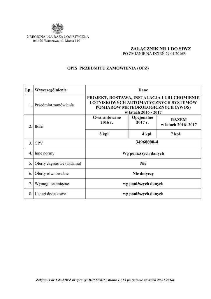 2 REGIONALNA BAZA LOGISTYCZNA 04-470 470 Warszawa, ul. Marsa 110 ZAŁĄCZNIK CZNIK NR 1 DO SIWZ PO ZMIANIE NA DZIEŃ DZIE 29.01.2016R OPIS PRZEDMITU PRZEDMI ZAMÓWIENIA (OPZ) Dane Lp. Wyszczególnienie 1. Przedmiot zamówienia 2. Ilość PROJEKT, DOSTAWA, INSTALACJA I URUCHOMIENIE LOTNISKOWYCH AUTOMATYCZNYCH SYSTEMÓW POMIARÓW METEOROLOGICZNYCH (AWOS) w latach 2016 - 2017 Gwarantowane Opcjonalne RAZEM 2016 r. 2017 r. w latach 2016 -2017 3 kpl. 3. CPV 4. Inne normy 5. Oferty częściowe ciowe (zadania) 4 kpl. 7 kpl. 34960000 34960000-4 Wg poniższych szych danych Nie 6. Oferty równoważne Nie dotyczy 7. Wymogi techniczne wg poniższych szych danych 8. Usługi dodatkowe wg poniższych szych danych Załącznik cznik nr 1 do SIWZ nr sprawy: sprawy D/158/2015; strona 1 z 83 po zmianie na dzień 29.01.2016r. DANE DO OPIS PRZEDMIOTU ZAMÓWIENIA 1. Nazwa zadania: Projekt, dostawa, instalacja i uruchomienie lotniskowych automatycznych systemów pomiarów meteorologicznych (AWOS1) – 7 kpl. (3 kpl. w 2016 r - gwarantowane, 4 kpl. w 2017 r. - opcjonalne) Projekt, dostawa, instalacja i uruchomienie AWOS na lotniskach wojskowych w: 1. 31. Baza Lotnictwa Taktycznego w m. Poznań-Krzesiny, 61-325 Poznań, ul. Silniki 1; 2. 32. Baza Lotnictwa Taktycznego w m. Łask, 98-113 Buczek, Gucin 58a; 3. 33. Baza Lotnictwa Transportowego w m. Powidz, 62-430 Powidz, ul. Witkowska 8; 4. 22. Baza Lotnictwa Taktycznego w m. Malbork, 82-200 Malbork, ul. 17 Marca 20; 5. 23. Baza Lotnictwa Taktycznego w m. Mińsk Mazowiecki, 05-300 Mińsk Mazowiecki, Barcząca; 6. 21. Baza Lotnictwa Taktycznego w m. Świdwin, 78-301 Świdwin, ul. Połczyńska 32; 7. 12. Baza Bezzałogowych Statków Powietrznych w m. Mirosławiec, 78-651 Mirosławiec. 2. Opis przedmiotu zamówienia. a) Przedmiotem niniejszego zamówienia jest: 1) wykonanie projektu/ów wykonawczego/ych systemów AWOS i ICE-ALERT, infrastruktury teletechnicznej i okablowania, na bazie opisu istniejącej i planowanej infrastruktury; 2) wykonanie niezbędnego do instalacji systemu AWOS i ICE-ALERT projektu budowlanego wraz z uzyskaniem pozwoleń budowlanych; 3) dostawa fabrycznie przetestowanych, po teście/testach FAT (Factory Acceptance Test), kompletnych systemów AWOS i ICE-ALERT dla lotnisk określonych w ust. 1; 4) instalacja, w tym położenie nowej i połączenie z udostępnioną siecią teletechniczną i energetyczną oraz skonfigurowanie oprogramowania i uruchomienie systemów; 5) przeprowadzenie testu akceptacyjnego SAT (Site Acceptance Test); 6) wykonanie dokumentacji technicznej – powykonawczej – ze szczegółowym opisem systemu (hardware) i oprogramowania (software); 7) przeprowadzenie pełnego szkolenia personelu Zamawiającego; 8) wsparcie serwisowe, gwarancyjne i pogwarancyjne; 9) dostawa, instalacja i uruchomienie w Szefostwie Służby Hydrometeorologicznej SZ RP (m. Warszawa): • Lotniczo–Klimatologicznej Bazy Danych (LKBD); • Centralnego systemu monitorowania systemów AWOS (CSM). b) Informacje i wymagania Zamawiającego dotyczące zaprojektowania oraz wykonania systemów AWOS i ICE-ALERT, a także odbioru robót budowlanych niezbędnych do ich instalacji. 1) Zakres robót: 1. Wykonanie niezbędnej instalacji zasilającej systemów AWOS i ICE-ALERT zgodnie z obowiązującymi przepisami i normami, w tym normą N SEP 004; 1 Automated Weather Observing System Załącznik nr 1 do SIWZ nr sprawy: D/158/2015; strona 2 z 83 po zmianie na dzień 29.01.2016r. 2. Wykonanie niezbędnej kanalizacji kablowej dla instalacji przesyłania danych pomiarowych z urządzeń systemów AWOS i ICE-ALERT; 3. Wykonanie instalacji przesyłania danych pomiarowych z urządzeń systemów AWOS i ICE-ALERT; 4. Wykonanie niezbędnej kanalizacji kablowej oraz instalacji przesyłania danych do terminali zobrazowujących systemów AWOS i ICE-ALERT; 5. Posadowienie urządzeń systemów AWOS i ICE-ALERT; 2) Wykonawca dostosuje terminy poszczególnych etapów realizacji zamówienia do bieżącej operacyjnej działalności jednostek wojskowych. 3) Wykonawca zobowiązany jest zrealizować przedmiot zamówienia w oparciu o odpowiednie ustawy i rozporządzenia, polskie i europejskie normy oraz inne obowiązujące przepisy, a w odniesieniu do robót budowlanych niezbędnych do instalacji systemów, także zgodnie z zasadami wiedzy technicznej i sztuki budowlanej. 4) W celu realizacji zadania konieczne jest opracowanie następującej dokumentacji oraz wykonanie niżej wymienionych prac: 1. Opracowanie i przedstawienie do akceptacji Zamawiającemu koncepcji rozwiązań dotyczących wszystkich stanowisk, która w szczególności opisuje: a) wstępny projekt architektury oferowanego systemu, wraz z projektem zobrazowania danych dla poszczególnych użytkowników systemu oraz proponowaną konfigurację/specyfikację oferowanego sprzętu komputerowego; b) połączenia stanowisk pomiarowych z serwerami systemów (transmisja danych); c) sposób zabezpieczenia kabli sygnałowych; d) procedurę instalacji okablowania przyłączeniowego urządzeń systemów infrastruktury energetycznej i teletechnicznej, do istniejącej tj. do istniejących złącz energetycznych i urządzeń dostępowych sieci LAN, WAN i innych, zależnie od koncepcji. 2. Opracowanie dokumentacji projektowej. Wykonawca opracuje kompletną dokumentację projektową systemów AWOS i ICE-ALERT, w tym zawierającą projekty budowlane związane z robotami budowlanymi niezbędnymi do instalacji tych systemów, opracowane zgodnie z rozporządzeniem Ministra Infrastruktury z dnia 02.09.2004 r. w sprawie szczegółowego zakresu i formy dokumentacji projektowej, specyfikacji technicznej i odbioru robót budowlanych (Dz. U. Nr 202, poz. 2072, ze zm.) wraz ze wszelkimi wymaganymi opiniami i uzgodnieniami do otrzymania pozwoleń na budowę. 3. Uzgodnienie dokumentacji projektowej oraz specyfikacji technicznych wykonania i odbioru robót z Zarządcą nieruchomości oraz Zarządzającym lotniskiem, dla każdej z lokalizacji. 4. Wykonanie rob
