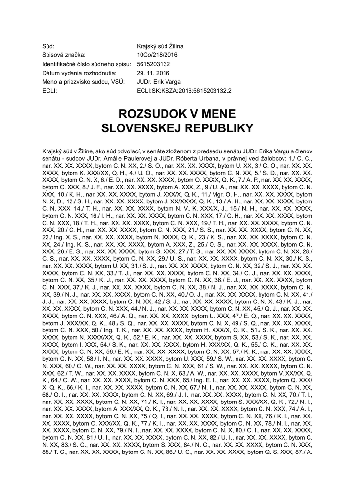 Súd: Spisová značka: Identifikačné číslo súdneho spisu: Dátum vydania rozhodnutia: Meno a priezvisko sudcu, VSÚ: ECLI: Krajský súd Žilina 10Co/218/2016 5615203132 29. 11. 2016 JUDr. Erik Varga ECLI:SK:KSZA:2016:5615203132.2 ROZSUDOK V MENE SLOVENSKEJ REPUBLIKY Krajský súd v Žiline, ako súd odvolací, v senáte zloženom z predsedu senátu JUDr. Erika Vargu a členov senátu - sudcov JUDr. Amálie Paulerovej a JUDr. Róberta Urbana, v právnej veci žalobcov: 1./ C. C., nar. XX. XX. XXXX, bytom C. N. XX, 2./ S. O., nar. XX. XX. XXXX, bytom U. XX, 3./ C. O., nar. XX. XX. XXXX, bytom K. XXX/XX, Q. H., 4./ U. O., nar. XX. XX. XXXX, bytom C. N. XX, 5./ S. D., nar. XX. XX. XXXX, bytom C. N. X, 6./ E. D., nar. XX. XX. XXXX, bytom O. XXXX, Q. K., 7./ A. P., nar. XX. XX. XXXX, bytom C. XXX, 8./ J. F., nar. XX. XX. XXXX, bytom A. XXX, Z., 9./ U. A., nar. XX. XX. XXXX, bytom C. N. XXX, 10./ K. H., nar. XX. XX. XXXX, bytom J. XXX/X, Q. K., 11./ Mgr. O. H., nar. XX. XX. XXXX, bytom N. X, D., 12./ S. H., nar. XX. XX. XXXX, bytom J. XX/XXXX, Q. K., 13./ A. H., nar. XX. XX. XXXX, bytom C. N. XXX, 14./ T. H., nar. XX. XX. XXXX, bytom N. V.. K. XXX/X, J., 15./ N. H., nar. XX. XX. XXXX, bytom C. N. XXX, 16./ I. H., nar. XX. XX. XXXX, bytom C. N. XXX, 17./ C. H., nar. XX. XX. XXXX, bytom C. N. XXX, 18./ T. H., nar. XX. XX. XXXX, bytom C. N. XXX, 19./ T. H., nar. XX. XX. XXXX, bytom C. N. XXX, 20./ C. H., nar. XX. XX. XXXX, bytom C. N. XXX, 21./ S. S., nar. XX. XX. XXXX, bytom C. N. XX, 22./ Ing. X. S., nar. XX. XX. XXXX, bytom N. XXXX, Q. K., 23./ K. S., nar. XX. XX. XXXX, bytom C. N. XX, 24./ Ing. K. S., nar. XX. XX. XXXX, bytom A. XXX, Z., 25./ O. S., nar. XX. XX. XXXX, bytom C. N. XXX, 26./ E. S., nar. XX. XX. XXXX, bytom S. XXX, 27./ T. S., nar. XX. XX. XXXX, bytom C. N. XX, 28./ C. S., nar. XX. XX. XXXX, bytom C. N. XX, 29./ U. S., nar. XX. XX. XXXX, bytom C. N. XX, 30./ K. S., nar. XX. XX. XXXX, bytom U. XX, 31./ S. J., nar. XX. XX. XXXX, bytom C. N. XX, 32./ S. J., nar. XX. XX. XXXX, bytom C. N. XX, 33./ T. J., nar. XX. XX. XXXX, bytom C. N. XX, 34./ C. J., nar. XX. XX. XXXX, bytom C. N. XX, 35./ K. J., nar. XX. XX. XXXX, bytom C. N. XX, 36./ E. J., nar. XX. XX. XXXX, bytom C. N. XXX, 37./ K. J., nar. XX. XX. XXXX, bytom C. N. XX, 38./ N. J., nar. XX. XX. XXXX, bytom C. N. XX, 39./ N. J., nar. XX. XX. XXXX, bytom C. N. XX, 40./ O. J., nar. XX. XX. XXXX, bytom C. N. XX, 41./ J. J., nar. XX. XX. XXXX, bytom C. N. XX, 42./ S. J., nar. XX. XX. XXXX, bytom C. N. X, 43./ K. J., nar. XX. XX. XXXX, bytom C. N. XXX, 44./ N. J., nar. XX. XX. XXXX, bytom C. N. XX, 45./ Q. J., nar. XX. XX. XXXX, bytom C. N. XXX, 46./ A. Q., nar. XX. XX. XXXX, bytom U. XXX, 47./ E. Q., nar. XX. XX. XXXX, bytom J. XXX/XX, Q. K., 48./ S. Q., nar. XX. XX. XXXX, bytom C. N. X, 49./ S. Q., nar. XX. XX. XXXX, bytom C. N. XXX, 50./ Ing. T. K., nar. XX. XX. XXXX, bytom H. XXX/X, Q. K., 51./ S. K., nar. XX. XX. XXXX, bytom N. XXXX/XX, Q. K., 52./ E. K., nar. XX. XX. XXXX, bytom S. XX, 53./ S. K., nar. XX. XX. XXXX, bytom I. XXX, 54./ S. K., nar. XX. XX. XXXX, bytom H. XXX/XX, Q. K., 55./ C. K., nar. XX. XX. XXXX, bytom C. N. XX, 56./ E. K., nar. XX. XX. XXXX, bytom C. N. XX, 57./ K. K., nar. XX. XX. XXXX, bytom C. N. XX, 58./ I. N., nar. XX. XX. XXXX, bytom U. XXX, 59./ S. W., nar. XX. XX. XXXX, bytom C. N. XXX, 60./ C. W., nar. XX. XX. XXXX, bytom C. N. XXX, 61./ S. W., nar. XX. XX. XXXX, bytom C. N. XXX, 62./ T. W., nar. XX. XX. XXXX, bytom C. N. X, 63./ A. W., nar. XX. XX. XXXX, bytom V. XX/XX, Q. K., 64./ C. W., nar. XX. XX. XXXX, bytom C. N. XXX, 65./ Ing. E. I., nar. XX. XX. XXXX, bytom Q. XXX/ X, Q. K., 66./ K. I., nar. XX. XX. XXXX, bytom C. N. XX, 67./ N. I., nar. XX. XX. XXXX, bytom C. N. XX, 68./ O. I., nar. XX. XX. XXXX, bytom C. N. XX, 69./ J. I., nar. XX. XX. XXXX, bytom C. N. XX, 70./ T. I., nar. XX. XX. XXXX, bytom C. N. XX, 71./ K. I., nar. XX. XX. XXXX, bytom S. XXX/XX, Q. K., 72./ N. I., nar. XX. XX. XXXX, bytom A. XXX/XX, Q. K., 73./ N. I., nar. XX. XX. XXXX, bytom C. N. XXX, 74./ A. I., nar. XX. XX. XXXX, bytom C. N. XX, 75./ Q. I., nar. XX. XX. XXXX, bytom C. N. XX, 76./ K. I., nar. XX. XX. XXXX, bytom O. XXX/XX, Q. K., 77./ K. I., nar. XX. XX. XXXX, bytom C. N. XX, 78./ N. I., nar. XX. XX. XXXX, bytom C. N. XX, 79./ N. I., nar. XX. XX. XXXX, bytom C. N. X, 80./ C. I., nar. XX. XX. XXXX, bytom C. N. XX, 81./ U. I., nar. XX. XX. XXXX, bytom C. N. XX, 82./ U. I., nar. XX. XX. XXXX, bytom C. N. XX, 83./ S. C., nar. XX. XX. XXXX, bytom S. XXX, 84./ N. C., nar. XX. XX. XXXX, bytom C. N. XXX, 85./ T. C., nar. XX. XX. XXXX, bytom C. N. XX, 86./ U. C., nar. XX. XX. XXXX, bytom Q. S. XXX, 87./ A. T., nar. XX. XX. XXXX, bytom C. N. XXX, 88./ X. T., nar. XX. XX. XXXX, bytom D. XXX/XX, Q. H., 89./ K. T., nar. XX. XX. XXXX, bytom C. N. XX, 90./ Ing. N. T., nar. XX. XX. XXXX, bytom C. N. XXX, 91./ C. T., nar. XX. XX. XXXX, bytom C. N. XXX, 92./ E. T., nar. XX. XX. XXXX, bytom C. N. XXX, 93./ I. T., nar. XX. XX. XXXX, bytom P. XXX/X, Q. K., 94./ D. B., nar. XX. XX. XXXX, bytom Q. V. XXX, 95./ C. U., nar. XX. XX. XXXX, bytom U. XXX, 96./ N. U., nar. XX. XX. XXXX, bytom U. XXX, 97./ X. U., nar. XX. XX. XXXX, bytom C. XXXX/XX, Q. K., 98./ Q. U., nar. XX. XX. XXXX, bytom C. N. XX, 99./ K. U., nar. XX. XX. XXXX, bytom C. N. XX, 100./ S. U., nar. XX. XX. XXXX, bytom C. N. 3, všetci žalobcovia zastúpení žalobcom 1./, proti žalovaným: 1./ Bývalí urbárnici obce Veterná Poruba, 2./ Komposesorát vo Veternej Porube, obaja žalovaní zastúpení Slovenským pozemkovým fondom, so sídlom Búdková 36, Bratislava, IČO: 17 335 345, o určenie vlastníckeho práva k nehnuteľnostiam, na základe odvolania žalobcov proti rozsudku Okresného súdu Liptovský Mikuláš č. k. 7C/147/2015-196 zo dňa 24. marca 2016, takto rozhodol: Rozsudok súdu prvej inštancie p o t v r d z u j e . Žalovaní 1/ a 2/ m a j ú v rozsahu 100 %. voči žalobcom 1/ až 100/ n á r o k na náhradu trov odvolacieho konania odôvodnenie: Nap