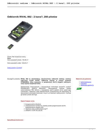 Odbiorniki radiowe : Odbiornik RIVAL 862 - 2 kana?, 200 pilotów Odbiornik RIVAL 862 - 2 kana?, 200 pilotów Ocena: Nie ma jeszcze oceny Cena Cena sprzeda?y brutto: 150,06 z? Cena sprzeda?y netto: 122,00 z? Zadaj pytanie o produkt Szczegó?y produktu RIVAL 862 to standardowy, dwukana?owy odbiornik radiowy, zasilany napi?ciem 12-24V AC/DC. Odbiornik pracuje w nowym systemie DTM868MHz, który wyznacza, w spotykanych dot?d drogach radiowych, nowy wymiar bezpiecze?stwa. Materia?y do pobrania karta katalogowa instrukcja deklaracja zgodno?ci Zastosowanie nowoczesnych i innowacyjnych technologii pozwoli?o uzyska? PEWNIEJSZY ZASI?G RADIOWY. Wprowadzony autorski system zmiennokodowy IRS 104-bit w niespotykany dot?d sposób chroni przed jego z?amaniem i ingerencj? osób niepowo?anych. Przeznaczony do wspó?pracy ze sterownikami automatyki bramowej i innymi urz?dzeniami elektrycznymi. Cechuje go bardzo prosta obs?uga. Najwa?niejsze cechy bryzgoszczelna obudowa zaawansowane mo?liwo?ci i bardzo proste programowanie dzi?ki sygnalizacyjnym diodom LED regulacja czasu podtrzymania wyj?? zasilanie 12-24V AC lub DC Specyfikacja techniczna 1 / 2 Odbiorniki radiowe : Odbiornik RIVAL 862 - 2 kana?, 200 pilotów zasilanie pojemno?? pami?ci obs?ugiwane piloty modu? radiowy rodzaj modulacji / cz?stotliwo?ci konfiguracja pilota 12-24V AC/DC 200 pilotów o indywidualnym numerze w pami?ci DTM 868MHz zintegrowany, superheterodynowy, zapewniaj?cy wysok? niezawodno??, powtarzalno?? i odporno?? na za?ócenia radiowe FSK / 868 MHz mo?liwo?c przypisania dowolnego przycisku pilota do karty, kasowanie ca?ej pami?ci, mo?liwo?? kasowania pojedy?czego pilota, mo?liwo?? zdalnego dopisania pilota 2 / 2 Powered by TCPDF (www.tcpdf.org)
