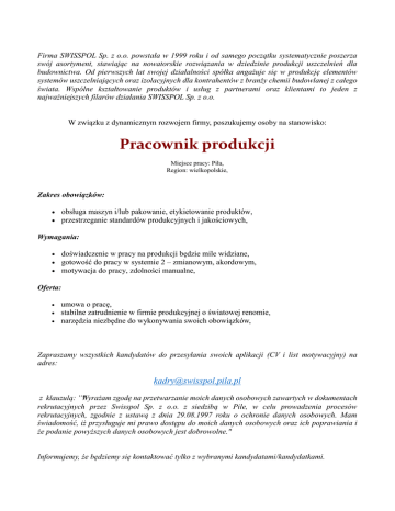 Firma SWISSPOL Sp. z o.o. powstała w 1999 roku i od samego początku systematycznie poszerza swój asortyment, stawiając na nowatorskie rozwiązania w dziedzinie produkcji uszczelnień dla budownictwa. Od pierwszych lat swojej działalności spółka angażuje się w produkcję elementów systemów uszczelniających oraz izolacyjnych dla kontrahentów z branży chemii budowlanej z całego świata. Wspólne kształtowanie produktów i usług z partnerami oraz klientami to jeden z najważniejszych filarów działania SWISSPOL Sp. z o.o. W związku z dynamicznym rozwojem firmy, poszukujemy osoby na stanowisko: Pracownik produkcji Miejsce pracy: Piła, Region: wielkopolskie, Zakres obowiązków: obsługa maszyn i/lub pakowanie, etykietowanie produktów, przestrzeganie standardów produkcyjnych i jakościowych, Wymagania: doświadczenie w pracy na produkcji będzie mile widziane, gotowość do pracy w systemie 2 – zmianowym, akordowym, motywacja do pracy, zdolności manualne, Oferta: umowa o pracę, stabilne zatrudnienie w firmie produkcyjnej o światowej renomie, narzędzia niezbędne do wykonywania swoich obowiązków, Zapraszamy wszystkich kandydatów do przesyłania swoich aplikacji (CV i list motywacyjny) na adres: [email protected] z klauzulą: ”"Wyrażam zgodę na przetwarzanie moich danych osobowych zawartych w dokumentach rekrutacyjnych przez Swisspol Sp. z o.o. z siedzibą w Pile, w celu prowadzenia procesów rekrutacyjnych, zgodnie z ustawą z dnia 29.08.1997 roku o ochronie danych osobowych. Mam świadomość, iż przysługuje mi prawo dostępu do moich danych osobowych oraz ich poprawiania i że podanie powyższych danych osobowych jest dobrowolne." Informujemy, że będziemy się kontaktować tylko z wybranymi kandydatami/kandydatkami.