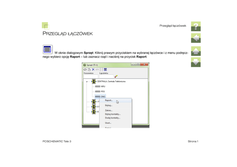 Przegląd łączówek PRZEGLĄD ŁĄCZÓWEK W oknie dialogowym Sprzęt: Kliknij prawym przyciskiem na wybranej łączówce i z menu podręcznego wybierz opcję Raport – lub zaznacz rząd i naciśnij na przycisk Raport: PC|SCHEMATIC Tele 3 Strona 1 Przegląd łączówek Otwiera się okno Raport: PC|SCHEMATIC Tele 3 Strona 2 Przegląd łączówek Wyświetlanie rzędów i połączeń 1 2 3 4 4 1) Pokazuje kontakt podłączony do lewej strony łączówki. 2) Pokazuje typ połączenia po lewej stronie łączówki. 3) Pokazuje kontakt w zaznaczonej łączówce. 4) Pokazuje typ połączenia po prawej stronie łączówki. 5) Pokazuje kontakt podłączony po prawej strony łączówki. W obrazku powyżej występują następujące typy połączeń: Lewa strona Prawa strona Połączenie krosowe /patchowe (wewnątrz krosownicy) – nie jest wyświetlona nazwa kabla. Połączenie kablowe (zewnętrzne, między krosownicami), ponieważ dane kabla są wyświetlone w linii kabla (nazwa kabla W001-050/para 1/ kolor pary WH+BU). Funkcje dostępne w oknie dialogowym Raport: Odśwież dane. PC|SCHEMATIC Tele 3 Strona 3 Przegląd łączówek Podgląd wydruku Po naciśnięciu przycisku Info sprawdzane są wszystkie połączenia. Jeżeli numer lokalny jest przypisany do połączenia, wtedy zostanie on wyświetlony. Po naciśnięciu przycisku Follow Point program pokaże całą trasę sygnału i wskaże położenie wybranego kontaktu na tej trasie. Rozłącz lewa stronę łączówki. Rozłącz prawą stronę łączówki. Zamienia miejscami położenie kontaktów po lewej stronie łączówki. Zamienia miejscami położenie kontaktów po prawej stronie łączówki. Podwójne kliknięcie na dany kontakt powoduje wyświetlenie Opisu trasy dla tego kontaktu. PC|SCHEMATIC Tele 3 Strona 4 Przegląd łączówek Usuwanie połączeń Aby usunąć połączenie pomiędzy dwoma kontaktami (na przykład pomiędzy POS/1 i DNO/T1001), najpierw zaznacz połączenie: Następnie naciśnij klawisz Delete. Pojawia się okno: Naciskamy na przycisk Tak. Połączenie zostało usunięte. PC|SCHEMATIC Tele 3 Strona 5