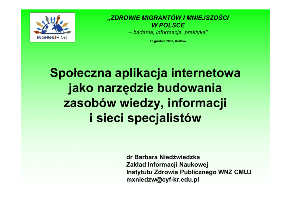 „ZDROWIE MIGRANTÓW I MNIEJSZOŚCI W POLSCE – badania, informacja, praktyka” 15 grudnia 2008, Kraków Społeczna aplikacja internetowa jako narzędzie budowania zasobów wiedzy, informacji i sieci specjalistów dr Barbara Niedźwiedzka Zakład Informacji Naukowej Instytutu Zdrowia Publicznego WNZ CMUJ [email protected] „ZDROWIE MIGRANTÓW I MNIEJSZOŚCI W POLSCE – badania, informacja, praktyka” 15 grudnia 2008, Kraków Web 2 Wiki Sieci społeczne, np. MySpace Cure Diabetes group. Patient Opinion (http://patientopinion.org.uk). Blogi Fora dyskusyjne, czaty Agregacja zawartości i RSS Second life, np. http://infoisland.org/ Mushups, np. HealthMap, AvianFlu, Biowizard Dostęp do sieci WWW poprzez mobilne urządzenia (telefony komórkowe, iPhone) oraz telewizję W medycynie i zdrowiu jest już ponad 60 wiki. Pełna lista dostępna na stronie D. Rothmana http://davidrothman.net/list-of-medical-wikis/ „ZDROWIE MIGRANTÓW I MNIEJSZOŚCI W POLSCE – badania, informacja, praktyka” 15 grudnia 2008, Kraków Cechy aplikacji społecznościowych – Tworzenie treści i zasobów wiedzy/informacji przez samych zainteresowanych – Wykorzystanie zbiorowej wiedzy i inteligencji – Uwzględnianie różnorodnych perspektyw, punktów widzenia, poglądów – Wirtualna współpraca – nowa forma realizacji społecznego kapitału – Tworzenie się społeczności wokół internetowego serwisu/portalu „ZDROWIE MIGRANTÓW I MNIEJSZOŚCI W POLSCE – badania, informacja, praktyka” 15 grudnia 2008, Kraków Technologia wiki Portale posługujące się technologią wiki to zbiory połączonych ze sobą stron WWW, które użytkownik sieci może łatwo uzupełniać, poprawiać ich treść lub tę treść z nich usuwać. Wiki są tworzone zgodnie z góry przyjętymi zasadami, otwarte dla każdego (np. Wikipedia) lub specjalistyczne - otwarte tylko dla zarejestrowanych członków danej sieci i moderowane ZASTOSOWANIA: Tworzenie wspólnego zasobu wiedzy, dokumentów, zbiorów informacji przydatnych w pracy Narzędzie komunikacji i współpracy Miejsce publikowania w sieci opracowań i materiałów „ZDROWIE MIGRANTÓW I MNIEJSZOŚCI W POLSCE – badania, informacja, praktyka” 15 grudnia 2008, Kraków Korzyści • Wykorzystanie zbiorowej wiedzy i doświadczenia dla wytworzenia wspólnego „dobra” - wszechstronnej, łatwo dostępnej informacji w jednym miejscu • Większość potrzebnych informacji jest w rękach zainteresowanych, ale niepotrzebnie rozproszona i redundantna • Specjalistyczny pełna baza informacji staje się oazą w hałaśliwym Internecie • Doskonałe medium ponad narodowej komunikacji między naukowcami i praktykami (pod warunkiem, że j. angielskim) • możliwość stałego rozwoju i modyfikacji poprzez wzajemne poprawianie się i uzupełnianie „ZDROWIE MIGRANTÓW I MNIEJSZOŚCI W POLSCE – badania, informacja, praktyka” 15 grudnia 2008, Kraków Zagrożenia i trudności ¾ Trudno utrzymać wysoką jakość i porządek ¾ Nie jest łatwo zbudować w środowisku poczucie wzajemnej korzyści, a także zrozumienie efektów oddalonych w czasie ¾ W fazie początkowej potrzeba zachęt i intensywnej promocji ¾ Potrzeba lidera (ów) ¾ Narażenie na wandalizm, spamy ¾ Trudno zapewnić systematyczną aktualizację zasobu ¾ Tematy kontrowersyjne mogą powodować zniechęcenie lub niepotrzebną rywalizację Pytania do dyskusji panelowej • Czy jest prawdą, że środowisko osób zajmujących się problemami związanymi ze zdrowiem migrantów i wykluczonych mniejszości w Polsce, jest rozproszone, brak jest danych i informacji, brakuje dobrej komunikacji, co utrudnia badania i działania na rzecz systemowej poprawy tej opieki? • Czy budowanie internetowej sieci zasobów wiedzy i osób (naukowców, praktyków) w skali krajowej i międzynarodowej jest dobrym, odpowiednim sposobem integracji środowiska na rzecz działań i badań w tym zakresie. • Jakie warunki powinny być spełnione, aby polski portal MIGHEALTHNET żył i rozwijał się i żeby jego zawartość była przydatna w działaniach służących poprawie opieki zdrowotnej nad społecznościami i jednostkami nie objętymi systemem lub mającymi do niego utrudniony dostęp?