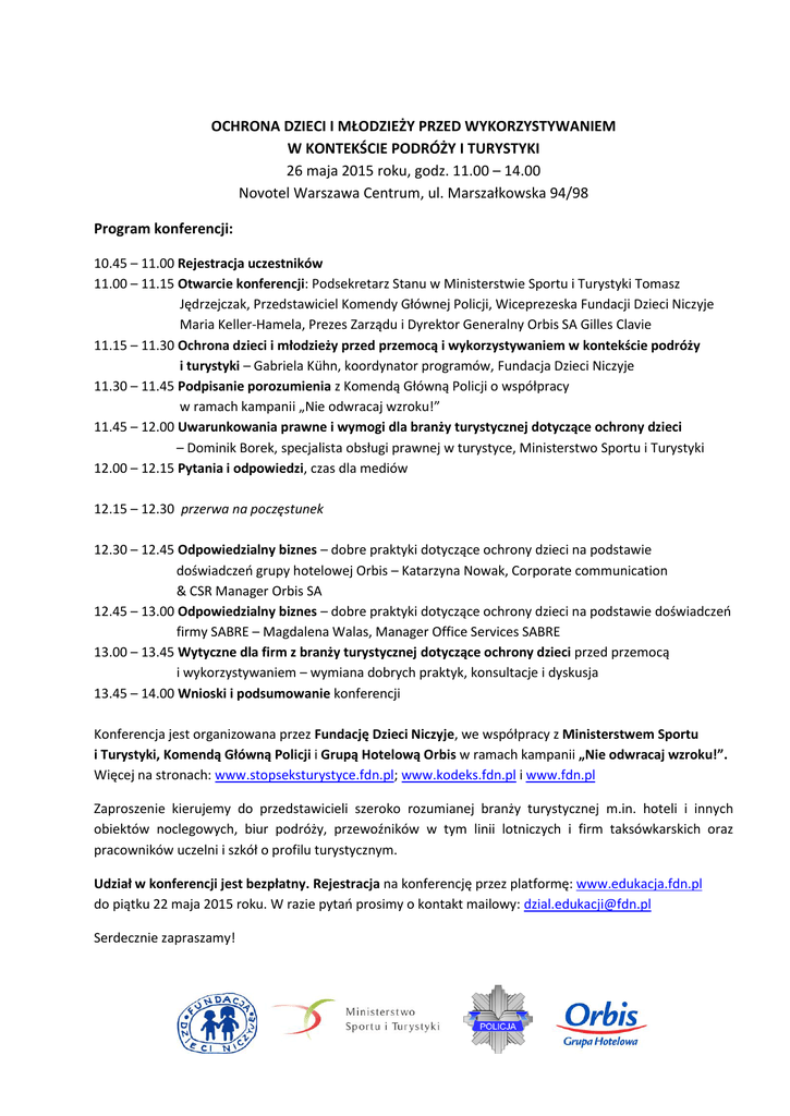 OCHRONA DZIECI I MŁODZIEŻY PRZED WYKORZYSTYWANIEM W KONTEKŚCIE PODRÓŻY I TURYSTYKI 26 maja 2015 roku, godz. 11.00 – 14.00 Novotel Warszawa Centrum, ul. Marszałkowska 94/98 Program konferencji: 10.45 – 11.00 Rejestracja uczestników 11.00 – 11.15 Otwarcie konferencji: Podsekretarz Stanu w Ministerstwie Sportu i Turystyki Tomasz Jędrzejczak, Przedstawiciel Komendy Głównej Policji, Wiceprezeska Fundacji Dzieci Niczyje Maria Keller-Hamela, Prezes Zarządu i Dyrektor Generalny Orbis SA Gilles Clavie 11.15 – 11.30 Ochrona dzieci i młodzieży przed przemocą i wykorzystywaniem w kontekście podróży i turystyki – Gabriela Kühn, koordynator programów, Fundacja Dzieci Niczyje 11.30 – 11.45 Podpisanie porozumienia z Komendą Główną Policji o współpracy w ramach kampanii „Nie odwracaj wzroku!” 11.45 – 12.00 Uwarunkowania prawne i wymogi dla branży turystycznej dotyczące ochrony dzieci – Dominik Borek, specjalista obsługi prawnej w turystyce, Ministerstwo Sportu i Turystyki 12.00 – 12.15 Pytania i odpowiedzi, czas dla mediów 12.15 – 12.30 przerwa na poczęstunek 12.30 – 12.45 Odpowiedzialny biznes – dobre praktyki dotyczące ochrony dzieci na podstawie doświadczeń grupy hotelowej Orbis – Katarzyna Nowak, Corporate communication & CSR Manager Orbis SA 12.45 – 13.00 Odpowiedzialny biznes – dobre praktyki dotyczące ochrony dzieci na podstawie doświadczeń firmy SABRE – Magdalena Walas, Manager Office Services SABRE 13.00 – 13.45 Wytyczne dla firm z branży turystycznej dotyczące ochrony dzieci przed przemocą i wykorzystywaniem – wymiana dobrych praktyk, konsultacje i dyskusja 13.45 – 14.00 Wnioski i podsumowanie konferencji Konferencja jest organizowana przez Fundację Dzieci Niczyje, we współpracy z Ministerstwem Sportu i Turystyki, Komendą Główną Policji i Grupą Hotelową Orbis w ramach kampanii „Nie odwracaj wzroku!”. Więcej na stronach: www.stopseksturystyce.fdn.pl; www.kodeks.fdn.pl i www.fdn.pl Zaproszenie kierujemy do przedstawicieli szeroko rozumianej branży turystycznej m.in. hoteli i innych obiektów noclegowych, biur podróży, przewoźników w tym linii lotniczych i firm taksówkarskich oraz pracowników uczelni i szkół o profilu turystycznym. Udział w konferencji jest bezpłatny. Rejestracja na konferencję przez platformę: www.edukacja.fdn.pl do piątku 22 maja 2015 roku. W razie pytań prosimy o kontakt mailowy: [email protected] Serdecznie zapraszamy!