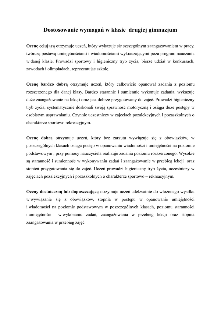 Dostosowanie wymagań w klasie drugiej gimnazjum Ocenę celującą otrzymuje uczeń, który wykazuje się szczególnym zaangażowaniem w pracy, twórczą postawą umiejętnościami i wiadomościami wykraczającymi poza program nauczania w danej klasie. Prowadzi sportowy i higieniczny tryb życia, bierze udział w konkursach, zawodach i olimpiadach, reprezentując szkołę. Ocenę bardzo dobrą otrzymuje uczeń, który całkowicie opanował zadania z poziomu rozszerzonego dla danej klasy. Bardzo starannie i sumiennie wykonuje zadania, wykazuje duże zaangażowanie na lekcji oraz jest dobrze przygotowany do zajęć. Prowadzi higieniczny tryb życia, systematycznie doskonali swoją sprawność motoryczną i osiąga duże postępy w osobistym usprawnianiu. Czynnie uczestniczy w zajęciach pozalekcyjnych i pozaszkolnych o charakterze sportowo rekreacyjnym. Ocenę dobrą otrzymuje uczeń, który bez zarzutu wywiązuje się z obowiązków, w poszczególnych klasach osiąga postęp w opanowaniu wiadomości i umiejętności na poziomie podstawowym , przy pomocy nauczyciela realizuje zadania poziomu rozszerzonego. Wysokie są staranność i sumienność w wykonywaniu zadań i zaangażowanie w przebieg lekcji oraz stopień przygotowania się do zajęć. Uczeń prowadzi higieniczny tryb życia, uczestniczy w zajęciach pozalekcyjnych i pozaszkolnych o charakterze sportowo – rekreacyjnym. Oceny dostateczną lub dopuszczającą otrzymuje uczeń adekwatnie do włożonego wysiłku w wywiązanie się z obowiązków, stopnia w postępu w opanowanie umiejętności i wiadomości na poziomie podstawowym w poszczególnych klasach, poziomu staranności i umiejętności w wykonaniu zadań, zaangażowania w przebieg lekcji oraz stopnia zaangażowania w przebieg zajęć. Lekkoatletyka: 1. Zna zasady biegów sprinterskich i średniodystansowych. Uczeń wykona start niski i przebiegnie dystans 60- 100m 2. Uczeń potrafi wykonać start wysoki i przebiec dystans 800/1000m 3. Potrafi wymierzyć rozbieg i oddać skok w dal 4. Potrafi pchnąć kulą w ustawieniu bokiem 5. Wie jaka jest technika biegu średniego i przebiegnie 400m Sporty zimowe: Potrafi jeździć na łyżwach Rekreacja ruchowa: 1. Potrafi odbijać i przyjmować lotkę podczas gry w badmintona 2. Potrafi rzucać i przyjmować ringo 3. Zna zasady gry: unihokej, dwa ognie, tenis stołowy 4. Potrafi trzymać rakietkę i wie jak się gra w TS 5. Umie utrzymać się na rolkach 6. Wie jak zwiększać wytrzymałość siłową Zajęcia taneczno-rytmiczne Potrafi prawidłowo wykonać ćwiczenia przy muzyce Potrafi odtworzyć część układu przy muzyce Potrafi wykonać ćwiczenia na stepie Gimnastyka 1. Wykona ćwiczenia przygotowujące. Zna poszczególne fazy przewrotu i wykonuje przewrót w przód ze stania. 2. Wykona ćwiczenia przygotowujące. Zna poszczególne fazy przewrotu i wykonuje przewrót w tył do rozkroku 3. Stara się wykonać skok kuczny przez 4 cz.skrzyni lub wykonuje przysiad kuczny na skrzyni 4. Uczeń wie jak wygląda stanie na RR i próbuje je wykonać. 5. Potrafi wykonać ćwiczenia równoważne na podłodze wzdłuż linii. Stara się to samo wykonać na ławeczce. 6. Wie jak wyglądają piramidy dwójkowe i trójkowe Edukacja Zdrowotna: 1. Uczeń wie do kogo się może zwrócić w różnych trudnych sytuacjach 2. Uczeń wie co to jest stres, zna jego przyczyny i wpływ na funkcjonowanie organizmu 3. Uczeń zna sposoby rozwiązywania konfliktów 4. Uczeń wie co to wysiłek fizyczny a co umysłowy 5. Uczeń zna swoje mocne i słabe strony. Wie jak mocne wykorzystywać i jak walczyć ze słabościami. 6. Uczeń wie co to wypoczynek czynny i bierny 7. Uczeń wie co to doping i jakie są środki dopingujące dozwolone a jakie nie i co one niosą dla organizmu. 8. Uczeń wie jakie i co to są sporty ekstremalne. Jakie skutki nniosą one z sobą 9. Uczeń wie jak wygląda prawidłowy rozkład dnia Piłka Nożna: 1. Potrafi przyjąć piłkę i podać ja współćwiczącemu 2. Potrafi wykonać strzał do bramki po podaniu 3. Potrafi prowadzić piłkę wewnętrznym i zewnętrznym podbiciem 4. Potrafi wykonać wyrzut z autu, rzut rożny i wolny. Zna przepisy w piłce nożnej 5. Wykonuje poprawnie podania. Współdziała w dwójkach i trójkach w obronie i ataku 6. Zna przepisy i wykorzystuje poznane elementy techniczne w grze 7. Wie na jakiej pozycji na boisku się znajduje i co należy do jego obowiązku Piłka siatkowa: 1. 2. 3. 4. 5. 6. 7. 8. 9. Uczeń potrafi odbijać piłkę sposobem górnym. Uczeń potrafi odbijać piłkę sposobem dolnym. Uczeń potrafi odbijać piłkę sposobem górnym i dolnym w dwójce Uczeń umie poprawnie wykonać zagrywkę sposobem dolną i odbiera piłkę po zagrywce Uczeń umie wykonać zagrywkę górną- sposobem tenisowym sprzed linii 8-9m Uczeń potrafi wystawić piłkę palcami Uczeń potrafi odebrać piłkę po zagrywce Wie jak powinno wyglądać prawidłowe zbicie piłki i próbuje wykonać atak piłki wystawionej Uczeń w trakcie gry właściwej potrafi przyjąć odpowiednią pozycję na boisku i zna przepisy gry. Piłka Ręczna: 1. 2. Poprawnie podaje i chwyta piłkę w biegu Potrafi kozłować piłkę PR i LR 3. Potrafi rozegrać akcję kozłując bądź podając piłkę 4. Potrafi rzucić piłkę do bramki z biegu i wyskoku 5. Uczeń porusza się w obronie dojściem i odejściem, utrudnia rzuty. Wie jak rozegrać atak pozycyjny i szybki. 6. Zna przepisy w PR. Wie na jakiej pozycji gra na boisku i co należy do jego zadań Piłka Koszykowa: 1. Potrafi kozłować piłkę i podać ją do współćwiczącego 2. Potrafi kozłować piłkę zmieniając tempo i kierunek kozłowania 3. Poprawnie podaje piłkę 4. Poprawnie wykonuje dwutakt 5. Poprawnie podaje piłkę i rzuca na kosz 6. Potrafi wykonać rzut na kosz po zatrzymaniu na 1 tempo 7. Próbuje wykonać obronę każdy swego 8. Zna podstawowe przepisy w PK. Wykonuje poznane elementy techniczne i taktyczne