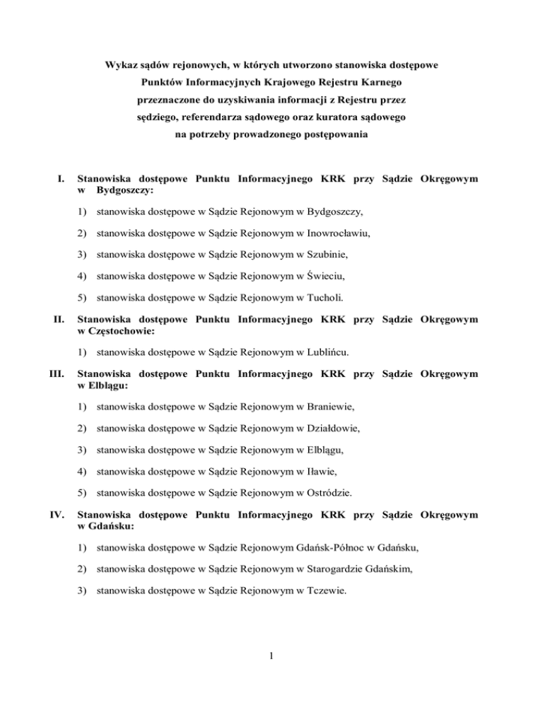 Wykaz sądów rejonowych, w których utworzono stanowiska dostępowe Punktów Informacyjnych Krajowego Rejestru Karnego przeznaczone do uzyskiwania informacji z Rejestru przez sędziego, referendarza sądowego oraz kuratora sądowego na potrzeby prowadzonego postępowania I. Stanowiska dostępowe Punktu Informacyjnego KRK przy Sądzie Okręgowym w Bydgoszczy: 1) stanowiska dostępowe w Sądzie Rejonowym w Bydgoszczy, 2) stanowiska dostępowe w Sądzie Rejonowym w Inowrocławiu, 3) stanowiska dostępowe w Sądzie Rejonowym w Szubinie, 4) stanowiska dostępowe w Sądzie Rejonowym w Świeciu, 5) stanowiska dostępowe w Sądzie Rejonowym w Tucholi. II. Stanowiska dostępowe Punktu Informacyjnego KRK przy Sądzie Okręgowym w Częstochowie: 1) stanowiska dostępowe w Sądzie Rejonowym w Lublińcu. III. Stanowiska dostępowe Punktu Informacyjnego KRK przy Sądzie Okręgowym w Elblągu: 1) stanowiska dostępowe w Sądzie Rejonowym w Braniewie, 2) stanowiska dostępowe w Sądzie Rejonowym w Działdowie, 3) stanowiska dostępowe w Sądzie Rejonowym w Elblągu, 4) stanowiska dostępowe w Sądzie Rejonowym w Iławie, 5) stanowiska dostępowe w Sądzie Rejonowym w Ostródzie. IV. Stanowiska dostępowe Punktu Informacyjnego KRK przy Sądzie Okręgowym w Gdańsku: 1) stanowiska dostępowe w Sądzie Rejonowym Gdańsk-Północ w Gdańsku, 2) stanowiska dostępowe w Sądzie Rejonowym w Starogardzie Gdańskim, 3) stanowiska dostępowe w Sądzie Rejonowym w Tczewie. 1 V. Stanowiska dostępowe Punktu Informacyjnego KRK przy Sądzie Okręgowym w Gliwicach: 1) stanowiska dostępowe w Sądzie Rejonowym w Gliwicach. VI. Stanowiska dostępowe Punktu Informacyjnego KRK przy Sądzie Okręgowym w Gorzowie Wielkopolskim: 1) stanowiska dostępowe w Sądzie Rejonowym w Gorzowie Wielkopolskim, 2) stanowiska dostępowe w Sądzie Rejonowym w Międzyrzeczu, 3) stanowiska dostępowe w Sądzie Rejonowym w Słubicach, 4) stanowiska dostępowe w Sądzie Rejonowym w Strzelcach Krajeńskich. VII. Stanowiska dostępowe Punktu Informacyjnego KRK przy Sądzie Okręgowym w Katowicach: 1) stanowiska dostępowe w Sądzie Rejonowym w Bytomiu, 2) stanowiska dostępowe w Sądzie Rejonowym w Chorzowie, 3) stanowiska dostępowe w Sądzie Rejonowym w Dąbrowie Górniczej, 4) stanowiska dostępowe w Sądzie Rejonowym Katowice-Wschód w Katowicach, 5) stanowiska dostępowe w Sądzie Rejonowym Katowice-Zachód w Katowicach, 6) stanowiska dostępowe w Sądzie Rejonowym w Mikołowie, 7) stanowiska dostępowe w Sądzie Rejonowym w Mysłowicach, 8) stanowiska dostępowe w Sądzie Rejonowym w Pszczynie, 9) stanowiska dostępowe w Sądzie Rejonowym w Sosnowcu, 10) stanowiska dostępowe w Sądzie Rejonowym w Tychach. VIII. Stanowiska dostępowe Punktu Informacyjnego KRK przy Sądzie Okręgowym w Kielcach: 1) stanowiska dostępowe w Sądzie Rejonowym w Jędrzejowie, 2) stanowiska dostępowe w Sądzie Rejonowym w Kielcach, 3) stanowiska dostępowe w Sądzie Rejonowym w Końskich, 4) stanowiska dostępowe w Sądzie Rejonowym w Sandomierzu, 5) stanowiska dostępowe w Sądzie Rejonowym w Skarżysku-Kamiennej, 6) stanowiska dostępowe w Sądzie Rejonowym w Staszowie. 2 IX. Stanowiska dostępowe Punktu Informacyjnego KRK przy Sądzie Okręgowym w Koninie: 1) stanowiska dostępowe w Sądzie Rejonowym w Koninie, 2) stanowiska dostępowe w Sądzie Rejonowym w Słupcy, 3) stanowiska dostępowe w Sądzie Rejonowym w Turku. X. Stanowiska dostępowe Punktu Informacyjnego KRK przy Sądzie Okręgowym w Koszalinie 1) stanowiska dostępowe w Sądzie Rejonowym w Kołobrzegu, 2) stanowiska dostępowe w Sądzie Rejonowym w Koszalinie. XI. Stanowiska dostępowe Punktu Informacyjnego KRK przy Sądzie Okręgowym w Krakowie: 1) stanowiska dostępowe w Sądzie Rejonowym w Chrzanowie, 2) stanowiska dostępowe w Sądzie Rejonowym dla Krakowa-Śródmieścia w Krakowie, 3) stanowiska dostępowe w Sądzie Rejonowym w Myślenicach, 4) stanowiska dostępowe w Sądzie Rejonowym w Olkuszu, 5) stanowiska dostępowe w Sądzie Rejonowym w Oświęcimiu, 6) stanowiska dostępowe w Sądzie Rejonowym w Suchej Beskidzkiej, 7) stanowiska dostępowe w Sądzie Rejonowym w Wadowicach, 8) stanowiska dostępowe w Sądzie Rejonowym w Wieliczce. XII. Stanowiska dostępowe Punktu Informacyjnego KRK przy Sądzie Okręgowym w Krośnie: 1) stanowiska dostępowe w Sądzie Rejonowym w Jaśle, 2) stanowiska dostępowe w Sądzie Rejonowym w Krośnie, 3) stanowiska dostępowe w Sądzie Rejonowym w Lesku, 4) stanowiska dostępowe w Sądzie Rejonowym w Sanoku. XIII. Stanowiska dostępowe Punktu Informacyjnego KRK przy Sądzie Okręgowym w Łomży: 1) stanowiska dostępowe w Sądzie Rejonowym w Grajewie, 2) stanowiska dostępowe w Sądzie Rejonowym w Łomży, 3 3) stanowiska dostępowe w Sądzie Rejonowym w Wysokiem Mazowieckiem, 4) stanowiska dostępowe w Sądzie Rejonowym w Zambrowie. XIV. Stanowiska dostępowe Punktu Informacyjnego KRK przy Sądzie Okręgowym w Nowym Sączu: 1) stanowiska dostępowe w Sądzie Rejonowym w Gorlicach. XV. Stanowiska dostępowe Punktu Informacyjnego KRK przy Sądzie Okręgowym w Olsztynie: 1) stanowiska dostępowe w Sądzie Rejonowym w Kętrzynie, 2) stanowiska dostępowe w Sądzie Rejonowym w Mrągowie, 3) stanowiska dostępowe w Sądzie Rejonowym w Olsztynie. XVI. Stanowiska dostępowe Punktu Informacyjnego KRK przy Sądzie Okręgowym w Ostrołęce: 1) stanowiska dostępowe w Sądzie Rejonowym w Ostrołęce, 2) stanowiska dostępowe w Sądzie Rejonowym w Ostrowi Mazowieckiej, 3) stanowiska dostępowe w Sądzie Rejonowym w Pułtusku, 4) stanowiska dostępowe w Sądzie Rejonowym w Wyszkowie. XVII. Stanowiska dostępowe Punktu Informacyjnego KRK przy Sądzie Okręgowym w Płocku: 1) stanowiska dostępowe w Sądzie Rejonowym w Ciechanowie, 2) stanowiska dostępowe w Sądzie Rejonowym w Mławie, 3) stanowiska dostępowe w Sądzie Rejonowym w Płońsku, 4) stanowiska dostępowe w Sądzie Rejonowym w Sochaczewie, 5) stanowiska dostępowe w Sądzie Rejonowym w Żyrardowie. XVIII. Stan