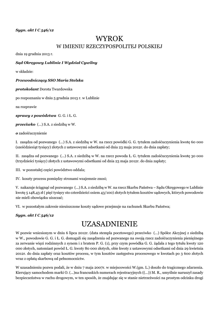 Sygn. akt I C 546/12 WYROK W IMIENIU RZECZYPOSPOLITEJ POLSKIEJ dnia 19 grudnia 2013 r. Sąd Okręgowy Lublinie I Wydział Cywilny w składzie: Przewodniczący SSO Maria Stelska protokolant Dorota Twardowska po rozpoznaniu w dniu 5 grudnia 2013 r. w Lublinie na rozprawie sprawy z powództwa G. G. i Ł. G. przeciwko (...) S.A. z siedzibą w W. o zadośćuczynienie I. zasądza od pozwanego (...) S.A. z siedzibą w W. na rzecz powódki G. G. tytułem zadośćuczynienia kwotę 60 000 (sześćdziesiąt tysięcy) złotych z ustawowymi odsetkami od dnia 23 maja 2012r. do dnia zapłaty; II. zasądza od pozwanego (...) S.A. z siedzibą w W. na rzecz powoda Ł. G. tytułem zadośćuczynienia kwotę 30 000 (trzydzieści tysięcy) złotych z ustawowymi odsetkami od dnia 23 maja 2012r. do dnia zapłaty; III. w pozostałej części powództwo oddala; IV. koszty procesu pomiędzy stronami wzajemnie znosi; V. nakazuje ściągnąć od pozwanego (...) S.A. z siedzibą w W. na rzecz Skarbu Państwa – Sądu Okręgowego w Lublinie kwotę 5 148,43 zł ( pięć tysięcy sto czterdzieści osiem 43/100) złotych tytułem kosztów sądowych, których powodowie nie mieli obowiązku uiszczać; VI. w pozostałym zakresie nieuiszczone koszty sądowe przejmuje na rachunek Skarbu Państwa; Sygn. akt I C 546/12 UZASADNIENIE W pozwie wniesionym w dniu 6 lipca 2012r. (data stempla pocztowego) przeciwko (...) Spółce Akcyjnej z siedzibą w W., powodowie G. G. i Ł. G. domagali się zasądzenia od pozwanego na swoją rzecz zadośćuczynienia pieniężnego za zerwanie więzi rodzinnych z synem i z bratem P. G. (1), przy czym powódka G. G. żądała z tego tytułu kwoty 120 000 złotych, natomiast powód Ł. G. kwoty 80 000 złotych, obie kwoty z ustawowymi odsetkami od dnia 29 kwietnia 2012r. do dnia zapłaty oraz kosztów procesu, w tym kosztów zastępstwa procesowego w kwotach po 3 600 złotych wraz z opłatą skarbową od pełnomocnictw. W uzasadnieniu pozwu podali, że w dniu 7 maja 2007r. w miejscowości W.(gm. L.) doszło do tragicznego zdarzenia. Kierujący samochodem marki O. (...)na francuskich numerach rejestracyjnych ((...)) M. R., umyślnie naruszył zasady bezpieczeństwa w ruchu drogowym, w ten sposób, że znajdując się w stanie nietrzeźwości na prostym odcinku drogi nie dostosował prędkości do panujących warunków drogowych i podczas wykonywania manewru wyprzedzania utracił panowanie nad kierowanym pojazdem w następstwie czego zjechał na lewy pas ruchu, doprowadzając do czołowobocznego zderzenia z jadącym z przeciwnego kierunku (...)wraz z naczepą. W wyniku zdarzenia śmierć na miejscu poniosły trzy osoby: kierujący O. (...)M. R.oraz dwaj pasażerowi, m.in. P. G. (1). W związku z tym, że sprawca wypadku poniósł śmierć na skutek obrażeń ciała, zostało wydane przez Prokuraturę Rejonową w Lubartowie postanowienie o umorzeniu śledztwa. Odpowiedzialność pozwanego wynika z ubezpieczenia odpowiedzialności cywilnej sprawcy wypadku, na podstawie art. 34 ustawy z dnia 22 maja 2003r. o ubezpieczeniach obowiązkowych, Ubezpieczeniowym Funduszu Gwarancyjnym i Polskim Biurze Ubezpieczycieli Komunikacyjnych. Powodowie za pośrednictwem firmy (...)zgłosili pozwanemu wnioski o likwidację szkody załączając komplet dokumentów i określili szczegółowo wartość roszczeń. Do dnia wniesienia pozwu ubezpieczyciel nie wypłacił powodom żadnej kwoty tytułem zadośćuczynienia, mimo powstania przesłanki z art. 817 k.c. Żądane roszczenie o zapłatę kwot zadośćuczynienia znajduje oparcie w art. 448 k.c. w zw. z art. 24§ 1 k.c., gdyż wskutek śmierci osoby najbliższej, spowodowanej zawinionym działaniem sprawcy wypadku, doszło do bezprawnego naruszenia dóbr osobistych powodów w postaci więzi rodzinnych. P. G. (1)w chwili wypadku miał 25 lat. Był osobą w pełni zdrową, mającą mnóstwo planów życiowych. Powódka G. G.od 2000r. jest wdową. Syn P.mieszkał wraz z żoną i córką w domu jednorodzinnym powódki. Aktywnie pomagał w pracach przydomowych. Był dla powódki oparciem w trudnych sytuacjach życiowych. Zawsze służył pomocą i radą. Wszystkie kłopoty i problemy rozwiązywali wspólnymi siłami. Wsparcie ze strony najstarszego syna było dla powódki G. G.szczególnie istotne w chwili, kiedy zmarł jej małżonek. P. G. (1)miał 18 lat i to on wówczas pełnił rolę gospodarza domu i opiekuna rodziny. To dzięki P.udało się po wielu latach otrząsnąć powódce po śmierci męża. Śmierć syna P.stała się dla powódki ogromną tragedią, przygnębiła ją i spowodowała załamanie psychiczne, a także utratę chęci do dalszego życia. Wszystko stało się dla niej bezsensowne i nie mające żadnego celu. Po śmierci syna poczuła ogromną pustkę i osamotnienie. Jej cierpienia psychiczne wyraźnie przełożyły się na osłabienie aktywności życiowej, poczucie poniesionej straty powodował wręcz fizyczny ból. Jednak powódka pozostała z młodszym synem Ł., który w chwili zdarzenia miał 20 lat i wnuczką W.ur. (...)– córką zmarłego P.i to oni trzymali ją przy życiu. Przez okres dwóch lat od śmierci syna powódka nie mogła spać, jeść, była ciągle smutna, płakała, wsłuchiwała się, czy nie usłyszy głosu syna, czy nie wraca do domu, całe dnie spędzała na cmentarzu. Wpadła w depresję, przyjmowała leki przeciwdepresyjne na skutek stwierdzonej nerwicy sytuacyjnej. Z powodu pogorszenia się stanu zdrowia powódka jest leczona od 2002r. w Poradni Zdrowia Psychicznego z rozpoznanie reakcji lękowo-depresyjnej. Zgodnie z orzeczeniem lekarza orzecznika ZUS powódka jest całkowicie niezdolna do pracy do dnia 30 kwietnia 2013r. Dodatkowo powódka została pozbawiona przez synową – żonę zmarłego P. G. (1), kontaktów ze swoją wnuczką W., z którą miała bardzo silną więź emocjonalną. Jest to oczywista strata powódki spowodowana śmiercią syna. Powód Ł. G.równie boleśnie przeżył śmierć o 5 lat starszego brat