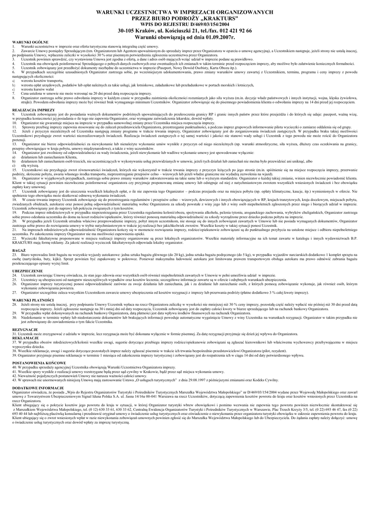 WARUNKI UCZESTNICTWA W IMPREZACH ORGANIZOWANYCH PRZEZ BIURO PODROŻY „KRAKTURS” WPIS DO REJESTRU D/469/03/154/2004 30-105 Kraków, ul. Kościuszki 21, tel./fax. 012 421 92 66 Warunki obowiązują od dnia 01.09.2007r. WARUNKI OGÓLNE 1. Warunki uczestnictwa w imprezie oraz oferta turystyczna stanowią integralną część umowy. 2. Zawarcie Umowy pomiędzy Sprzedającym (tzn. Organizatorem lub Agentem upoważnionym do sprzedaży imprez przez Organizatora w oparciu o umowę agencyjną), a Uczestnikiem następuje, jeżeli strony nie ustalą inaczej, po podpisaniu Umowy, wpłaceniu zaliczki w wysokości 30 % oraz pisemnym potwierdzeniu zgłoszenia uczestnictwa przez Organizatora. 3. Uczestnik powinien sprawdzić, czy wystawiona Umowa jest zgodna z ofertą, a dane i adres osób mających wziąć udział w imprezie podane są prawidłowo. 4. Uczestnik ma obowiązek poinformować Sprzedającego o pełnych danych osobowych oraz ewentualnych ich zmianach w takim terminie przed rozpoczęciem imprezy, aby możliwe było załatwienie koniecznych formalności. 5. Uczestnik zobowiązany jest przedłożyć dokumenty niezbędne do uczestnictwa w imprezie (Paszport, Nowy Dowód Osobisty, Karta Obozu itp.). 6. W przypadkach szczególnie uzasadnionych Organizator zastrzega sobie, po wcześniejszym udokumentowaniu, prawo zmiany warunków umowy zawartej z Uczestnikiem, terminu, programu i ceny imprezy z powodu następujących okoliczności: a) wzrostu kosztów transportu, b) wzrostu opłat urzędowych, podatków lub opłat należnych za takie usługi, jak lotniskowe, załadunkowe lub przeładunkowe w portach morskich i lotniczych, c) wzrostu kursów walut 7. Cena ustalona w umowie nie może wzrosnąć na 20 dni przed datą rozpoczęcia imprezy. 8. Organizator zastrzega sobie prawo odwołania imprezy w każdym czasie w przypadku zaistnienia okoliczności rozumianych jako siła wyższa (m.in. decyzje władz państwowych i innych instytucji, wojna, klęska żywiołowa, strajki). Powodem odwołania imprezy może być również brak wymaganego minimum Uczestników. Organizator zobowiązuje się do pisemnego powiadomienia klienta o odwołaniu imprezy na 14 dni przed jej rozpoczęciem. REALIZACJA IMPREZY 9. Uczestnik zobowiązany jest do posiadania ważnych dokumentów podróżnych upoważniających do przekroczenia granicy RP i granic innych państw przez które przejeżdża i do których się udaje: paszport, ważną wizę, w przypadku konieczności jej posiadania o ile tego nie zapewnia Organizator, oraz wymagane zaświadczenia lekarskie, dowód wpłaty. 10. Organizator nie gwarantuje miejsca na imprezie w przypadku samowolnej zmiany przez Uczestnika miejsca rozpoczęcia imprezy. 11. Sprawny przebieg imprezy zapewnia stosowanie się do zaleceń przedstawiciela Organizatora, przestrzeganie punktualności, a podczas imprez grupowych informowanie pilota wycieczki o zamiarze oddalenia się od grupy. 12. Jeżeli z przyczyn niezależnych od Uczestnika następują zmiany programu w trakcie trwania imprezy, Organizator zobowiązany jest do zorganizowania świadczeń zastępczych. W przypadku braku takiej możliwości Uczestnikowi przysługuje zwrot wartości niezrealizowanych świadczeń. Realizacja świadczeń zastępczych o tej samej wartości i jakości nie stanowi wady usługi i Uczestnik z tego powodu nie może rościć do Organizatora pretensji. 13. Organizator nie bierze odpowiedzialności za niewykonanie lub nienależyte wykonanie umów wynikłe z przyczyn od niego niezależnych (np. warunki atmosferyczne, siła wyższa, dłuższy czas oczekiwania na granicy, przepisy obowiązujące w kraju pobytu, umowy międzynarodowe), a także z winy uczestników. 14. Organizator jest zwolniony od odpowiedzialności za wady świadczenia, jeżeli niewykonanie lub wadliwe wykonanie umowy jest spowodowane wyłącznie: a) działaniem lub zaniechaniem Klienta, b) działaniem lub zaniechaniem osób trzecich, nie uczestniczących w wykonywaniu usług przewidzianych w umowie, jeżeli tych działań lub zaniechań nie można było przewidzieć ani uniknąć, albo c) siłą wyższą. 15. Uczestnikowi nie przysługuje zwrot równowartości świadczeń, których nie wykorzystał w trakcie trwania imprezy z przyczyn leżących po jego stronie (m.in. spóźnienie się na miejsce rozpoczęcia imprezy, przerwanie podróży, skrócenie pobytu, awaria własnego środka transportu, nieprzestrzeganie przepisów celno – wizowych lub jeżeli władze graniczne nie wydadzą zezwolenia na wjazd). 16. Organizator w wyjątkowych przypadkach, zastrzega sobie prawo zmiany warunków zakwaterowania na takie same lub o wyższym standardzie. Organizator o każdej takiej zmianie, winien niezwłocznie powiadomić klienta. Klient w takiej sytuacji powinien niezwłocznie poinformować organizatora czy przyjmuje proponowaną zmianę umowy lub odstępuje od niej z natychmiastowym zwrotem wszystkich wniesionych świadczeń i bez obowiązku zapłaty kary umownej. 17. Uczestnik zobowiązany jest do uiszczenia wszelkich lokalnych opłat, o ile nie zapewnia tego Organizator – podczas przejazdu oraz na miejscu pobytu (np. opłaty klimatyczne, kaucje, itp.) wymienionych w ofercie. Nie spełnienie tego obowiązku może skutkować odmową wykonania świadczeń. 18. W czasie trwania imprezy Uczestnik zobowiązuje się do przestrzegania regulaminów i przepisów celno – wizowych, dewizowych i innych obowiązujących w RP, krajach tranzytowych, kraju docelowym, miejscach pobytu, zwiedzanych obiektach, autokarze oraz ponosi pełną odpowiedzialność materialną wobec Organizatora za szkody powstałe z winy jego lub z winy osób niepełnoletnich zgłoszonych przez niego i biorących udział w imprezie. Uczestnik zobowiązany jest do naprawy lub pokrycia związanych z tym kosztów. 19. Podczas imprez młodzieżowych w przypadku nieprzestrzegania przez Uczestnika regulaminu kolonii/obozu, spożywania alkoholu, palenia tytoniu, aroganckiego zachowania, wybryków chulig