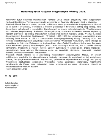egoturystyka.pl Data: 2017-03-09 Honorowy tytuł Pasjonat Przypisanych Północy 2016. Honorowy tytuł Pasjonat Przypisanych Północy 2016 został przyznany Panu Wojciechowi Markowi Darskiemu. Termin uroczystości wręczenia tej Nagrody planowany jest w styczniu. Wojciech Marek Darski - poeta, prozaik, publicysta, autor przewodników turystycznych. Urodził się w 1958 r. w Giżycku, w mieście, z którym pozostaje w twórczej i pełnej pasji relacji. Jako dziennikarz debiutował w suwalskich Krajobrazach w latach osiemdziesiątych. Współpracował też z Gazetą Współczesną i Radarem, Gazetą Giżycką, Kurierem Podlaskim, Gazetą Wyborczą, Radiem Białystok i telewizją, magazynem Ratusz oraz pismem Warsaw Voice. W 1997 r. został dziennikarzem Tygodnika Solidarność. W latach 1979-1983 był członkiem gołdapskiej grupy twórczej Dom Marka, w 1983 r. założycielem interdyscyplinarnej Grupy Twórczej SDS. Jest również współzałożycielem giżyckiego Stowarzyszenia "Wspólnota Mazurska", które istnieje od początków lat 90-tych. Związany ze środowiskiem olsztyńskiej Wspólnoty Kulturowej Borussia. Autor kilkunastu pozycji książkowych (m.in.: Mała Antologia Mazurska, My, Krzyżaki. Goniąc kormorany, Pocztówki z Mazur). Swoje utwory publikował w antologiach, prasie krajowej i zagranicznej. Jego wiersze tłumaczono m.in. na angielski, niemiecki, francuski, rosyjski, litewski, serbsko-chorwacki i macedoński. Wojciech Marek Darski to z pewnością niestrudzony popularyzator Mazur. W swoich publikacjach przybliża ich skomplikowaną historię, zaprasza do wędrówki po tej wyjątkowej krainie, fascynuje ciekawostkami i wyobraźnią, przetwarza zapomnienie na poezję oraz prozę. Wrażliwość poetyckiego spojrzenia Wojciecha Marka Darskiego, ciekawość, niezmienne zamiłowanie do Mazur oraz całokształt pracy wykonanej na rzecz utrwalenia historii są niezaprzeczalnie wielkim atutem. [www.przypisani.org] 11 - 12 - 2016 Administrator egoturystyka.pl Administrator Strona 1 z 1