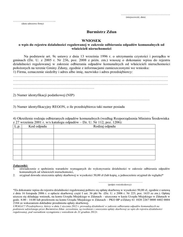 …………………………………. (miejscowość, data) …………………………….. (dane adresowe firmy) Burmistrz Zdun WNIOSEK o wpis do rejestru działalności regulowanej w zakresie odbierania odpadów komunalnych od właścicieli nieruchomości Na podstawie art. 9c ustawy z dnia 13 września 1996 r. o utrzymaniu czystości i porządku w gminach (Dz. U. z 2005 r. Nr 236, poz. 2008 z późn. zm.) wnoszę o dokonanie wpisu do rejestru działalności regulowanej w zakresie odbierania odpadów komunalnych od właścicieli nieruchomości położonych na terenie Gminy Zduny, zgodnie z informacjami zamieszczonymi we wniosku: 1) Firma, oznaczenie siedziby i adres albo imię, nazwisko i adres przedsiębiorcy: ……………………………………………………………………………………………………………… ……………………………………………………………………………………………………………… ……………………………………………………………………………………………………………… ………………………………………………………… 2) Numer identyfikacji podatkowej (NIP) ………………………………………………………………………………………………… 3) Numer identyfikacyjny REGON, o ile przedsiębiorca taki numer posiada ………………………………………………………………………………………………… 4) Określenie rodzaju odbieranych odpadów komunalnych (według Rozporządzenia Ministra Środowiska z 27 września 2001 r. w/s katalogu odpadów – Dz. U. Nr 112, poz. 1206): L.p. Kod odpadu Rodzaj odpadu Załączniki: 1. oświadczenie o spełnieniu warunków wymaganych do wykonywania działalności w zakresie odbierania odpadów komunalnych od właścicieli nieruchomości, 2. oryginał dowodu uiszczenia opłaty skarbowej w wysokości 50,00 zł (lub kopię, a jednocześnie oryginał do wglądu)* .…………………………………… (podpis wnioskodawcy) *Za dokonanie wpisu do rejestru działalności regulowanej pobiera się opłatę skarbową w wysokości 50,00 zł, zgodnie z ustawą z dnia 16 listopada 2006 r. o opłacie skarbowej część I ust. 36 pkt 9a (Dz. U. z 2006 r. Nr 225, poz. 1635 ze zm.). Opłatę uiszcza się składając wniosek, na konto Urzędu Miejskiego w Zdunach – uiszczona w kasie Urzędu Miejskiego w Zdunach w godz. 8.00 - 14.00 lub przelewem na konto Urzędu Miejskiego w Zdunach – PKO BP o/Zduny 61 1020 2267 0000 4402 0004 2184 ze wskazaniem dokładnie przedmiotu opłaty skarbowej. UWAGA!!! Przedsiębiorcy, którzy w dniu 1 stycznia 2012 r. prowadzą działalność w zakresie odbierania odpadów komunalnych na podstawie udzielonego przez Burmistrza Zdun zezwolenia, są zwolnieni z wnoszenia opłaty skarbowej za wpis do rejestru działalności regulowanej, pod warunkiem wystąpienia z wnioskiem do 31 grudnia 2012r. ………………………………………….. (miejsce i data złożenia oświadczenia) …………………………………………... …………………………………………... …………………………………………… (firma, oznaczenie siedziby i adres albo imię, nazwisko i adres przedsiębiorcy) OŚWIADCZENIE o spełnieniu warunków wymaganych do wykonywania działalności w zakresie odbierania odpadów komunalnych od właścicieli nieruchomości Oświadczam, że: 1) dane zawarte we wniosku o wpis do rejestru działalności regulowanej w zakresie odbierania odpadów komunalnych od właścicieli nieruchomości są kompletne i zgodne z prawdą; 2) znane mi są i spełniam warunki wykonywania działalności w zakresie odbierania odpadów komunalnych od właścicieli nieruchomości, określone w ustawie z dnia 13 września 1996 r. o utrzymaniu czystości i porządku w gminach (Dz. U. z 2005 r. Nr 236, poz. 2008 z późn. zm.). Niniejsze oświadczenie składam pouczony/a o odpowiedzialności karnej z art. 233 §1 Kodeksu karnego „Kto składając zeznanie mające służyć za dowód w postępowaniu sądowym lub innym postępowaniu prowadzonym na podstawie ustawy, zeznaje nieprawdę lub zataja prawdę, podlega karze pozbawienia wolności do lat 3”. …………………………………………………………………….. (podpis przedsiębiorcy lub osoby uprawnionej do reprezentowania przedsiębiorcy, ze wskazaniem imienia i nazwiska oraz pełnionej funkcji)