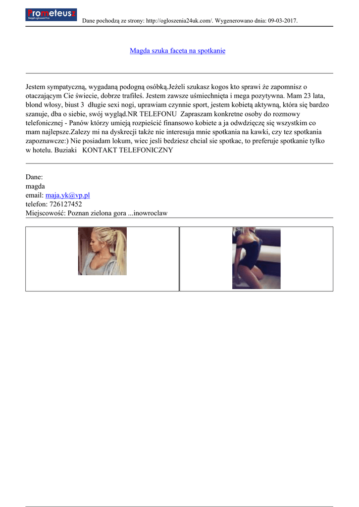 Dane pochodzą ze strony: http://ogloszenia24uk.com/. Wygenerowano dnia: 09-03-2017. Magda szuka faceta na spotkanie Jestem sympatyczną, wygadaną podogną osóbką.Jeżeli szukasz kogos kto sprawi że zapomnisz o otaczającym Cie świecie, dobrze trafiłeś. Jestem zawsze uśmiechnięta i mega pozytywna. Mam 23 lata, blond włosy, biust 3 długie sexi nogi, uprawiam czynnie sport, jestem kobietą aktywną, która się bardzo szanuje, dba o siebie, swój wygląd.NR TELEFONU Zapraszam konkretne osoby do rozmowy telefonicznej - Panów którzy umieją rozpieścić finansowo kobiete a ja odwdzięczę się wszystkim co mam najlepsze.Zalezy mi na dyskrecji także nie interesuja mnie spotkania na kawki, czy tez spotkania zapoznawcze:) Nie posiadam lokum, wiec jesli bedziesz chcial sie spotkac, to preferuje spotkanie tylko w hotelu. Buziaki KONTAKT TELEFONICZNY Dane: magda email: [email protected] telefon: 726127452 Miejscowość: Poznan zielona gora ...inowroclaw