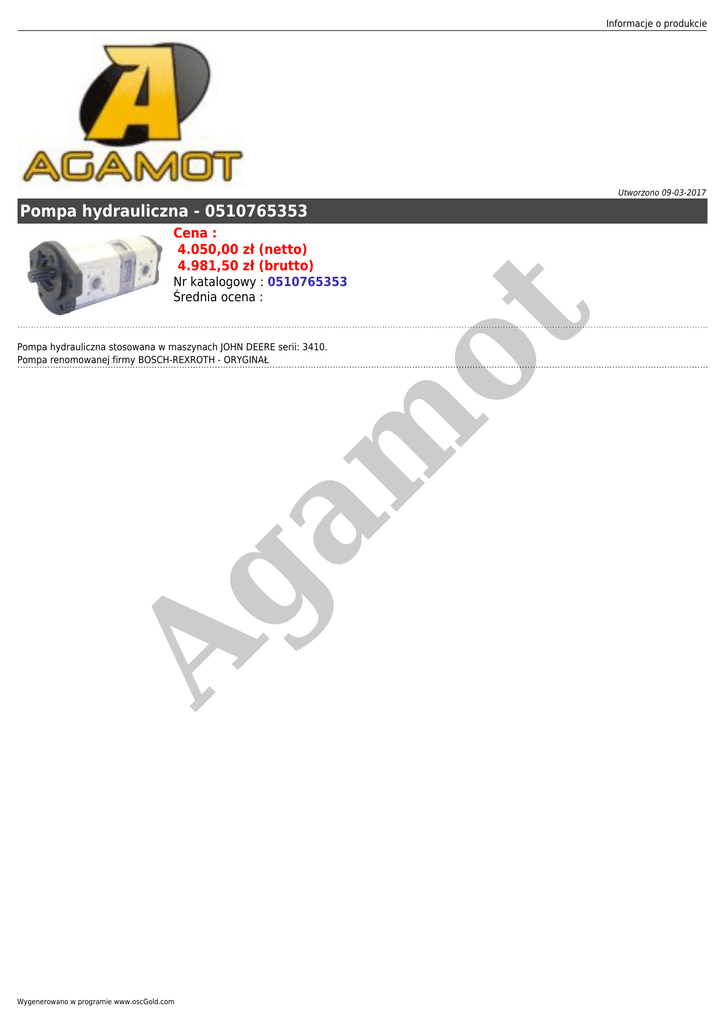 Informacje o produkcie Utworzono 09-03-2017 Pompa hydrauliczna - 0510765353 Cena : 4.050,00 zł (netto) 4.981,50 zł (brutto) Ag am Pompa hydrauliczna stosowana w maszynach JOHN DEERE serii: 3410. Pompa renomowanej firmy BOSCH-REXROTH - ORYGINAŁ ot Nr katalogowy : 0510765353 Średnia ocena : Wygenerowano w programie www.oscGold.com