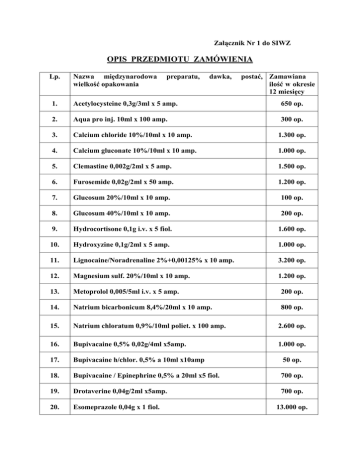 Załącznik Nr 1 do SIWZ OPIS PRZEDMIOTU ZAMÓWIENIA Lp. Nazwa międzynarodowa wielkość opakowania preparatu, dawka, postać, Zamawiana ilość w okresie 12 miesięcy 1. Acetylocysteine 0,3g/3ml x 5 amp. 650 op. 2. Aqua pro inj. 10ml x 100 amp. 300 op. 3. Calcium chloride 10%/10ml x 10 amp. 1.300 op. 4. Calcium gluconate 10%/10ml x 10 amp. 1.000 op. 5. Clemastine 0,002g/2ml x 5 amp. 1.500 op. 6. Furosemide 0,02g/2ml x 50 amp. 1.200 op. 7. Glucosum 20%/10ml x 10 amp. 100 op. 8. Glucosum 40%/10ml x 10 amp. 200 op. 9. Hydrocortisone 0,1g i.v. x 5 fiol. 1.600 op. 10. Hydroxyzine 0,1g/2ml x 5 amp. 1.000 op. 11. Lignocaine/Noradrenaline 2%+0,00125% x 10 amp. 3.200 op. 12. Magnesium sulf. 20%/10ml x 10 amp. 1.200 op. 13. Metoprolol 0,005/5ml i.v. x 5 amp. 200 op. 14. Natrium bicarbonicum 8,4%/20ml x 10 amp. 800 op. 15. Natrium chloratum 0,9%/10ml poliet. x 100 amp. 2.600 op. 16. Bupivacaine 0,5% 0,02g/4ml x5amp. 1.000 op. 17. Bupivacaine h/chlor. 0,5% a 10ml x10amp 50 op. 18. Bupivacaine / Epinephrine 0,5% a 20ml x5 fiol. 700 op. 19. Drotaverine 0,04g/2ml x5amp. 700 op. 20. Esomeprazole 0,04g x 1 fiol. 13.000 op. str. 2 Załącznika Nr 1 do SIWZ 21. Ketoprofenum 0,1g/2ml i.m./i.v. x 10 amp. 3.000 op. 22. Metamizole 1g/2ml x5amp. 1.700 op. 23. Metamizole 2,5g/5ml x 5amp. 2.600 op. 24. Methylprednisolone 0,125g/2ml x1 fiol. 25. Methylprednisolone 0,5g/8ml x 1fiol 1.100 op. 26. Methylprednisolone 1g/16ml x1 fiol 150 op. 27. Methylprednisolone 0,04g/ml x 1 fiol. 570 op. 28. Mykofenolan mofetylu 0,5g x 4 fiol 180 op. 29. Ondansetron 0,004g/2ml x 5 amp. 700 op. 30. Oxytocin 5 j.m./ml x 10 amp. 600 op. 31. Pantoprazole 0,04g x 1filo 4.900 op. 32. Phosphates roztw. do wlewek 3.200 op. 33. Prednisolone 0,025g x 10 fiol 1.200 op. 34. Dinoprost 0,005g/5ml x 5amp. 4 op. 35. Ipratropium bromide aerosol 0,02mg/dawka x 200 dawek 40 op. 36. Potassium chloride 15% a 20ml x10fiol. 850 op. 1.200 op.