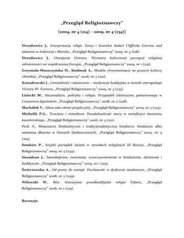 „Przegląd Religioznawczy” [2004, nr 4 (214) – 2009, nr 4 (234)] Drozdowicz J., Interpretacja religii. Zarys i kontekst badań Clifforda Geertza nad islamem w Indonezji i Maroku, „Przegląd Religioznawczy” 2005, nr 4 (218). Drozdowicz J., Oswajanie Orientu. Wymiary kulturowej percepcji religijnej odmienności we współczesnej Europie, „Przegląd Religioznawczy” 2009, nr 1 (231). Grzymała-Moszczyńska H., Siódmak A., Modele chrystianizacji na gruncie kultury chińskiej, „Przegląd Religioznawczy” 2006, nr 3 (221). Kossakowski J., Liminalność i oświecenie – medytacja buddyjska w świetle antropologii Victora W. Turnera, „Przegląd Religioznawczy” 2009, nr 3 (233). Lisiecki M., Nacjonalizm, polityka i religia. Przypadek shintoizmu państwowego w Cesarstwie Japońskim, „Przegląd Religioznawczy” 2008, nr 2 (228). Machálek V., Islam jako ekran projekcyjny, „Przegląd Religioznawczy” 2009, nr 3 (233). Michalik P.G., Trucizna i remedium. Paradoksalność mocy w metafizyce śiwaizmu kaszmirskiego, „Przegląd Religioznawczy” 2006, nr 3 (221). Peck A., Misjonarze hinduistyczni i tradycjonalistyczna hindutva: hinduizm albo sanatana dharma w Stanach Zjednoczonych, „Przegląd Religioznawczy” 2004, nr 4 (214). Semków P., Aryjski porządek świata w rytuałach religijnych III Rzeszy, „Przegląd Religioznawczy” 2009, nr 4 (234). Sieradzan J., Samobójstwo, eutanazja, urzeczywistnienie w hinduizmie, dżinizmie i buddyzmie, „Przegląd Religioznawczy” 2005, nr 1 (215). Świerzowska A., Od prany do energii. Duchowość w dyskursie naukowym, „Przegląd Religioznawczy” 2008, nr 3 (229). Wilowski W., Bön. Starożytna Religioznawczy” 2006, nr 1 (219). Recenzje przedbuddyjska religia Tybetu, „Przegląd Sieradzan J., Paul Williams, Nieoczekiwana droga: nawrócenie z buddyzmu na katolicyzm, „Przegląd Religioznawczy” 2006, nr 4 (222).