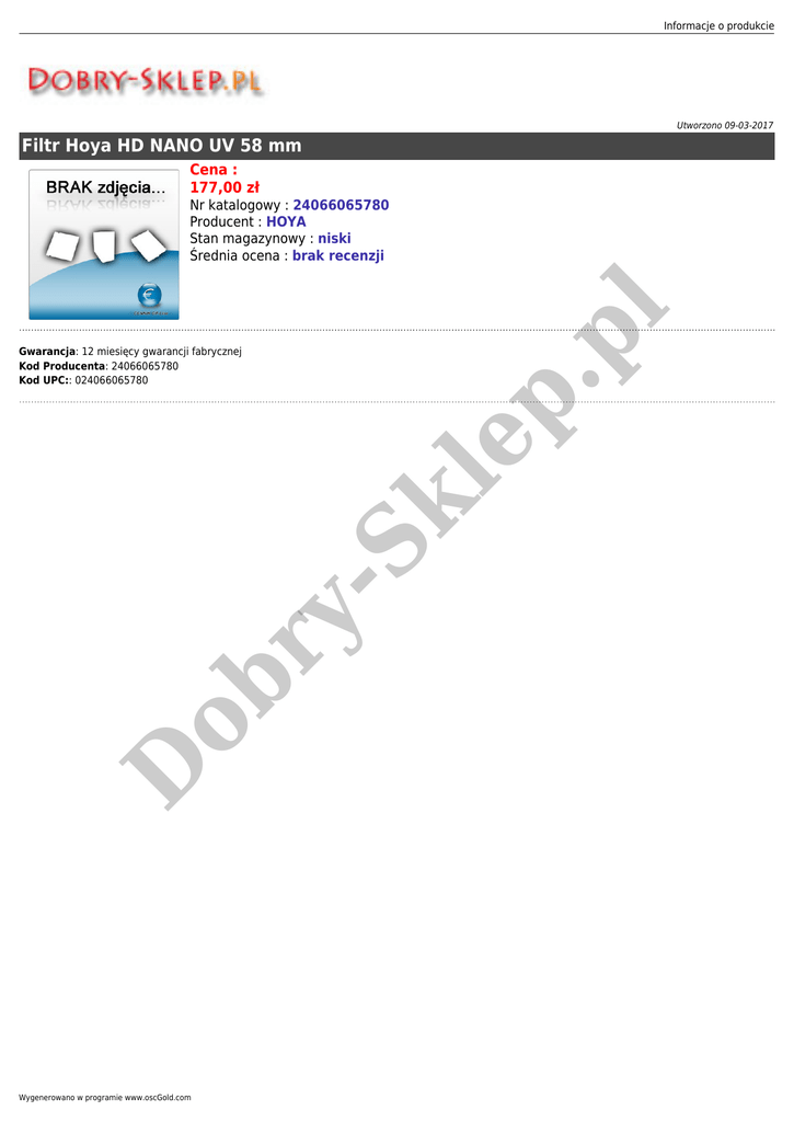 Informacje o produkcie Utworzono 09-03-2017 Filtr Hoya HD NANO UV 58 mm Cena : 177,00 zł p. pl Nr katalogowy : 24066065780 Producent : HOYA Stan magazynowy : niski Średnia ocena : brak recenzji D ob ry - Sk le Gwarancja: 12 miesięcy gwarancji fabrycznej Kod Producenta: 24066065780 Kod UPC:: 024066065780 Wygenerowano w programie www.oscGold.com