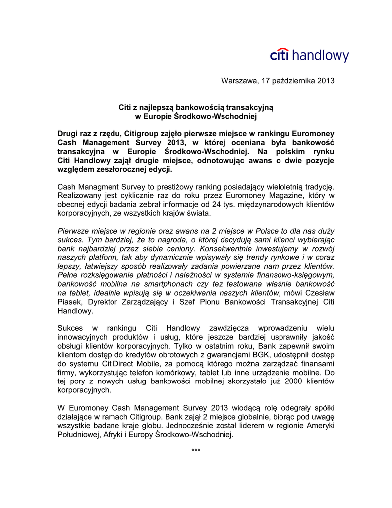 Warszawa, 17 października 2013 Citi z najlepszą bankowością transakcyjną w Europie Środkowo-Wschodniej Drugi raz z rzędu, Citigroup zajęło pierwsze miejsce w rankingu Euromoney Cash Management Survey 2013, w której oceniana była bankowość transakcyjna w Europie Środkowo-Wschodniej. Na polskim rynku Citi Handlowy zajął drugie miejsce, odnotowując awans o dwie pozycje względem zeszłorocznej edycji. Cash Managment Survey to prestiżowy ranking posiadający wieloletnią tradycję. Realizowany jest cyklicznie raz do roku przez Euromoney Magazine, który w obecnej edycji badania zebrał informacje od 24 tys. międzynarodowych klientów korporacyjnych, ze wszystkich krajów świata. Pierwsze miejsce w regionie oraz awans na 2 miejsce w Polsce to dla nas duży sukces. Tym bardziej, że to nagroda, o której decydują sami klienci wybierając bank najbardziej przez siebie ceniony. Konsekwentnie inwestujemy w rozwój naszych platform, tak aby dynamicznie wpisywały się trendy rynkowe i w coraz lepszy, łatwiejszy sposób realizowały zadania powierzane nam przez klientów. Pełne rozksięgowanie płatności i należności w systemie finansowo-księgowym, bankowość mobilna na smartphonach czy tez testowana właśnie bankowość na tablet, idealnie wpisują się w oczekiwania naszych klientów, mówi Czesław Piasek, Dyrektor Zarządzający i Szef Pionu Bankowości Transakcyjnej Citi Handlowy. Sukces w rankingu Citi Handlowy zawdzięcza wprowadzeniu wielu innowacyjnych produktów i usług, które jeszcze bardziej usprawniły jakość obsługi klientów korporacyjnych. Tylko w ostatnim roku, Bank zapewnił swoim klientom dostęp do kredytów obrotowych z gwarancjami BGK, udostępnił dostęp do systemu CitiDirect Mobile, za pomocą którego można zarządzać finansami firmy, wykorzystując telefon komórkowy, tablet lub inne urządzenie mobilne. Do tej pory z nowych usług bankowości mobilnej skorzystało już 2000 klientów korporacyjnych. W Euromoney Cash Management Survey 2013 wiodącą rolę odegrały spółki działające w ramach Citigroup. Bank zajął 2 miejsce globalnie, biorąc pod uwagę wszystkie badane kraje globu. Jednocześnie został liderem w regionie Ameryki Południowej, Afryki i Europy Środkowo-Wschodniej. *** Dodatkowych informacji udziela: Dorota Szostek-Rustecka, Dyrektor Biura Prasowego, tel. (0-22) 692-90 52 E-mail: [email protected] Patrycja Długołęcka-Wójcik, Specjalista ds.kontaktów z mediami, tel. (0-22) 692 94 16 E-mail: [email protected] Andrzej Kubisiak, Specjalista ds.kontaktów z mediami, tel. (0-22) 692 90 52 E-mail: [email protected] Bank Handlowy w Warszawie SA to jedna z największych instytucji finansowych w Polsce, oferująca pod marką Citi Handlowy bogaty i nowoczesny asortyment produktów i usług bankowości korporacyjnej, inwestycyjnej i detalicznej. Bank Handlowy obsługuje 20 tys. klientów korporacyjnych i 851 534 klientów indywidualnych poprzez nowoczesne kanały dystrybucji oraz sieć 87 oddziałów. W skład grupy kapitałowej Banku wchodzą takie podmioty jak: Dom Maklerski Banku Handlowego i Handlowy Leasing. Przynależność do Citigroup, największej na świecie instytucji finansowej, zapewnia klientom Banku Handlowego dostęp do usług finansowych w ponad 100 krajach. Dodatkowe informacje można uzyskać na stronie internetowej www.citihandlowy.pl. Citi (NYSE:C) to wiodąca globalna instytucja finansowa, mająca około 200 milionów klientów w ponad 160 krajach. Poprzez swoje dwie odrębne jednostki operacyjne: Citicorp i Citi Holdings, Citi obsługuje klientów indywidualnych, korporacyjnych, rządowych i instytucjonalnych zapewniając im bogaty wachlarz produktów i usług finansowych w zakresie bankowości detalicznej, bankowości korporacyjnej i inwestycyjnej, usług maklerskich i zarządzania aktywami. Dodatkowe informacje można uzyskać na stronie internetowej www.citigroup.com lub or www.citi.com.