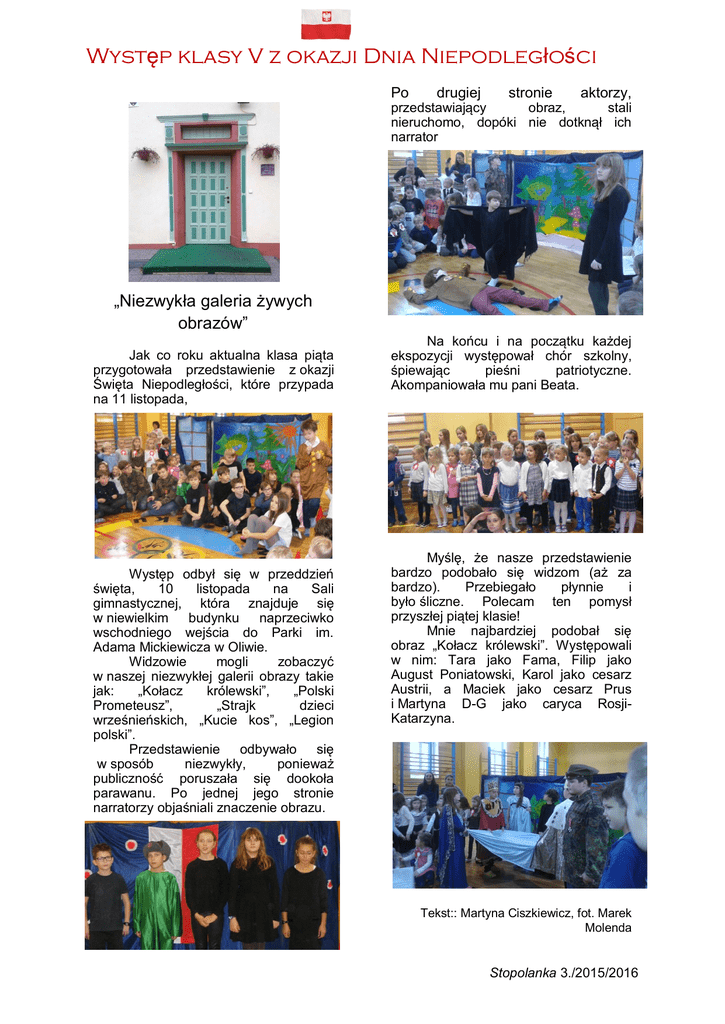 Występ klasy V z okazji Dnia Niepodległości Po drugiej stronie aktorzy, przedstawiający obraz, stali nieruchomo, dopóki nie dotknął ich narrator „Niezwykła galeria żywych obrazów” Jak co roku aktualna klasa piąta przygotowała przedstawienie z okazji Święta Niepodległości, które przypada na 11 listopada, Występ odbył się w przeddzień święta, 10 listopada na Sali gimnastycznej, która znajduje się w niewielkim budynku naprzeciwko wschodniego wejścia do Parki im. Adama Mickiewicza w Oliwie. Widzowie mogli zobaczyć w naszej niezwykłej galerii obrazy takie jak: „Kołacz królewski”, „Polski Prometeusz”, „Strajk dzieci wrześnieńskich, „Kucie kos”, „Legion polski”. Przedstawienie odbywało się w sposób niezwykły, ponieważ publiczność poruszała się dookoła parawanu. Po jednej jego stronie narratorzy objaśniali znaczenie obrazu. Na końcu i na początku każdej ekspozycji występował chór szkolny, śpiewając pieśni patriotyczne. Akompaniowała mu pani Beata. Myślę, że nasze przedstawienie bardzo podobało się widzom (aż za bardzo). Przebiegało płynnie i było śliczne. Polecam ten pomysł przyszłej piątej klasie! Mnie najbardziej podobał się obraz „Kołacz królewski”. Występowali w nim: Tara jako Fama, Filip jako August Poniatowski, Karol jako cesarz Austrii, a Maciek jako cesarz Prus i Martyna D-G jako caryca RosjiKatarzyna. Obraz ożywał w momencie, gdy narrator dotknął go. Jeśli narrator nie Tekst:: Martyna Ciszkiewicz, fot. Marek Molenda Stopolanka 3./2015/2016