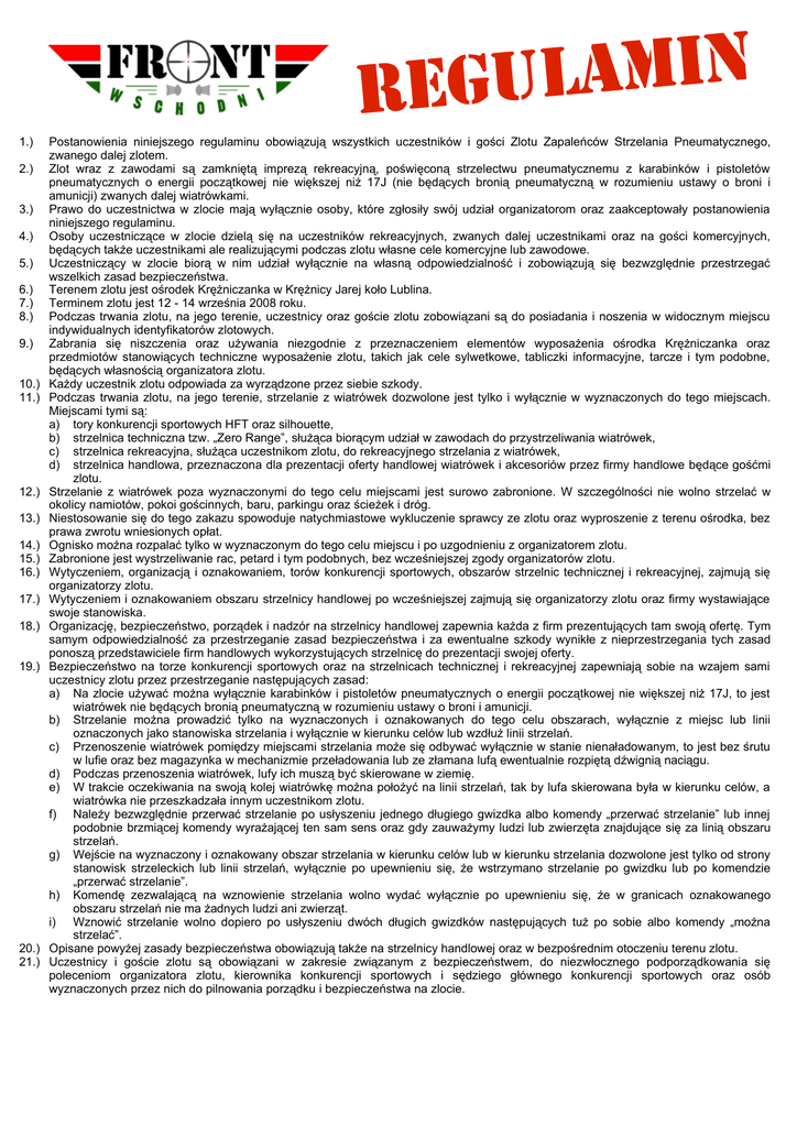 N I M A L REGU 1.) 2.) 3.) 4.) 5.) 6.) 7.) 8.) 9.) 10.) 11.) 12.) 13.) 14.) 15.) 16.) 17.) 18.) 19.) 20.) 21.) Postanowienia niniejszego regulaminu obowiązują wszystkich uczestników i gości Zlotu Zapaleńców Strzelania Pneumatycznego, zwanego dalej zlotem. Zlot wraz z zawodami są zamkniętą imprezą rekreacyjną, poświęconą strzelectwu pneumatycznemu z karabinków i pistoletów pneumatycznych o energii początkowej nie większej niż 17J (nie będących bronią pneumatyczną w rozumieniu ustawy o broni i amunicji) zwanych dalej wiatrówkami. Prawo do uczestnictwa w zlocie mają wyłącznie osoby, które zgłosiły swój udział organizatorom oraz zaakceptowały postanowienia niniejszego regulaminu. Osoby uczestniczące w zlocie dzielą się na uczestników rekreacyjnych, zwanych dalej uczestnikami oraz na gości komercyjnych, będących także uczestnikami ale realizującymi podczas zlotu własne cele komercyjne lub zawodowe. Uczestniczący w zlocie biorą w nim udział wyłącznie na własną odpowiedzialność i zobowiązują się bezwzględnie przestrzegać wszelkich zasad bezpieczeństwa. Terenem zlotu jest ośrodek Krężniczanka w Krężnicy Jarej koło Lublina. Terminem zlotu jest 12 - 14 września 2008 roku. Podczas trwania zlotu, na jego terenie, uczestnicy oraz goście zlotu zobowiązani są do posiadania i noszenia w widocznym miejscu indywidualnych identyfikatorów zlotowych. Zabrania się niszczenia oraz używania niezgodnie z przeznaczeniem elementów wyposażenia ośrodka Krężniczanka oraz przedmiotów stanowiących techniczne wyposażenie zlotu, takich jak cele sylwetkowe, tabliczki informacyjne, tarcze i tym podobne, będących własnością organizatora zlotu. Każdy uczestnik zlotu odpowiada za wyrządzone przez siebie szkody. Podczas trwania zlotu, na jego terenie, strzelanie z wiatrówek dozwolone jest tylko i wyłącznie w wyznaczonych do tego miejscach. Miejscami tymi są: a) tory konkurencji sportowych HFT oraz silhouette, b) strzelnica techniczna tzw. „Zero Range”, służąca biorącym udział w zawodach do przystrzeliwania wiatrówek, c) strzelnica rekreacyjna, służąca uczestnikom zlotu, do rekreacyjnego strzelania z wiatrówek, d) strzelnica handlowa, przeznaczona dla prezentacji oferty handlowej wiatrówek i akcesoriów przez firmy handlowe będące gośćmi zlotu. Strzelanie z wiatrówek poza wyznaczonymi do tego celu miejscami jest surowo zabronione. W szczególności nie wolno strzelać w okolicy namiotów, pokoi gościnnych, baru, parkingu oraz ścieżek i dróg. Niestosowanie się do tego zakazu spowoduje natychmiastowe wykluczenie sprawcy ze zlotu oraz wyproszenie z terenu ośrodka, bez prawa zwrotu wniesionych opłat. Ognisko można rozpalać tylko w wyznaczonym do tego celu miejscu i po uzgodnieniu z organizatorem zlotu. Zabronione jest wystrzeliwanie rac, petard i tym podobnych, bez wcześniejszej zgody organizatorów zlotu. Wytyczeniem, organizacją i oznakowaniem, torów konkurencji sportowych, obszarów strzelnic technicznej i rekreacyjnej, zajmują się organizatorzy zlotu. Wytyczeniem i oznakowaniem obszaru strzelnicy handlowej po wcześniejszej zajmują się organizatorzy zlotu oraz firmy wystawiające swoje stanowiska. Organizację, bezpieczeństwo, porządek i nadzór na strzelnicy handlowej zapewnia każda z firm prezentujących tam swoją ofertę. Tym samym odpowiedzialność za przestrzeganie zasad bezpieczeństwa i za ewentualne szkody wynikłe z nieprzestrzegania tych zasad ponoszą przedstawiciele firm handlowych wykorzystujących strzelnicę do prezentacji swojej oferty. Bezpieczeństwo na torze konkurencji sportowych oraz na strzelnicach technicznej i rekreacyjnej zapewniają sobie na wzajem sami uczestnicy zlotu przez przestrzeganie następujących zasad: a) Na zlocie używać można wyłącznie karabinków i pistoletów pneumatycznych o energii początkowej nie większej niż 17J, to jest wiatrówek nie będących bronią pneumatyczną w rozumieniu ustawy o broni i amunicji. b) Strzelanie można prowadzić tylko na wyznaczonych i oznakowanych do tego celu obszarach, wyłącznie z miejsc lub linii oznaczonych jako stanowiska strzelania i wyłącznie w kierunku celów lub wzdłuż linii strzelań. c) Przenoszenie wiatrówek pomiędzy miejscami strzelania może się odbywać wyłącznie w stanie nienaładowanym, to jest bez śrutu w lufie oraz bez magazynka w mechanizmie przeładowania lub ze złamana lufą ewentualnie rozpiętą dźwignią naciągu. d) Podczas przenoszenia wiatrówek, lufy ich muszą być skierowane w ziemię. e) W trakcie oczekiwania na swoją kolej wiatrówkę można położyć na linii strzelań, tak by lufa skierowana była w kierunku celów, a wiatrówka nie przeszkadzała innym uczestnikom zlotu. f) Należy bezwzględnie przerwać strzelanie po usłyszeniu jednego długiego gwizdka albo komendy „przerwać strzelanie” lub innej podobnie brzmiącej komendy wyrażającej ten sam sens oraz gdy zauważymy ludzi lub zwierzęta znajdujące się za linią obszaru strzelań. g) Wejście na wyznaczony i oznakowany obszar strzelania w kierunku celów lub w kierunku strzelania dozwolone jest tylko od strony stanowisk strzeleckich lub linii strzelań, wyłącznie po upewnieniu się, że wstrzymano strzelanie po gwizdku lub po komendzie „przerwać strzelanie”. h) Komendę zezwalającą na wznowienie strzelania wolno wydać wyłącznie po upewnieniu się, że w granicach oznakowanego obszaru strzelań nie ma żadnych ludzi ani zwierząt. i) Wznowić strzelanie wolno dopiero po usłyszeniu dwóch długich gwizdków następujących tuż po sobie albo komendy „można strzelać”. Opisane powyżej zasady bezpieczeństwa obowiązują także na strzelnicy handlowej oraz w bezpośrednim otoczeniu terenu zlotu. Uczestnicy i goście zlotu są obowiązani w zakresie związanym z bezpieczeństwem, do niezwłocznego podporządkowania się poleceniom organizatora zlotu, kierownika konkurencji sportowych i sędz