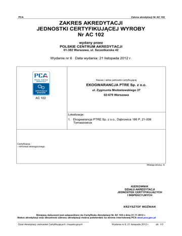 PCA Zakres akredytacji Nr AC 102 ZAKRES AKREDYTACJI JEDNOSTKI CERTYFIKUJĄCEJ WYROBY Nr AC 102 wydany przez POLSKIE CENTRUM AKREDYTACJI 01-382 Warszawa, ul. Szczotkarska 42 Wydanie nr 6 Data wydania: 21 listopada 2012 r. Nazwa i adres jednostki certyfikującej EKOGWARANCJA PTRE Sp. z o.o. ul. Zygmunta Modzelewskiego 27 02-679 Warszawa AC 102 Lokalizacje: 1. Ekogwarancja PTRE Sp. z o.o., Dąbrowica 185 P, 21-008 Tomaszowice Certyfikacja : - rolnictwa ekologicznego Wersja strony: A KIEROWNIK DZIAŁU AKREDYTACJI JEDNOSTEK CERTYFIKUJĄCYCH I INSPEKCYJNYCH KRZYSZTOF WOŹNIAK Niniejszy dokument jest załącznikiem do Certyfikatu Akredytacji Nr AC 102 z dnia 21.11.2012 r. Status akredytacji oraz aktualność zakresu akredytacji można potwierdzić na stronie internetowej PCA www.pca.gov.pl Dział Akredytacji Jednostek Certyfikujących i Inspekcyjnych Wydanie nr 6, 21 listopada 2012 r. str. 1/3 PCA Zakres akredytacji Nr AC 102 Rodzaj działalności: Dokument odniesienia: CERTYFIKACJA ROLNICTWA EKOLOGICZNEGO Rozporządzenie Rady (WE) nr 834/2007 z dnia 28 czerwca 2007 r. Nr Grupy produktów/ działalność 1. Ekologiczna uprawa roślin i utrzymanie zwierząt; 2. Zbiór ze stanu naturalnego; 3. Pszczelarstwo; 4. Produkty z akwakultury i wodorosty morskie; 4.1 Wodorosty morskie i produkty z wodorostów morskich 4.2 Zwierzęta akwakultury i produkty zwierzęce akwakultury 5. Produkty przetworzone 5.1 Przetwórstwo produktów ekologicznych oraz produkcja pasz i drożdży 6. Wprowadzanie na rynek produktów ekologicznych, w tym importowanych z krajów trzecich. Wersja strony: A Dział Akredytacji Jednostek Certyfikujących i Inspekcyjnych Wydanie nr 6, 21 listopada 2012 r. str. 2/3 PCA Zakres akredytacji Nr AC 102 Wykaz zmian Zakresu Akredytacji Nr AC 102 Status zmian: wersja pierwotna – A Zatwierdzam status zmian KIEROWNIK DZIAŁU AKREDYTACJI JEDNOSTEK CERTYFIKUJĄCYCH I INSPEKCYJNYCH KRZYSZTOF WOŹNIAK dnia: 21.11.2012 r. Dział Akredytacji Jednostek Certyfikujących i Inspekcyjnych Wydanie nr 6, 21 listopada 2012 r. str. 3/3